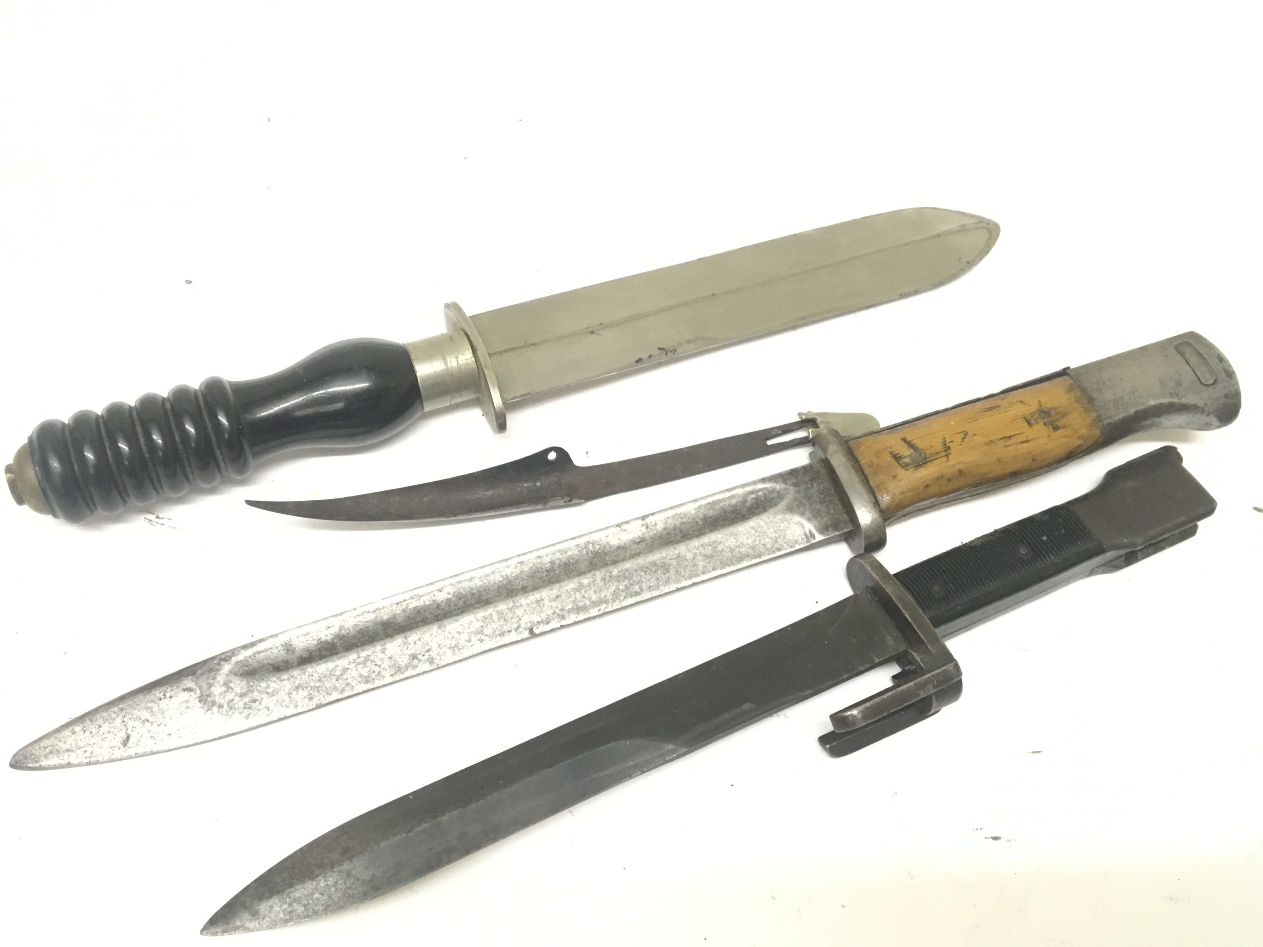 A German bayonet one other foreign bayonet an Ebony handled fighting knife no scabbards.