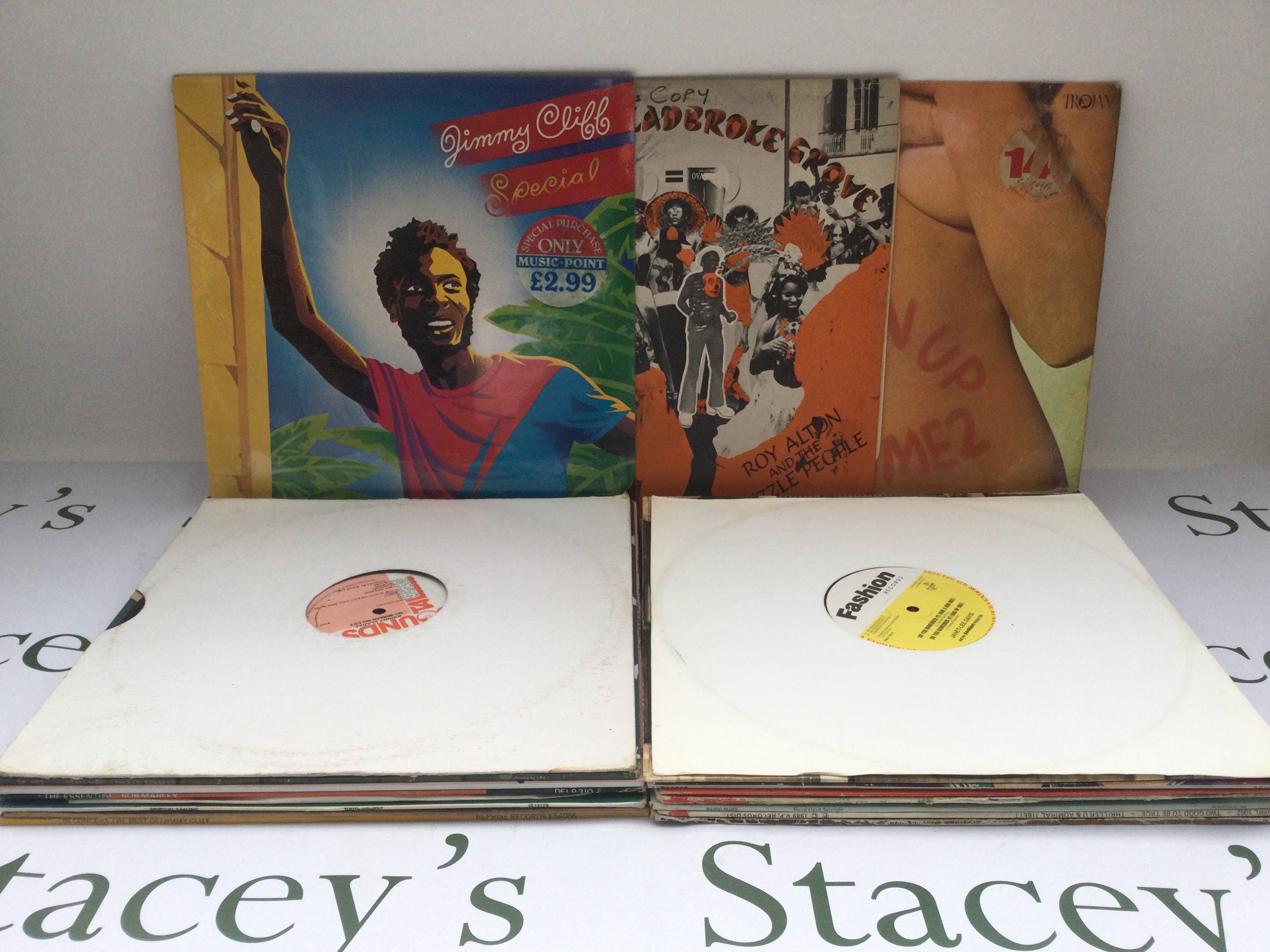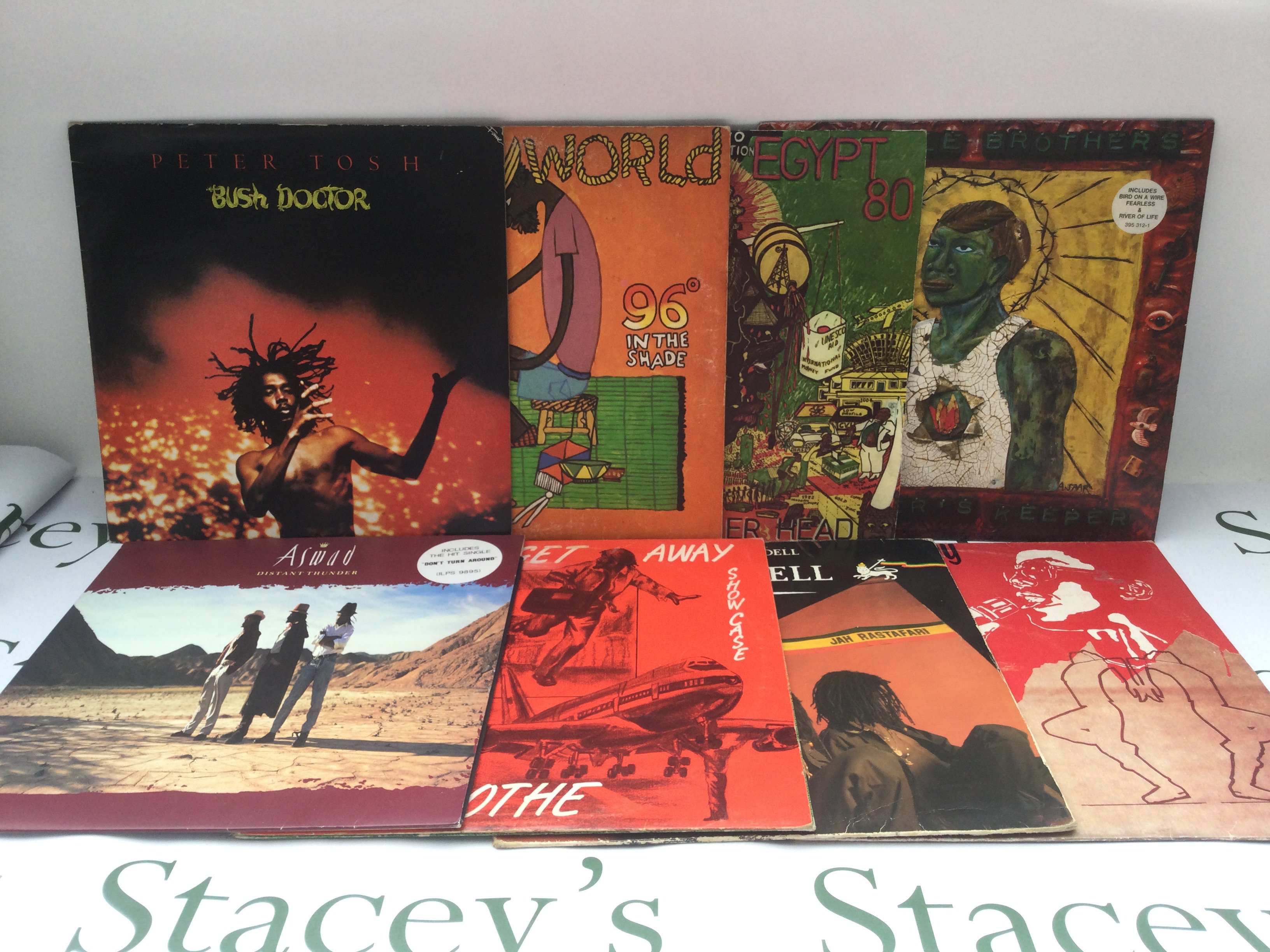 Two bags of over 30 reggae LPs and 12" singles by various artists including Bob Marley, Peter Tosh, Third World and others.