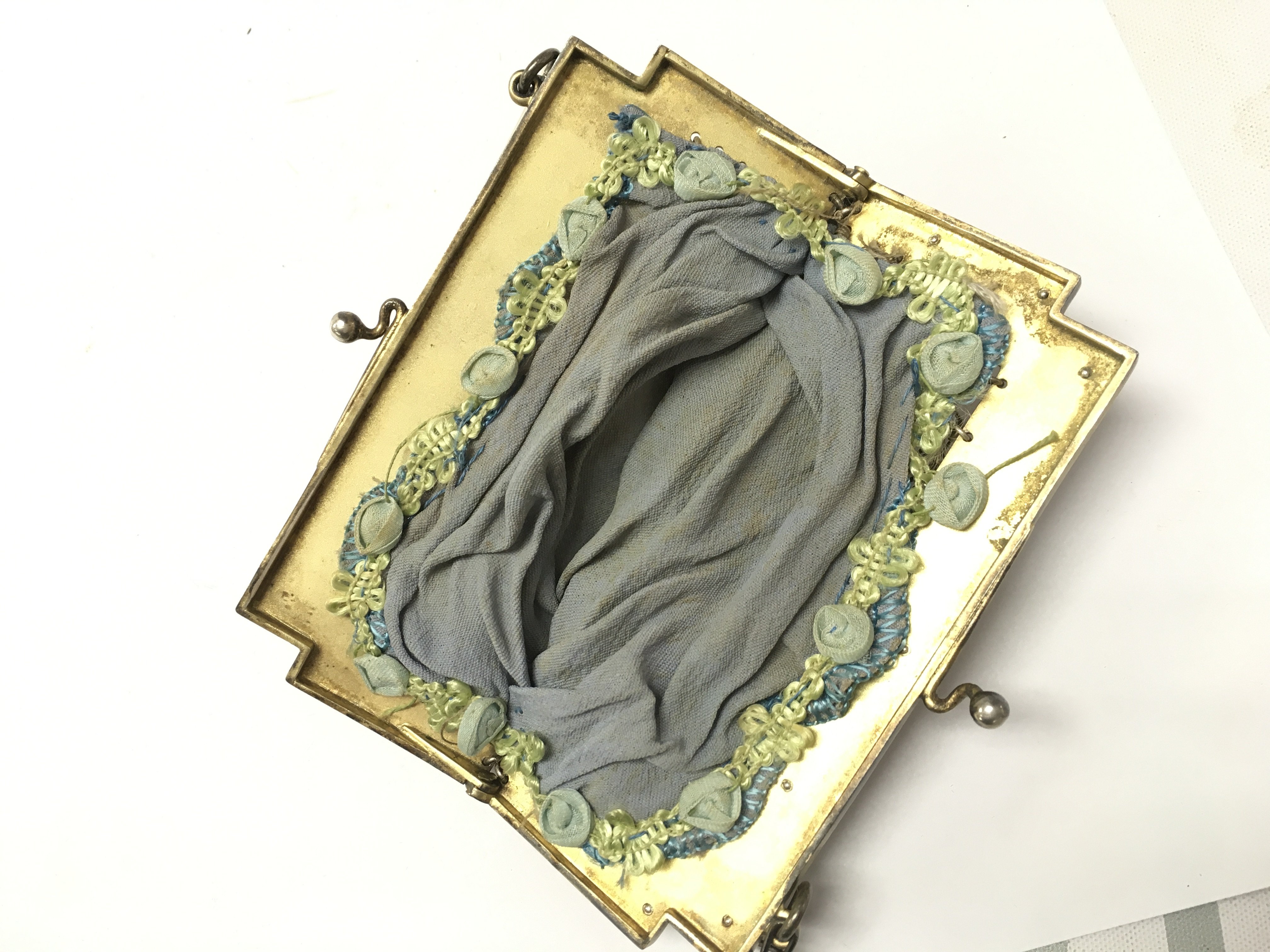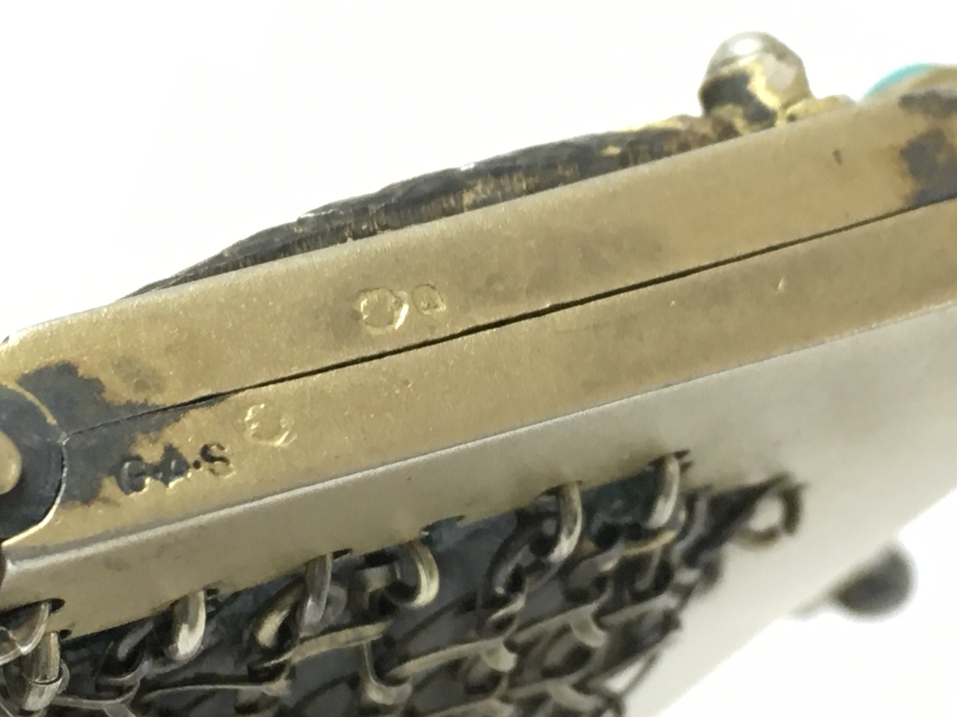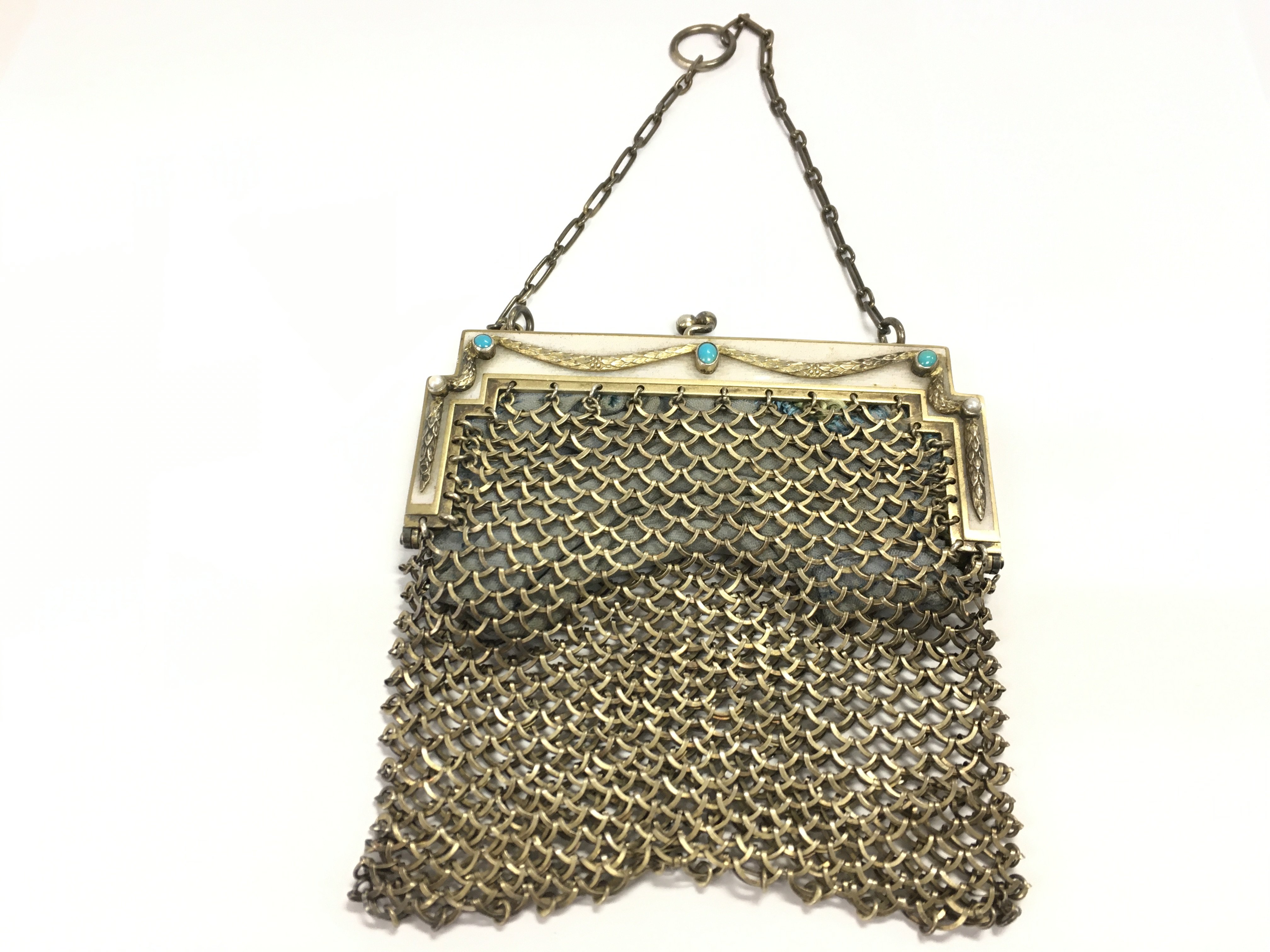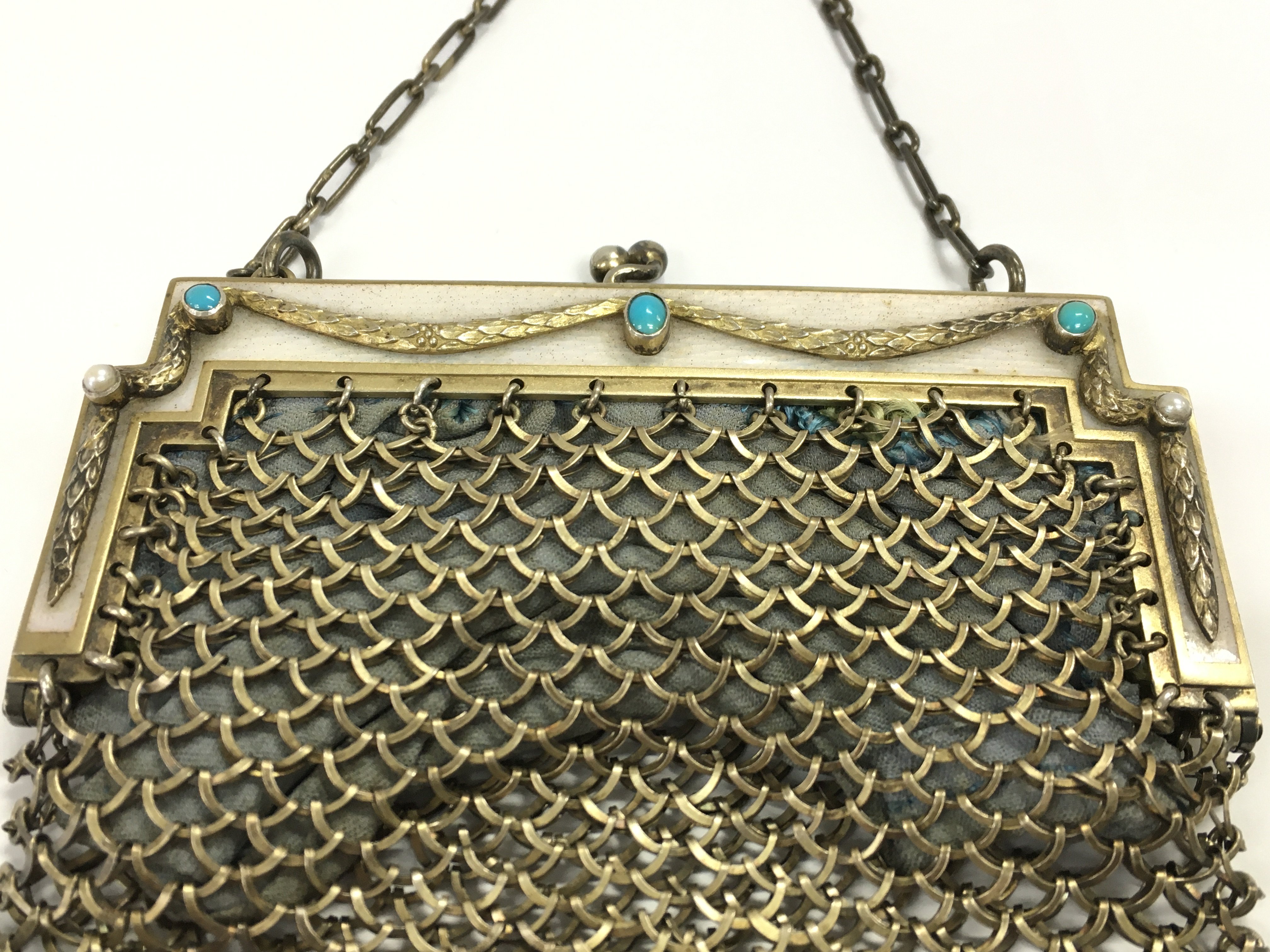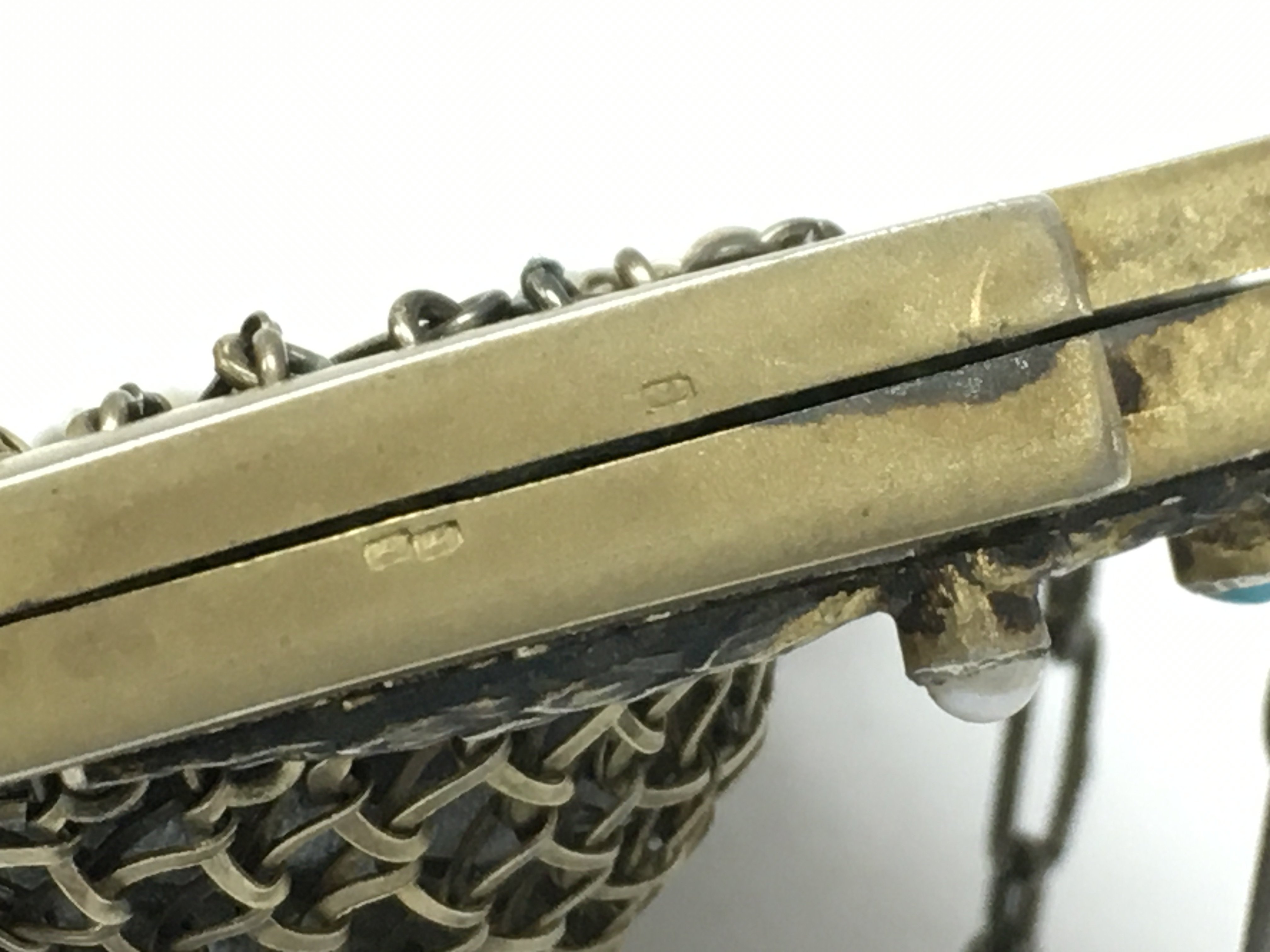 A quality silver early 20th century ladies purse with turquoise, enamel and seed pearls. 10.5cm wide. Postage A
