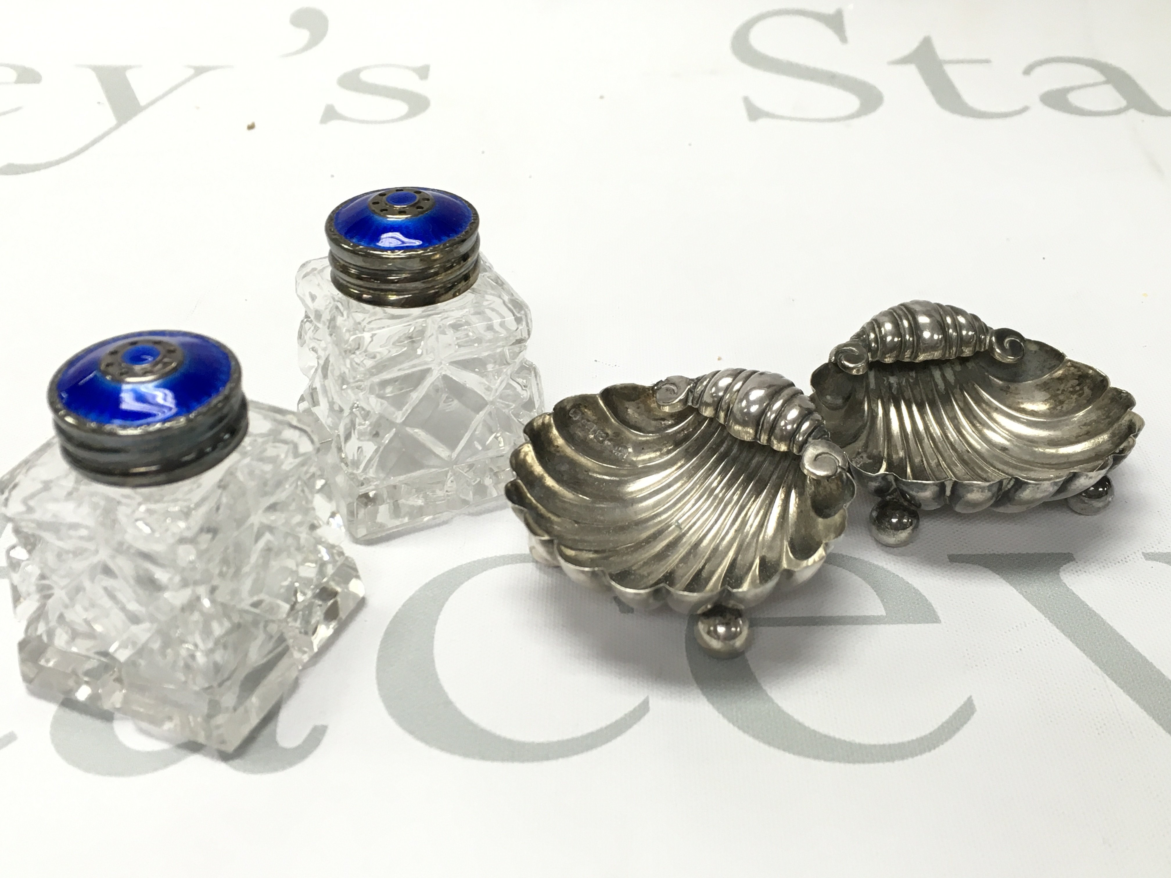 Silver and enamelled pepper pots and two silver salts, this lot cannot be posted