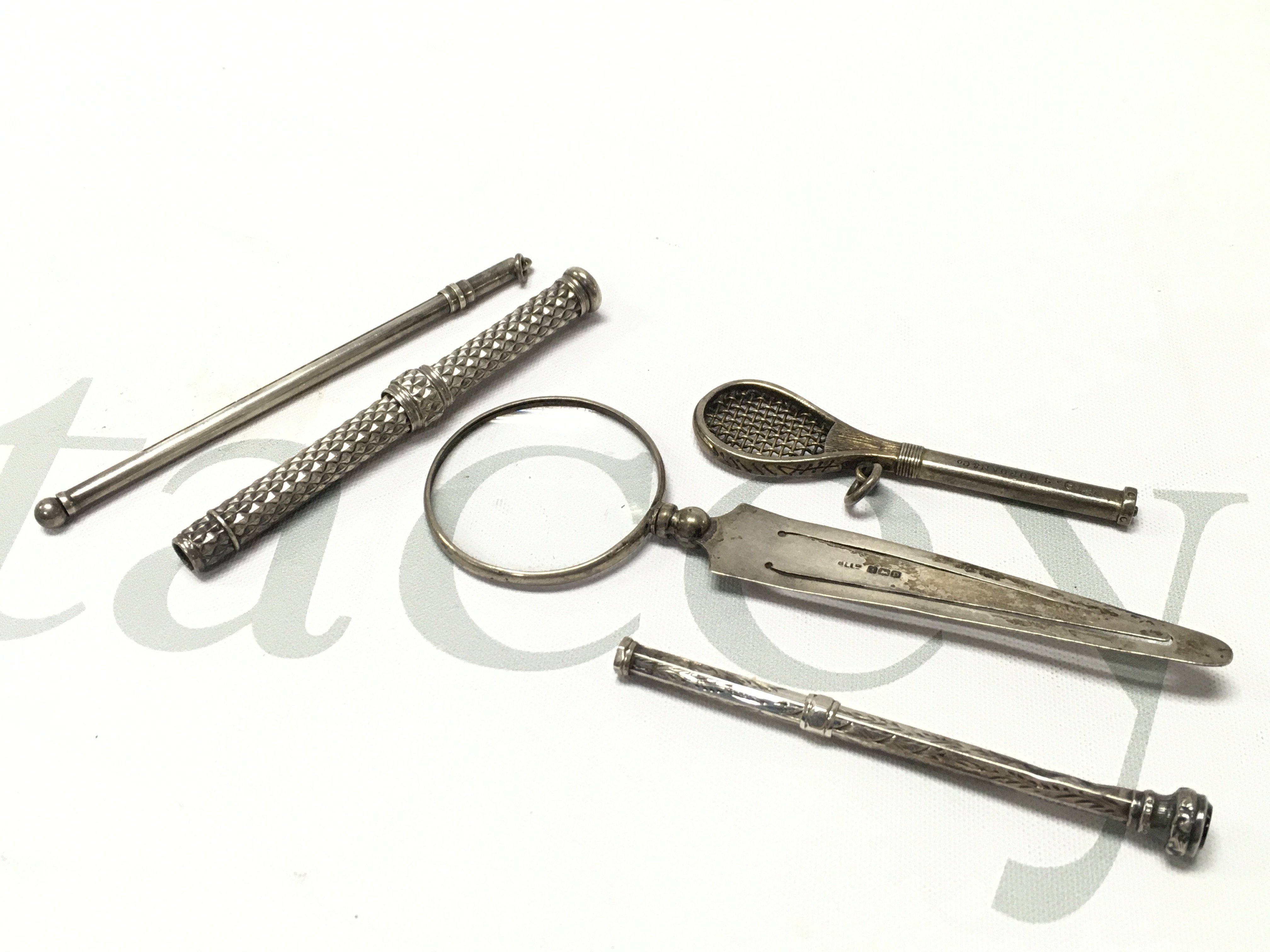 A collection of silver to include a swizzle stick, three propelling pencils two by S Mordan and co and a bookmark . Postage category A