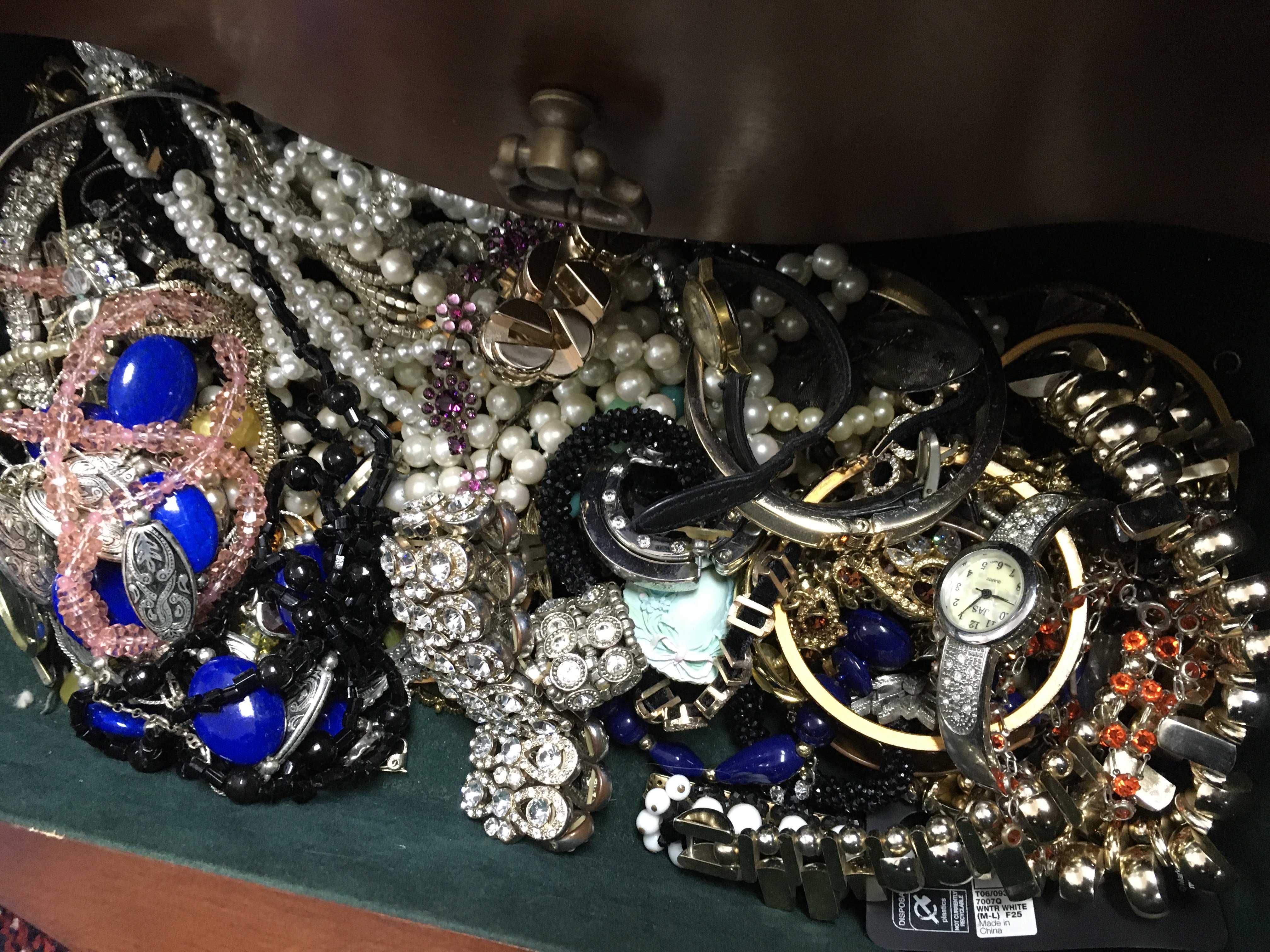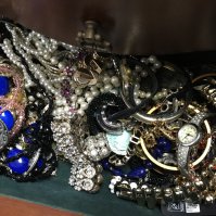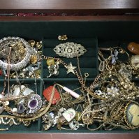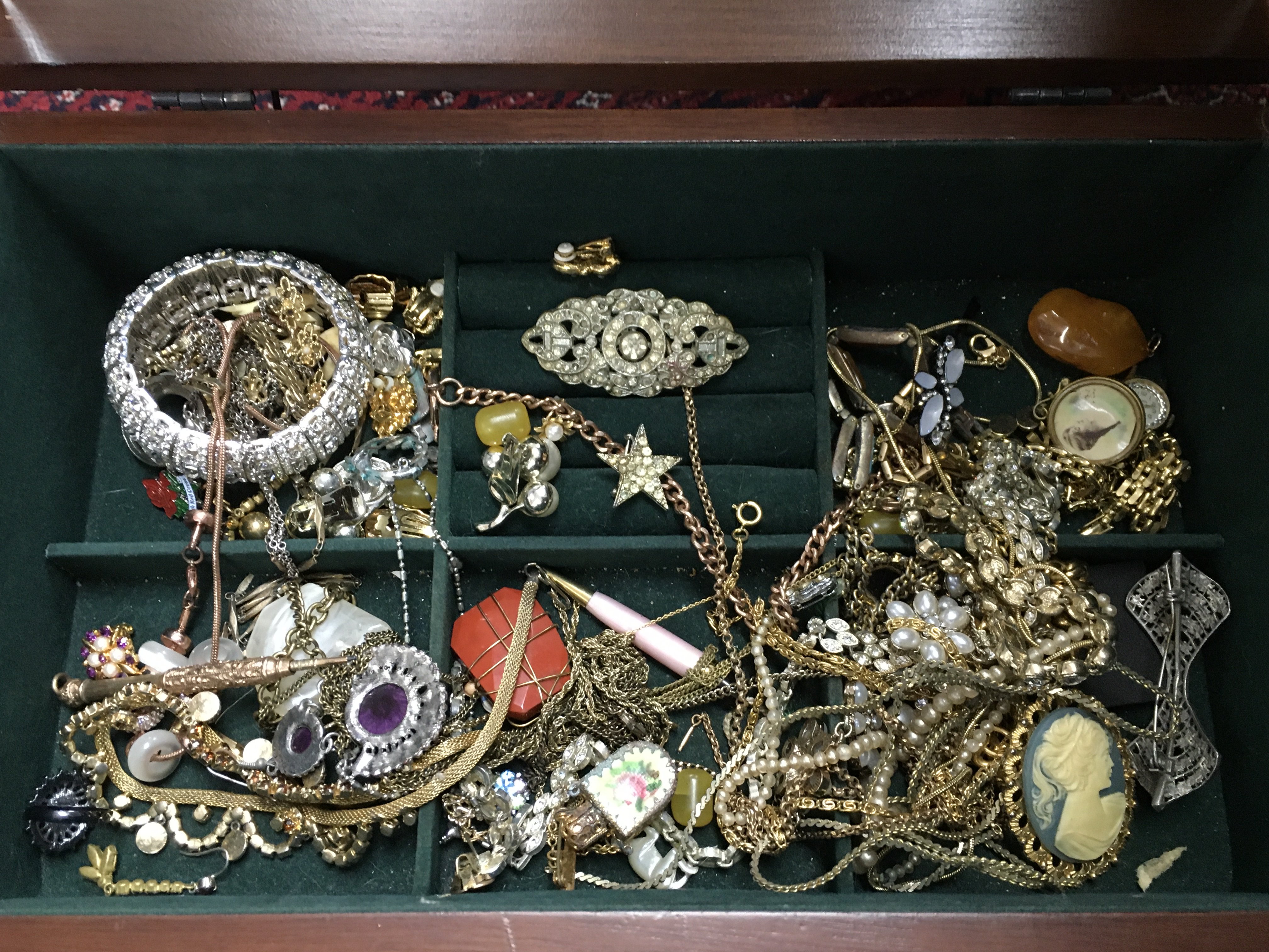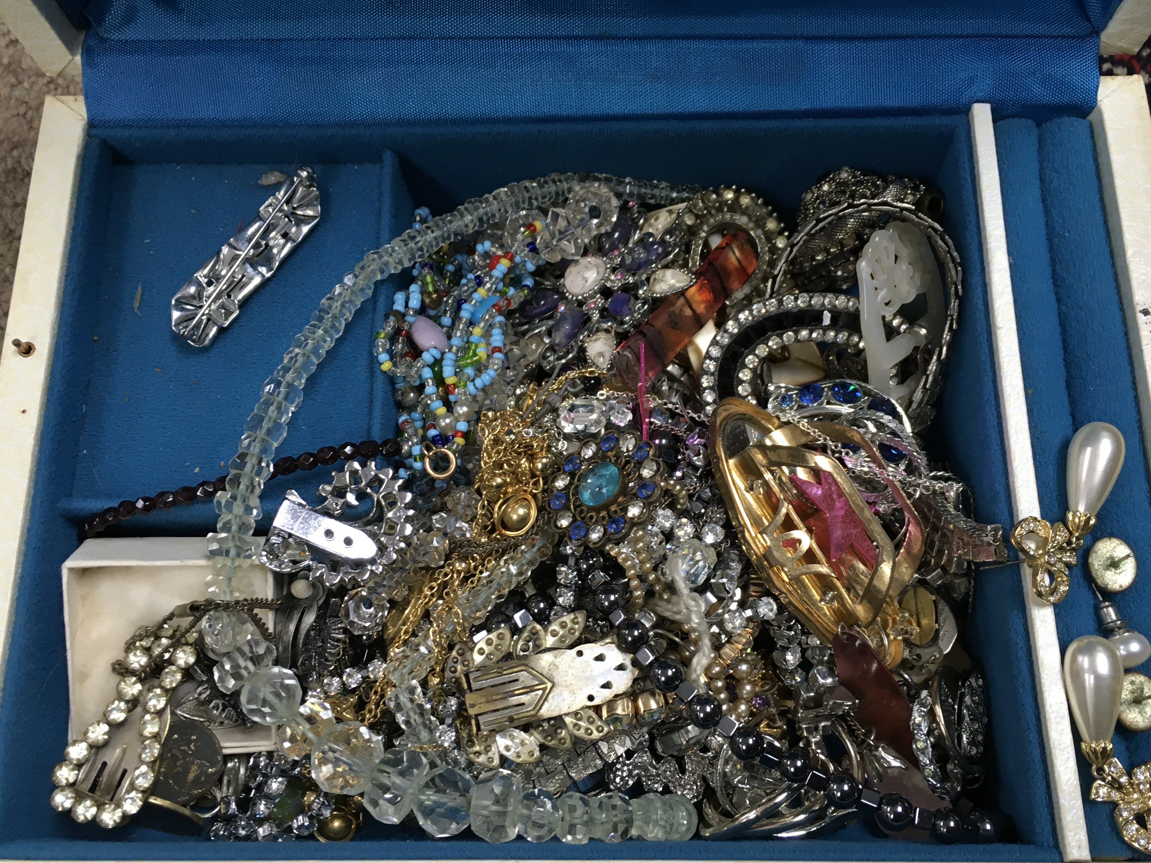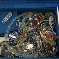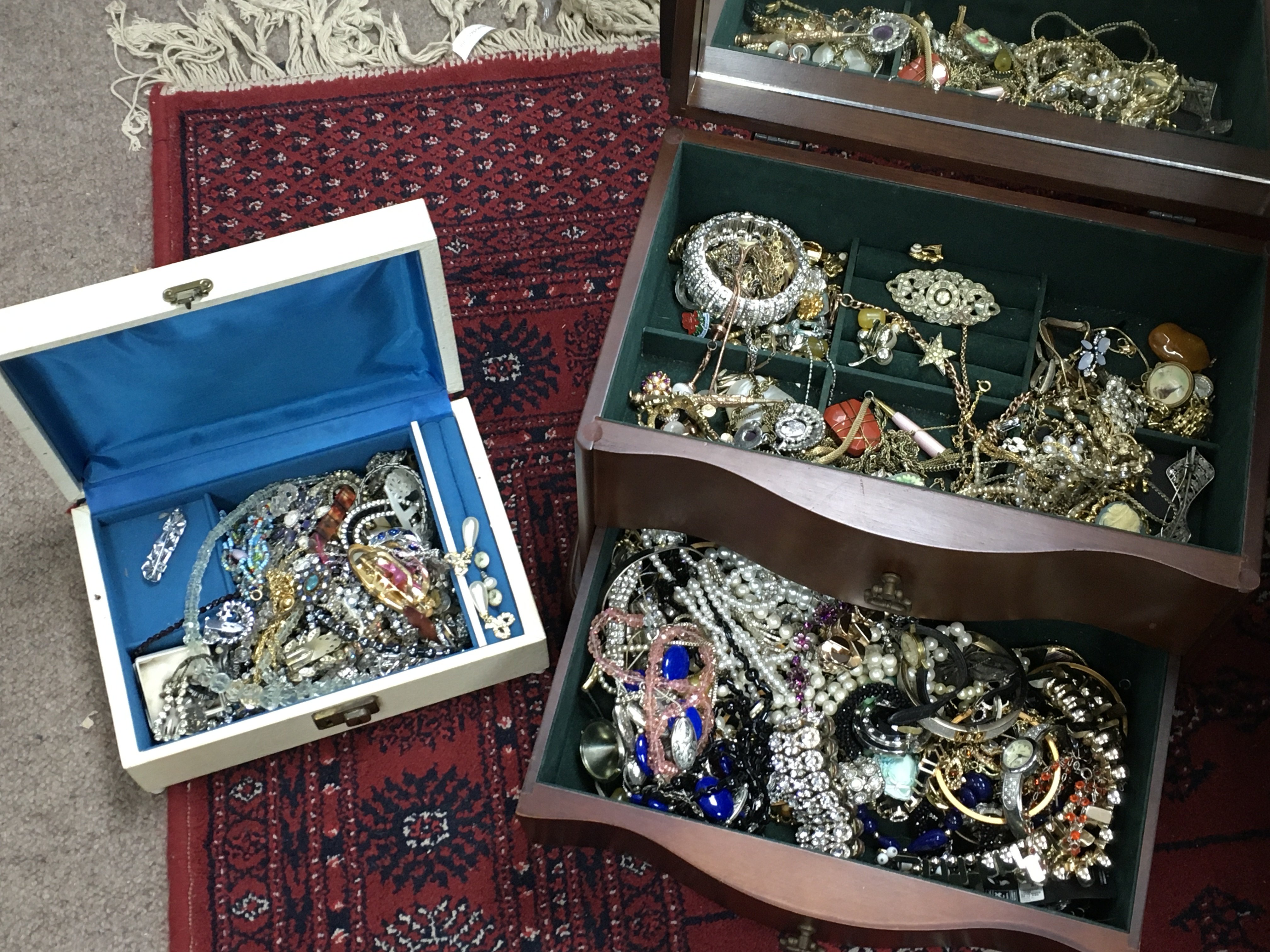 Two boxes of costume jewellery including necklaces, brooches, earrings etc. postage category C