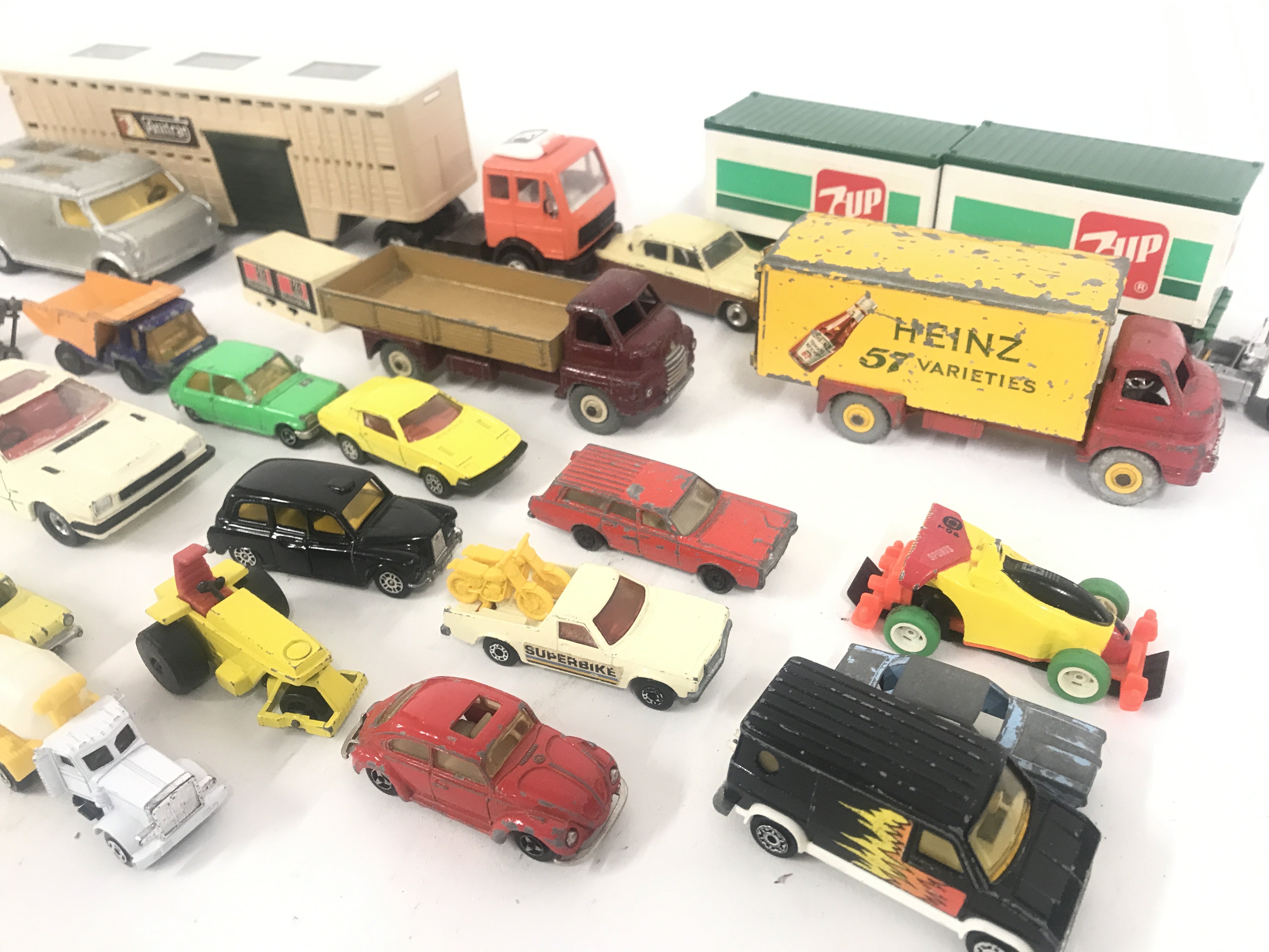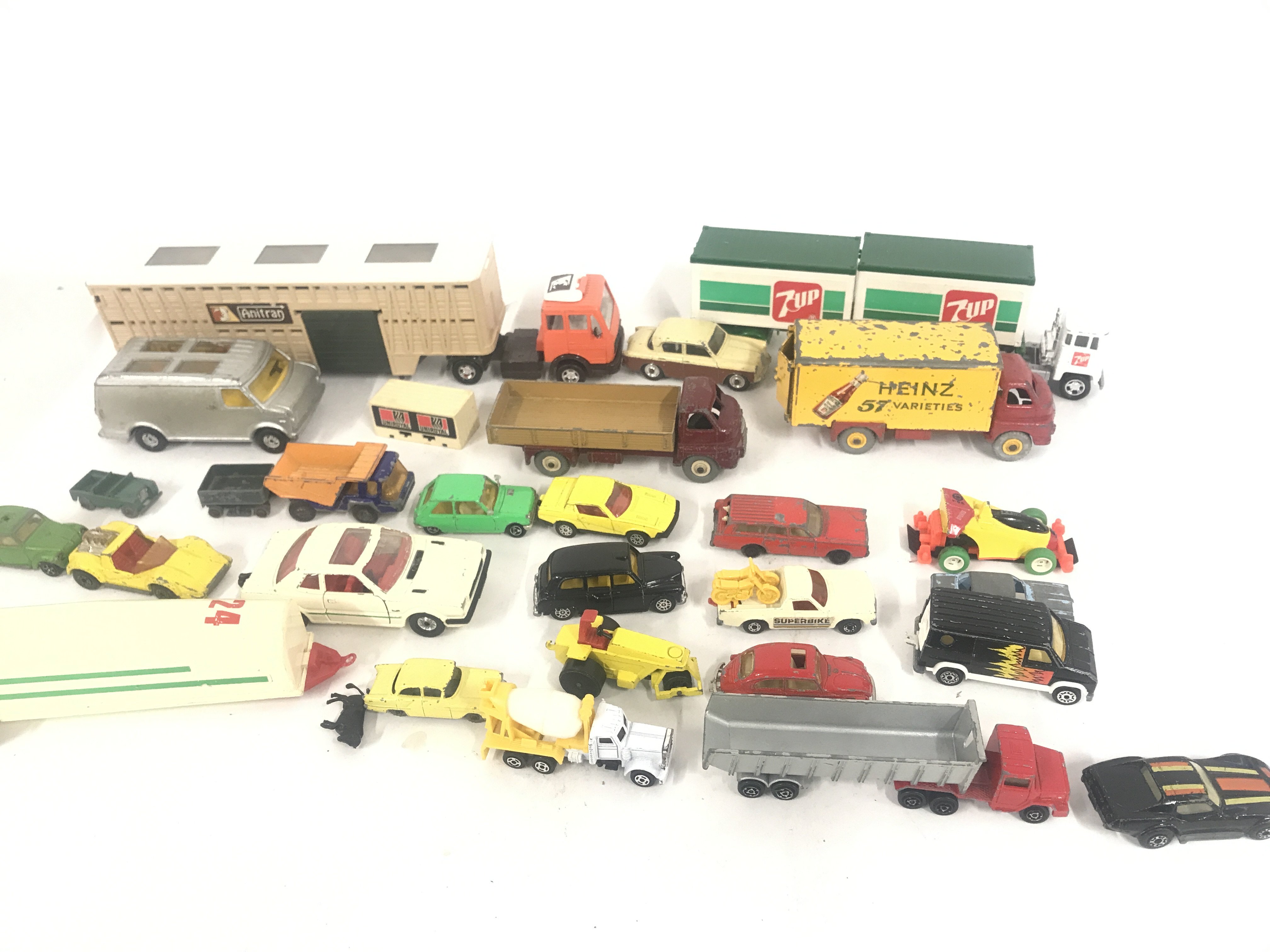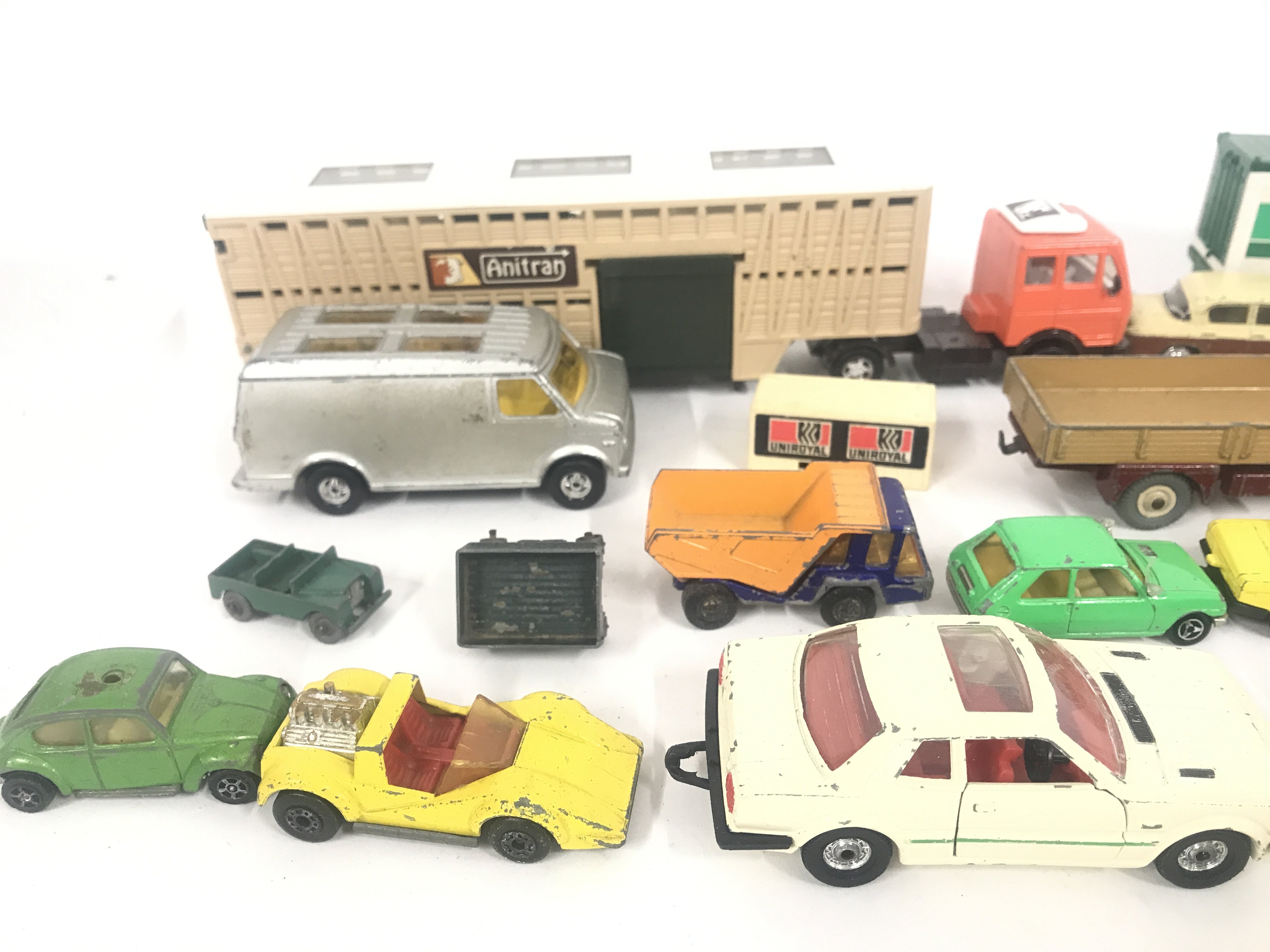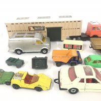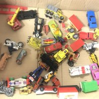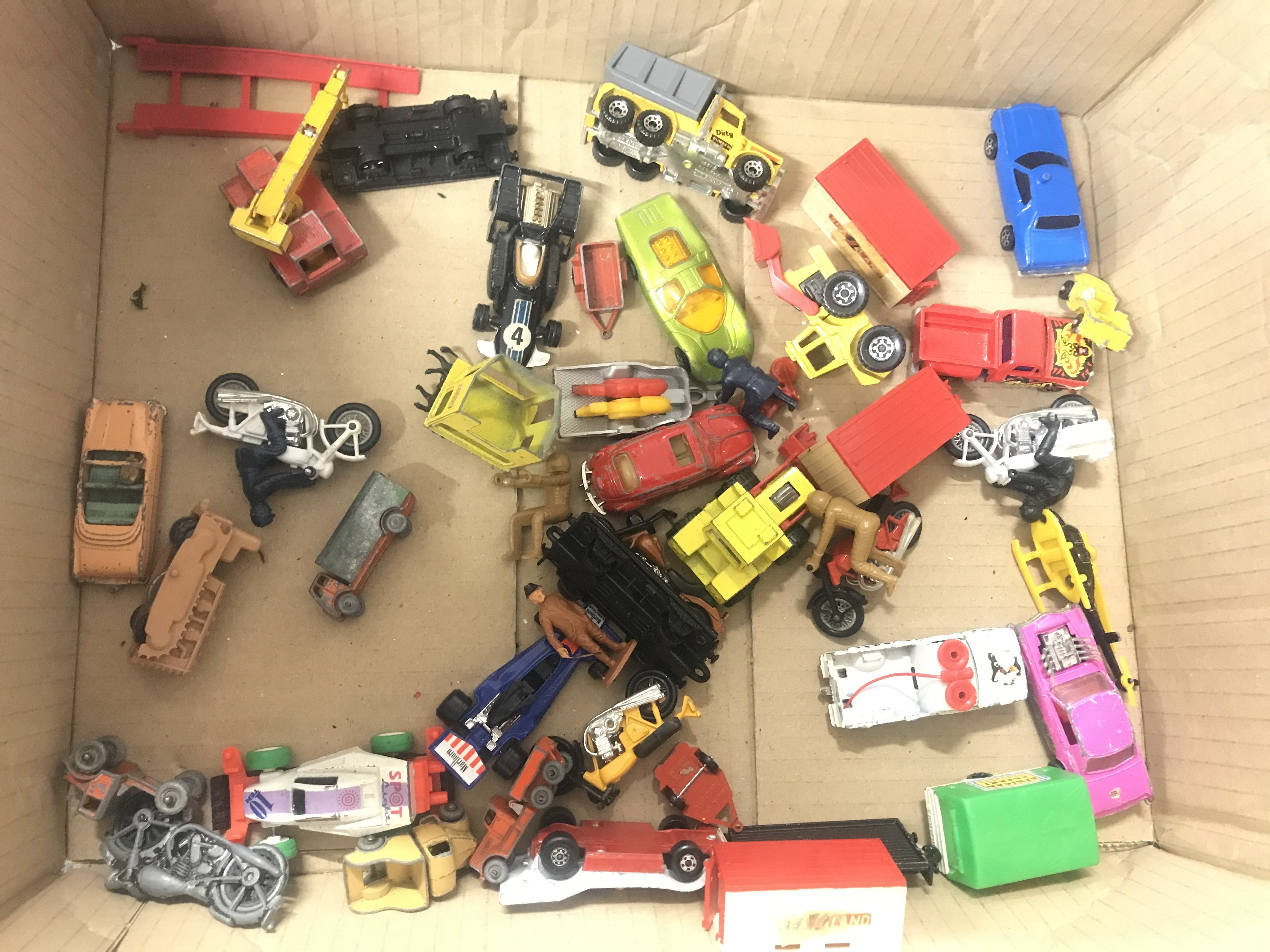 A Box Containing Playworn Plastic and Diecast Vehicles including Matchbox. Dinky. And Others. No Resrve.
