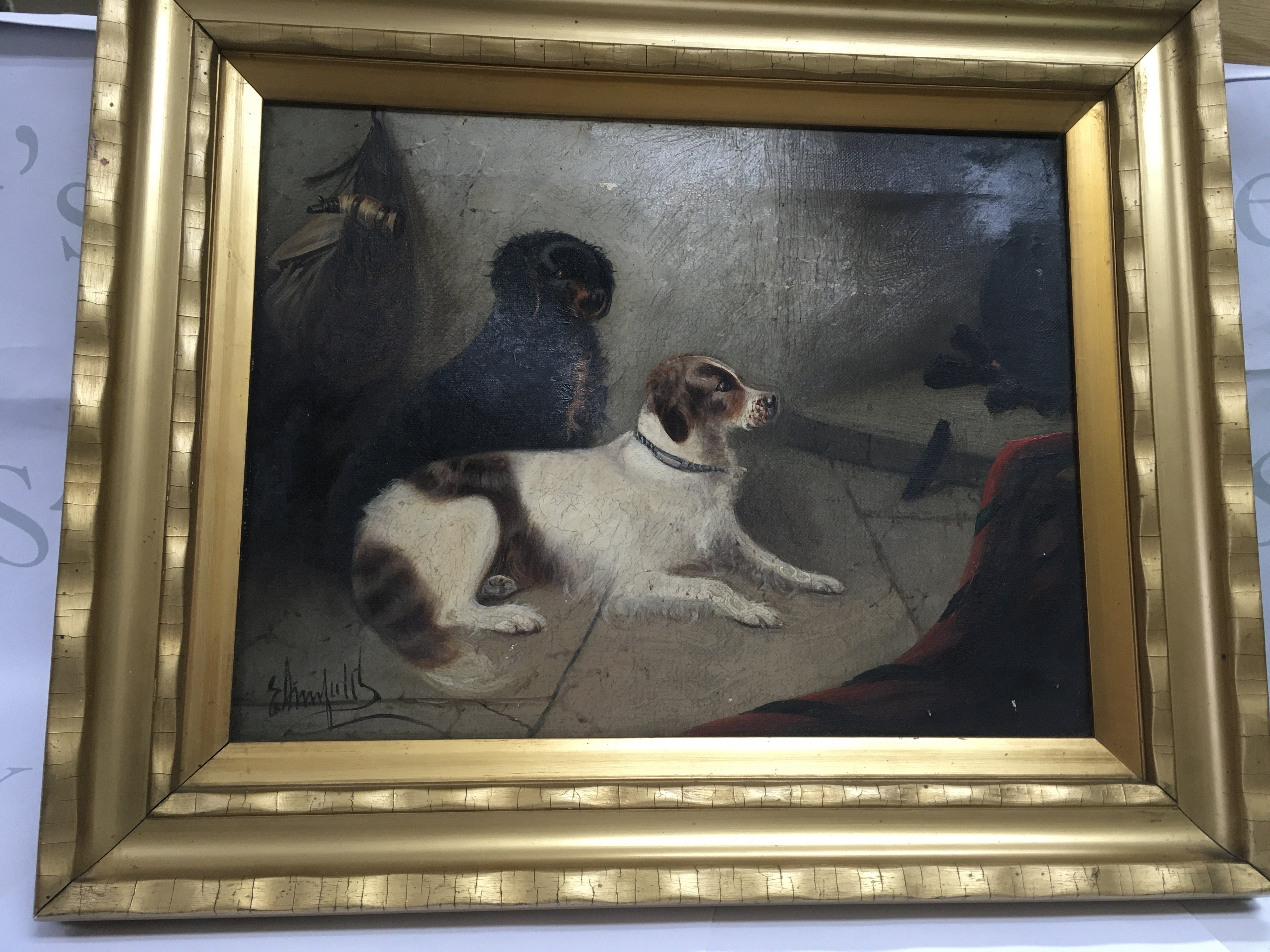 An oil painting of two dogs signed and framed, Approx size 52x43cm.