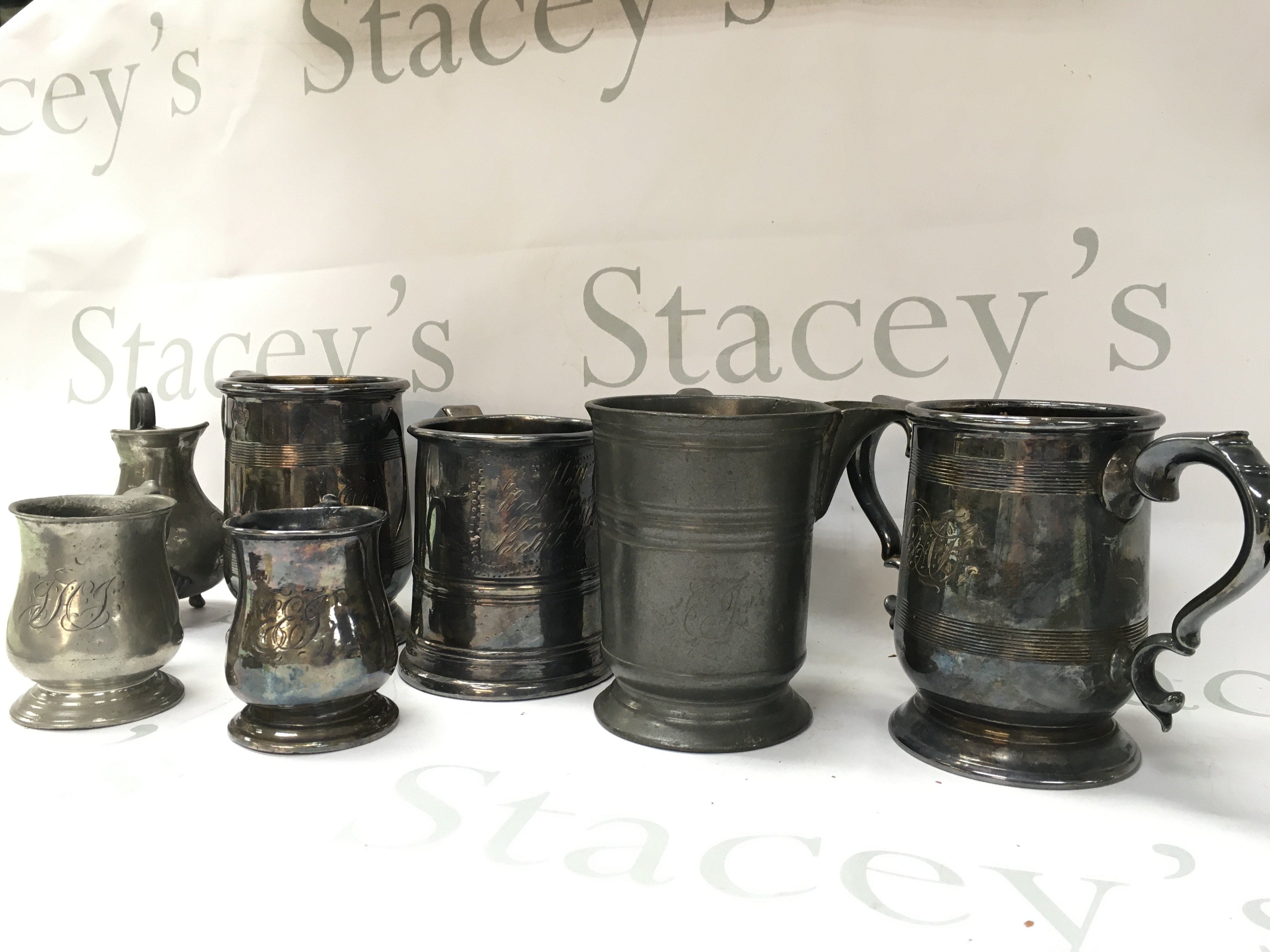 A collection of silver plate and pewter tankards including an 18th century George III pint tankard. Postage catB