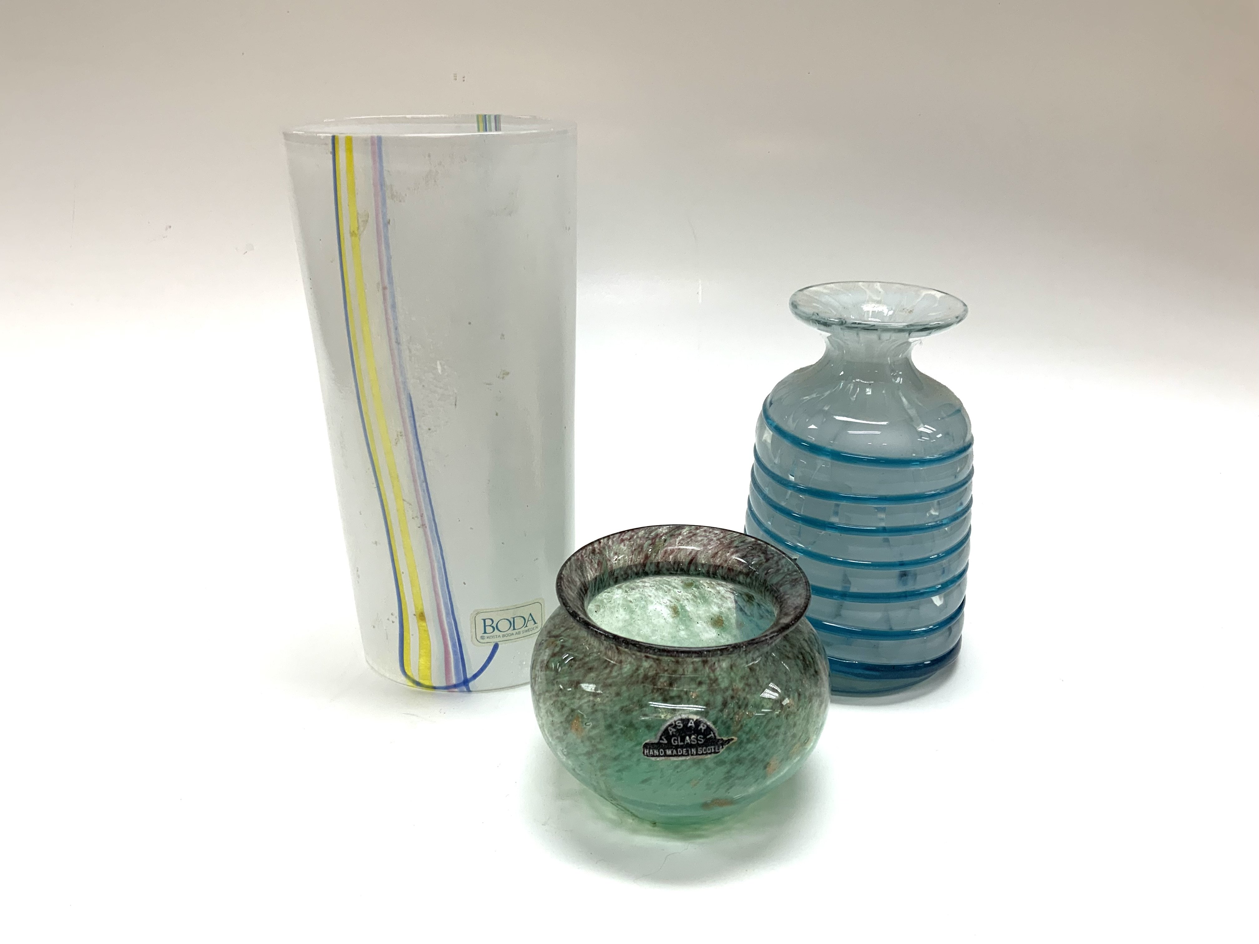 3 studio glass vases to include Kosta Boda, Vasart, Medina. (D)