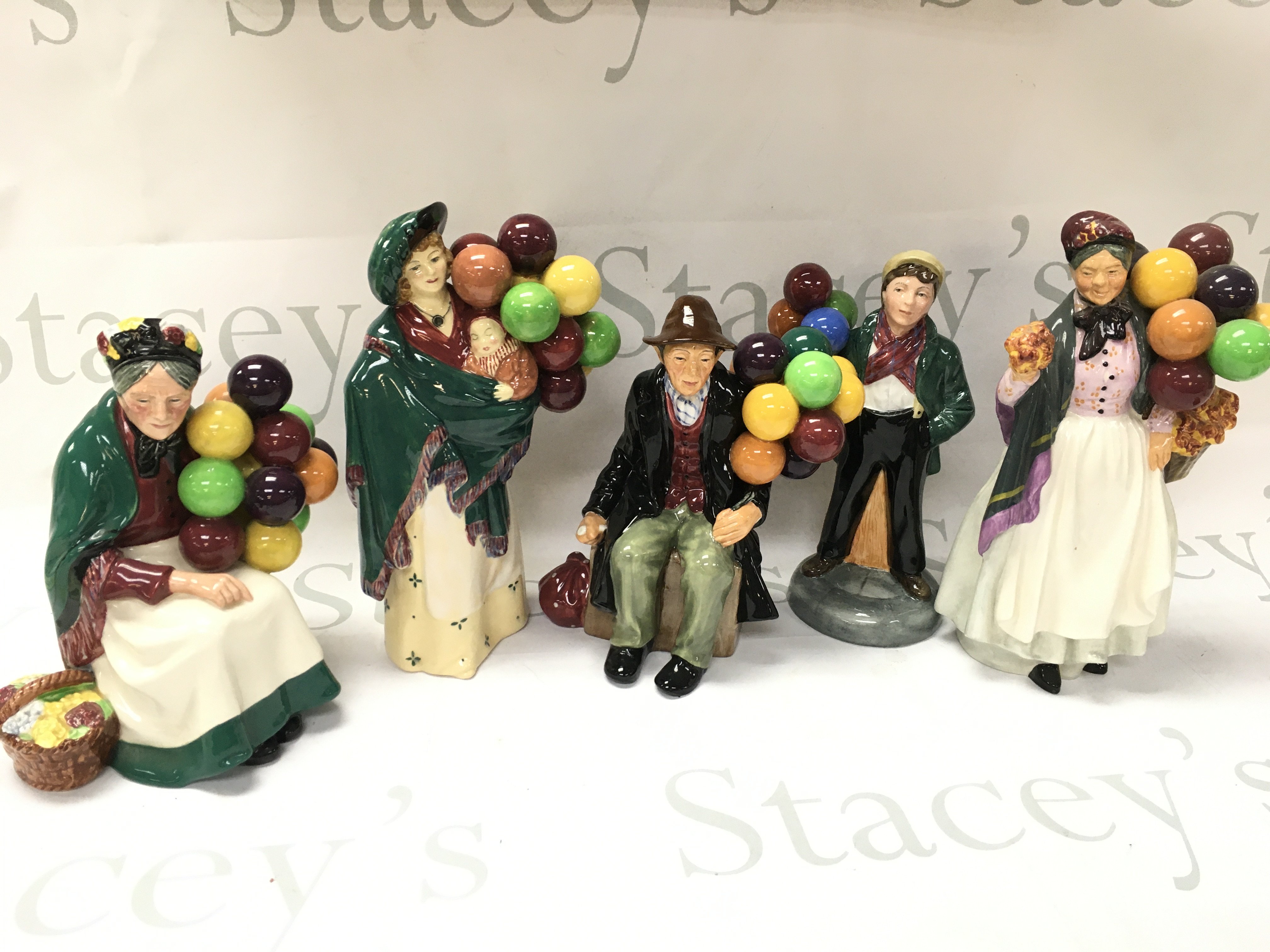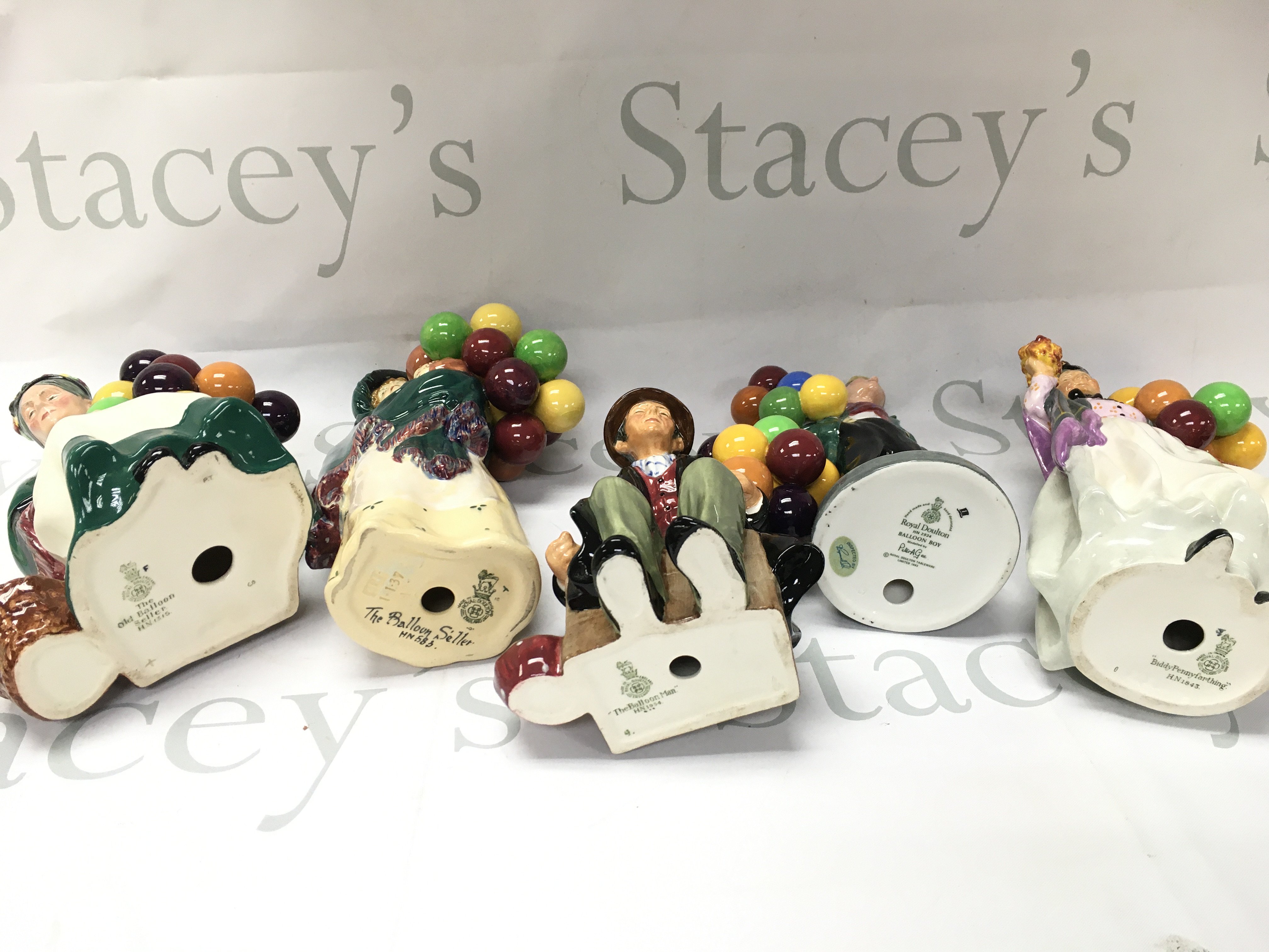 A collection of Royal Doulton balloon seller porcelain figures including The Old Balloon Seller, Balloon Boy etc. no obvious damage or restoration