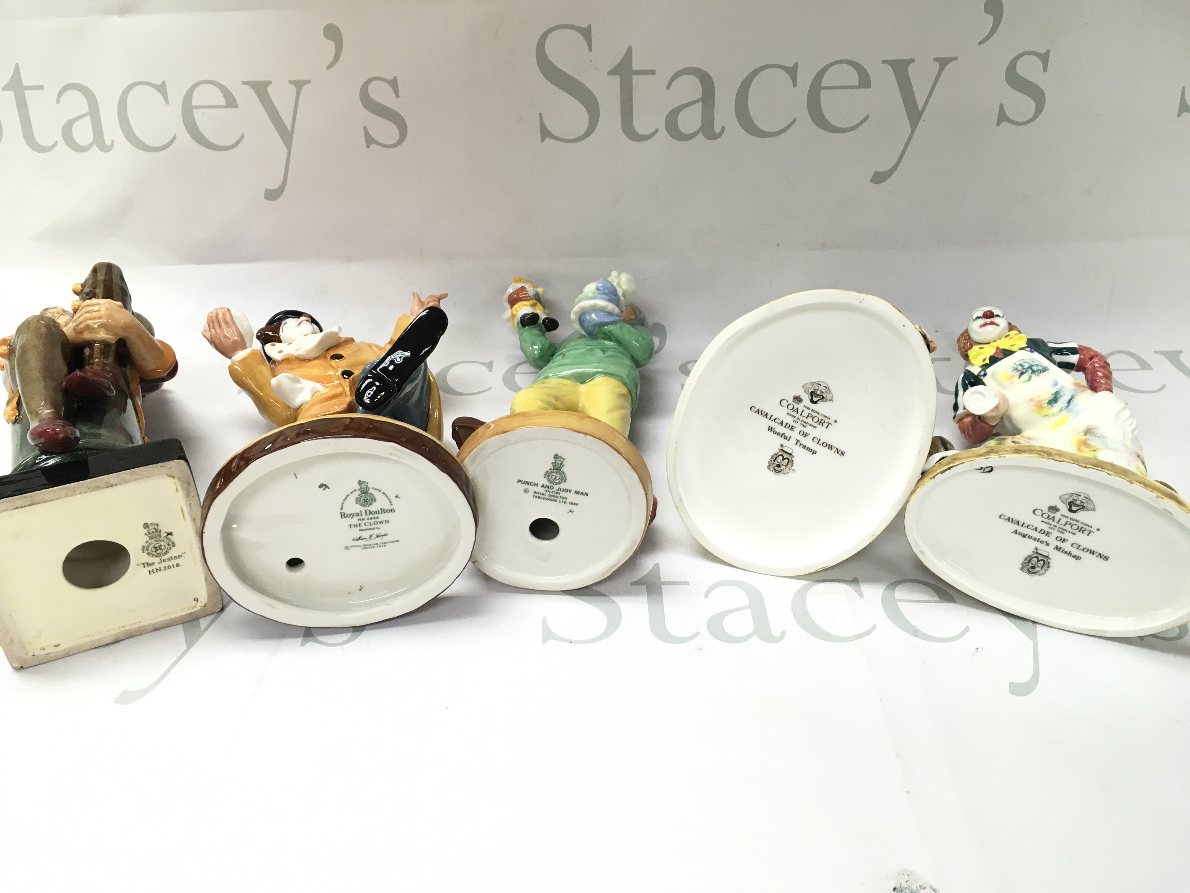 Royal Doulton porcelain figures including The Jester, The Clown, Punch and Judy man etc. no obvious damage or restoration.this lot cannot be posted