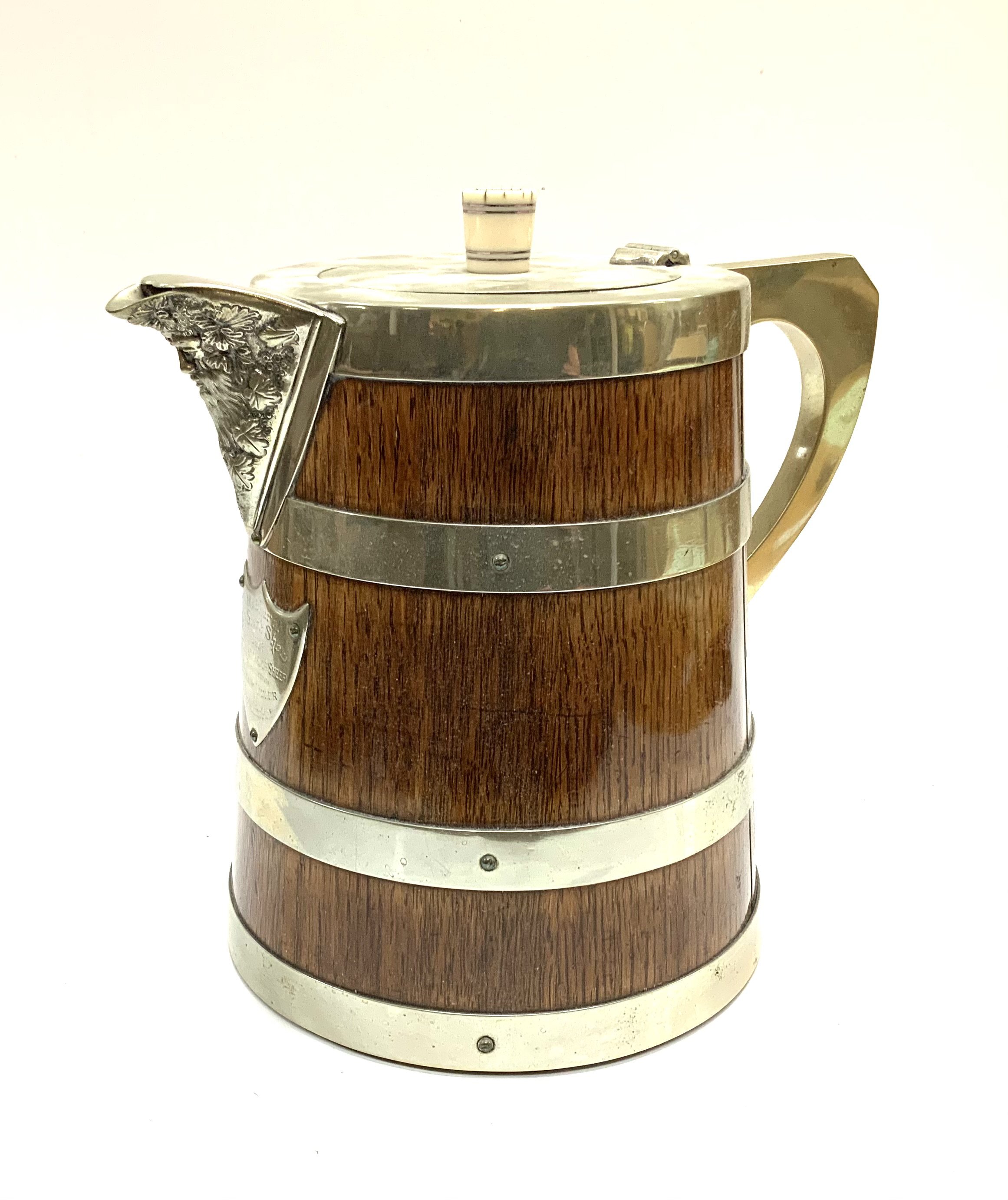 A Mappin and Webb antique oak and silvered brass water pitcher. 24cm.