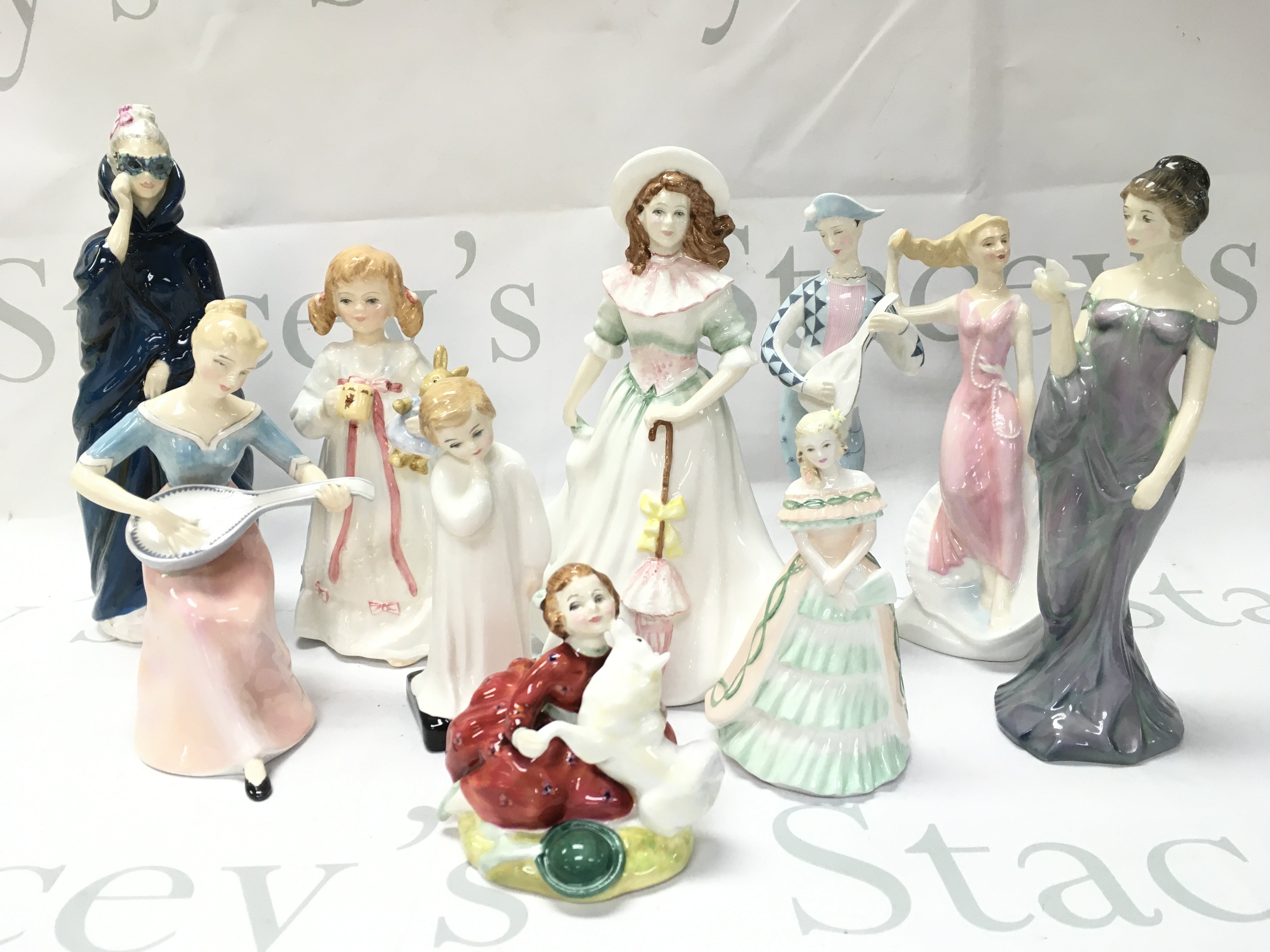 A collection of Royal Doulton porcelain figures including Melody, Harmony, Masque etc. Coalport Party time figure. No obvious damage or restoration This lot cannot be posted