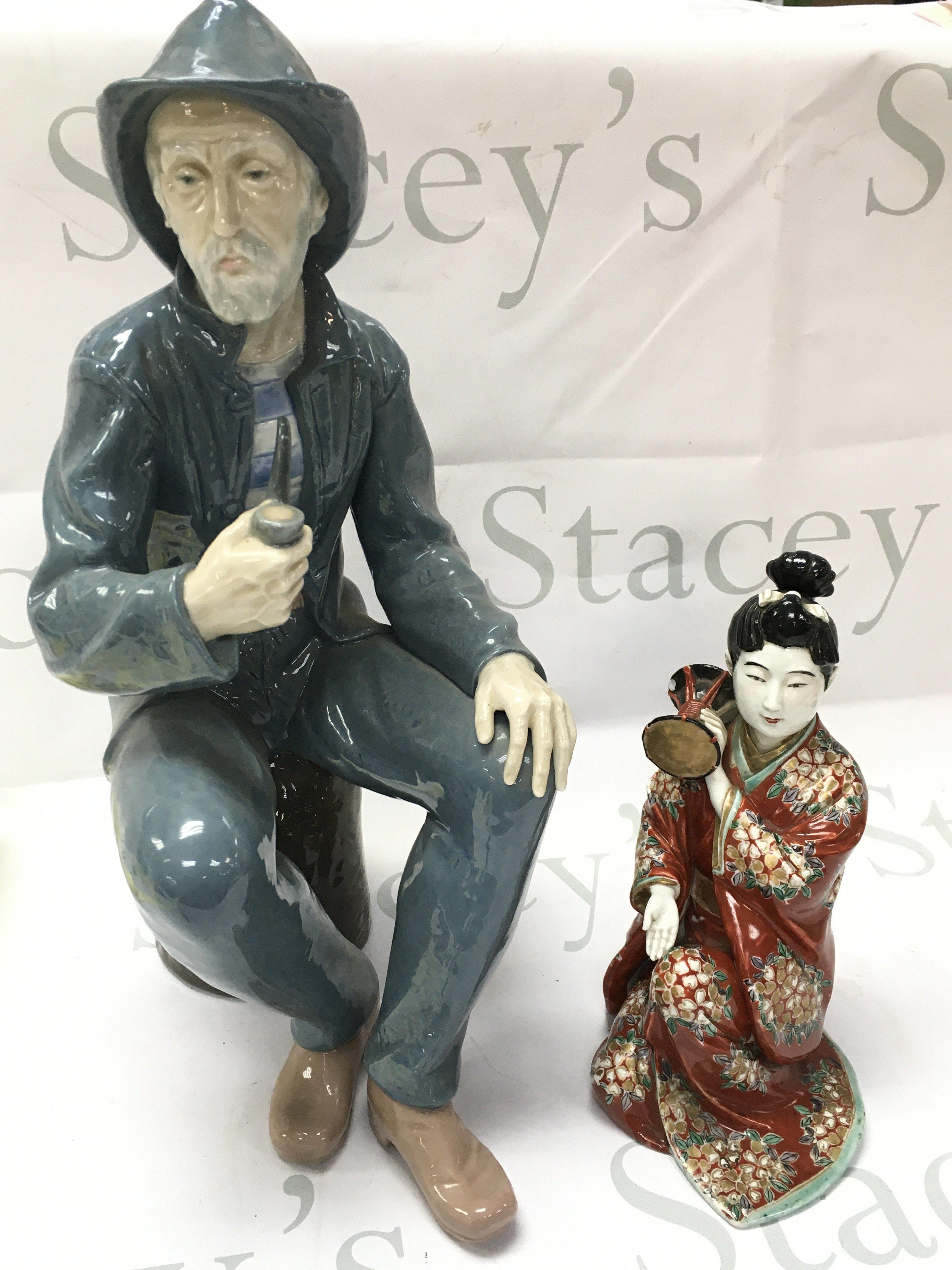 A large Nao porcelain Old Fisherman with a pipe figure and a 20th century Japanese Geisha figure. No obvious damage or restoration This lot cannot be posted