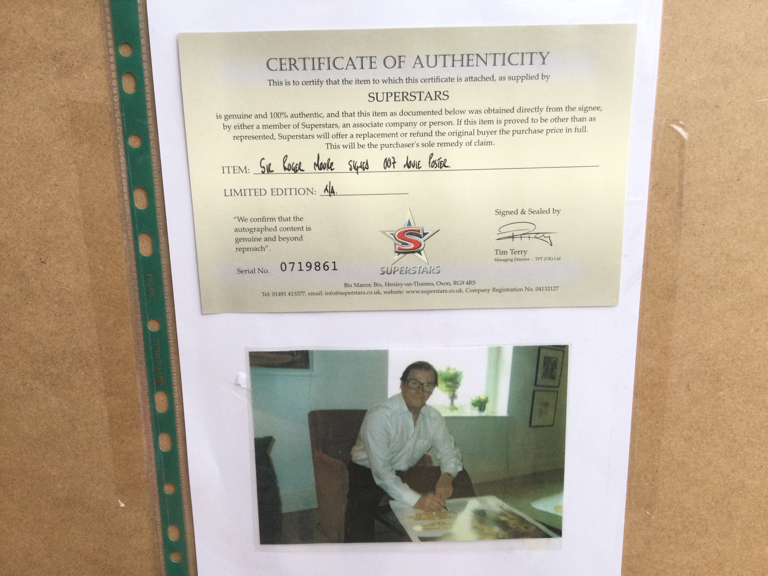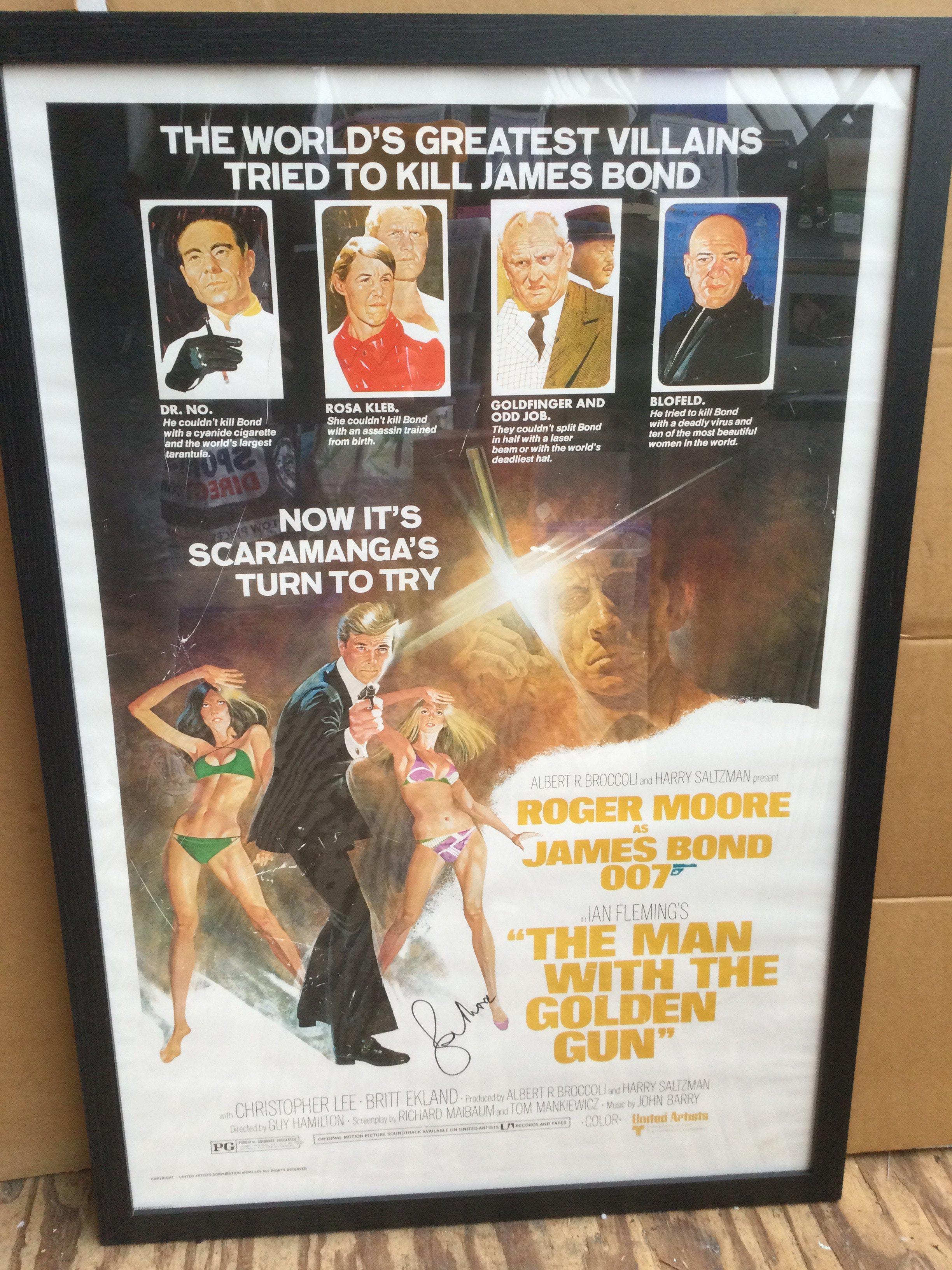 A framed and glazed James Bond film poster for 'The Man With The Golden Gun' signed by Sir Roger Moore with COA. Approx 66cm x 96cm including frame.