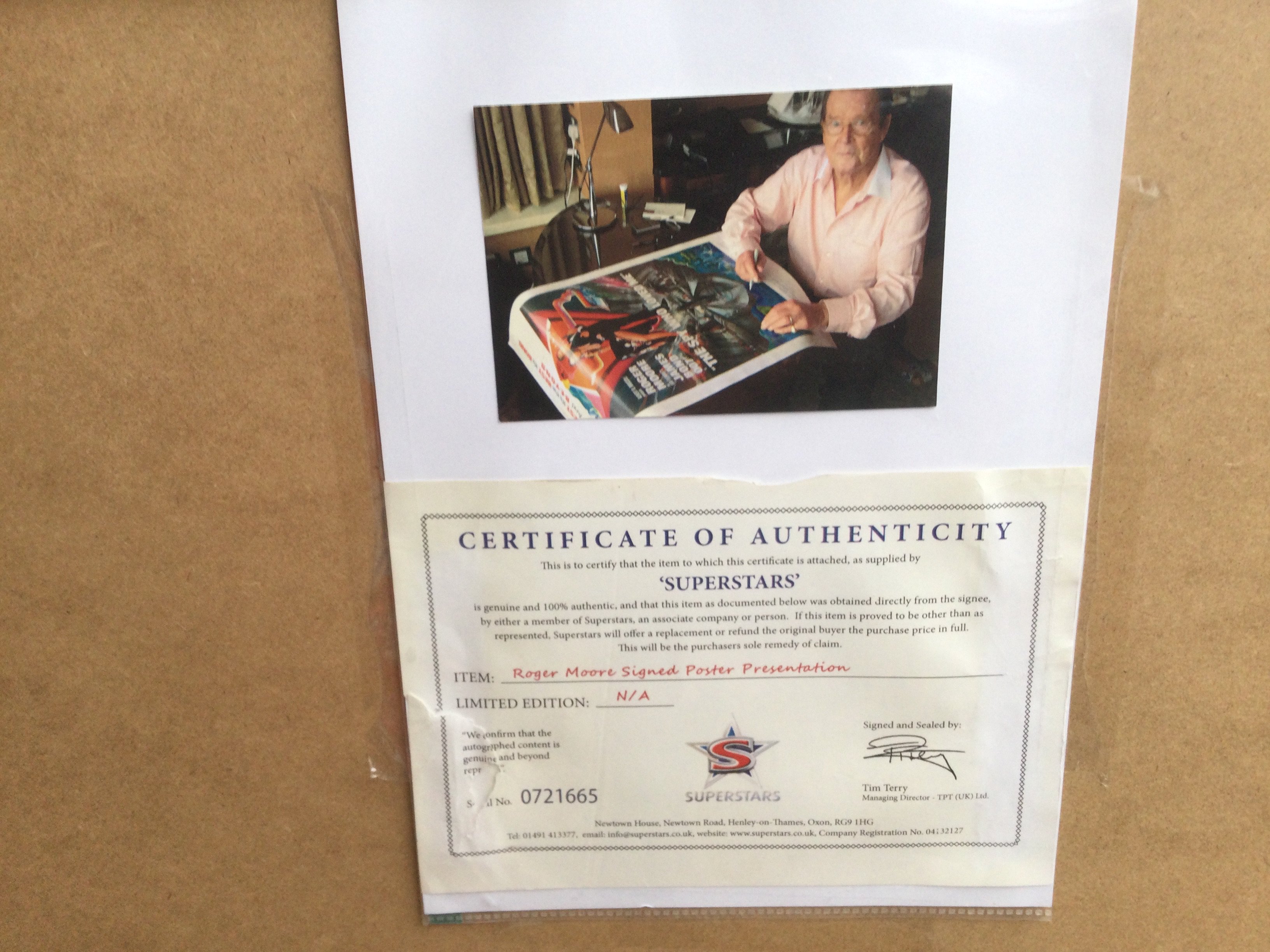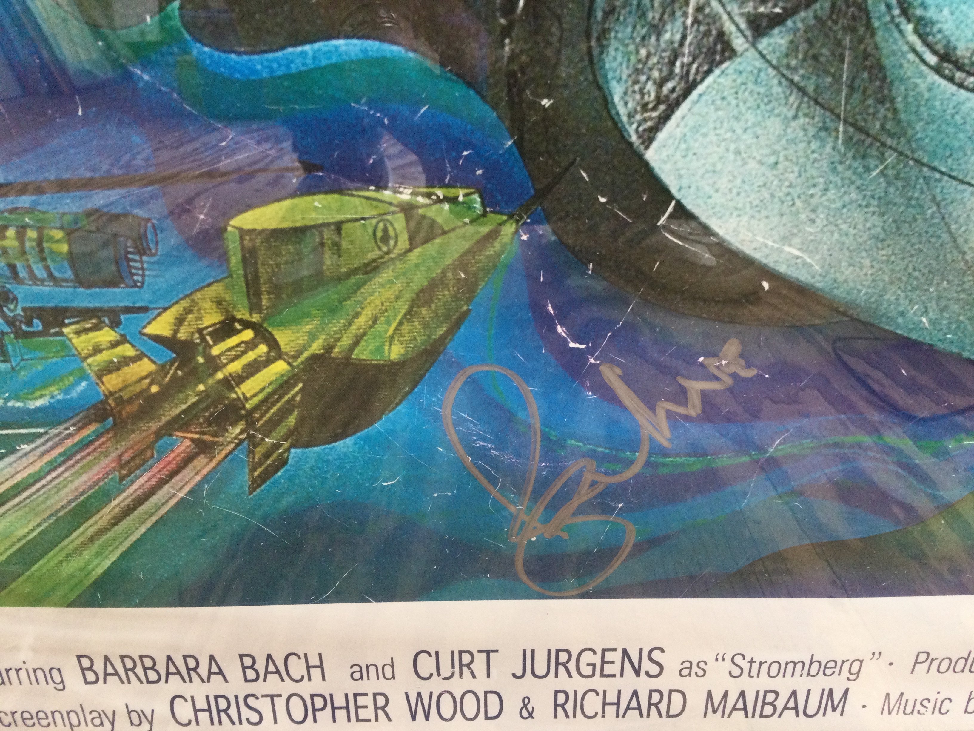 A framed and glazed James Bond film poster for 'The Spy Who Loved Me' signed by Sir Roger Moore with COA. Approx 66cm x 96cm including frame.