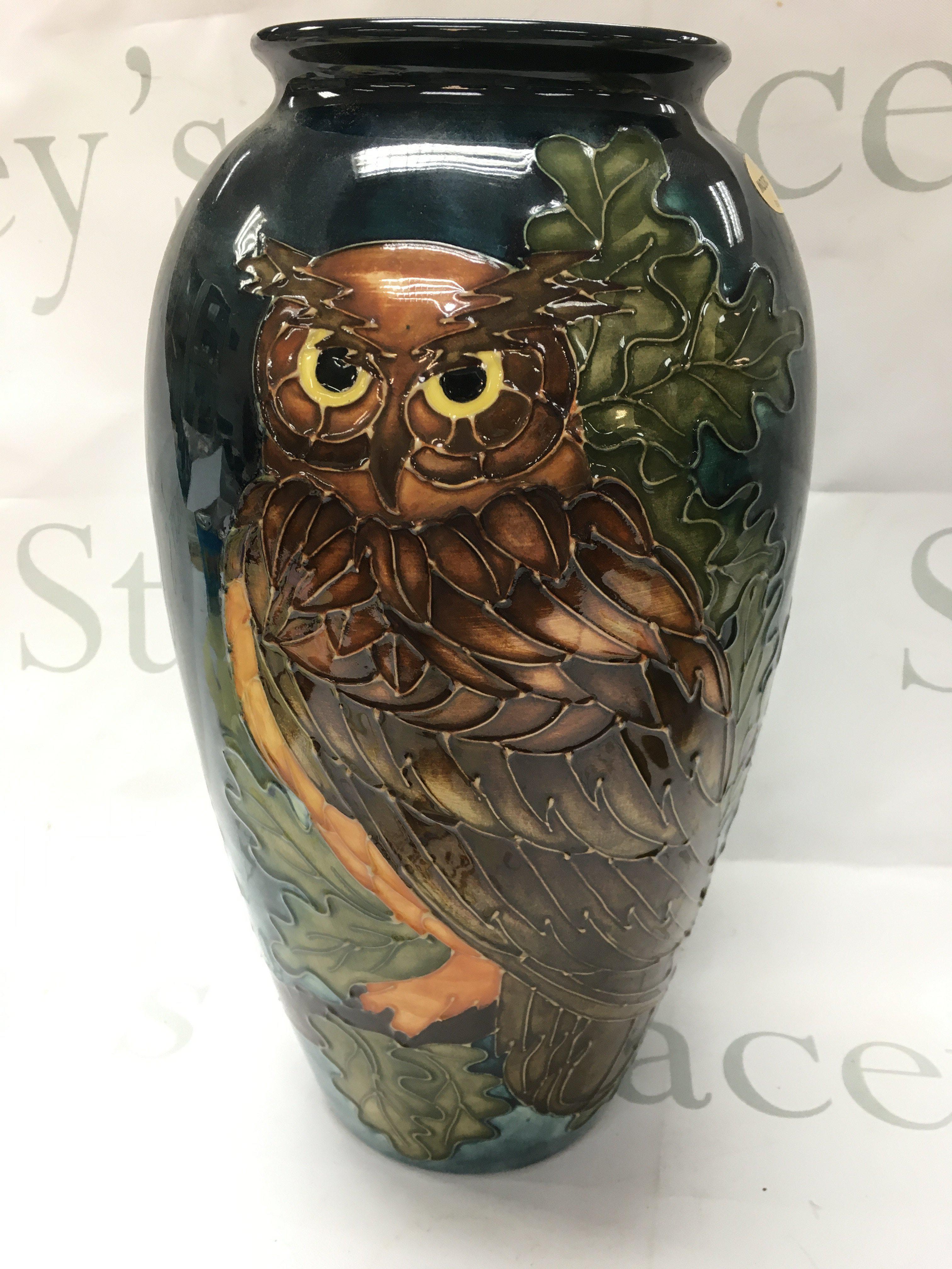 Moorcroft Eagle Owl vase designed by Sally Tuffin, limited edition of 500. No obvious damage or restoration. 31cm tall. This lot cannot be posted