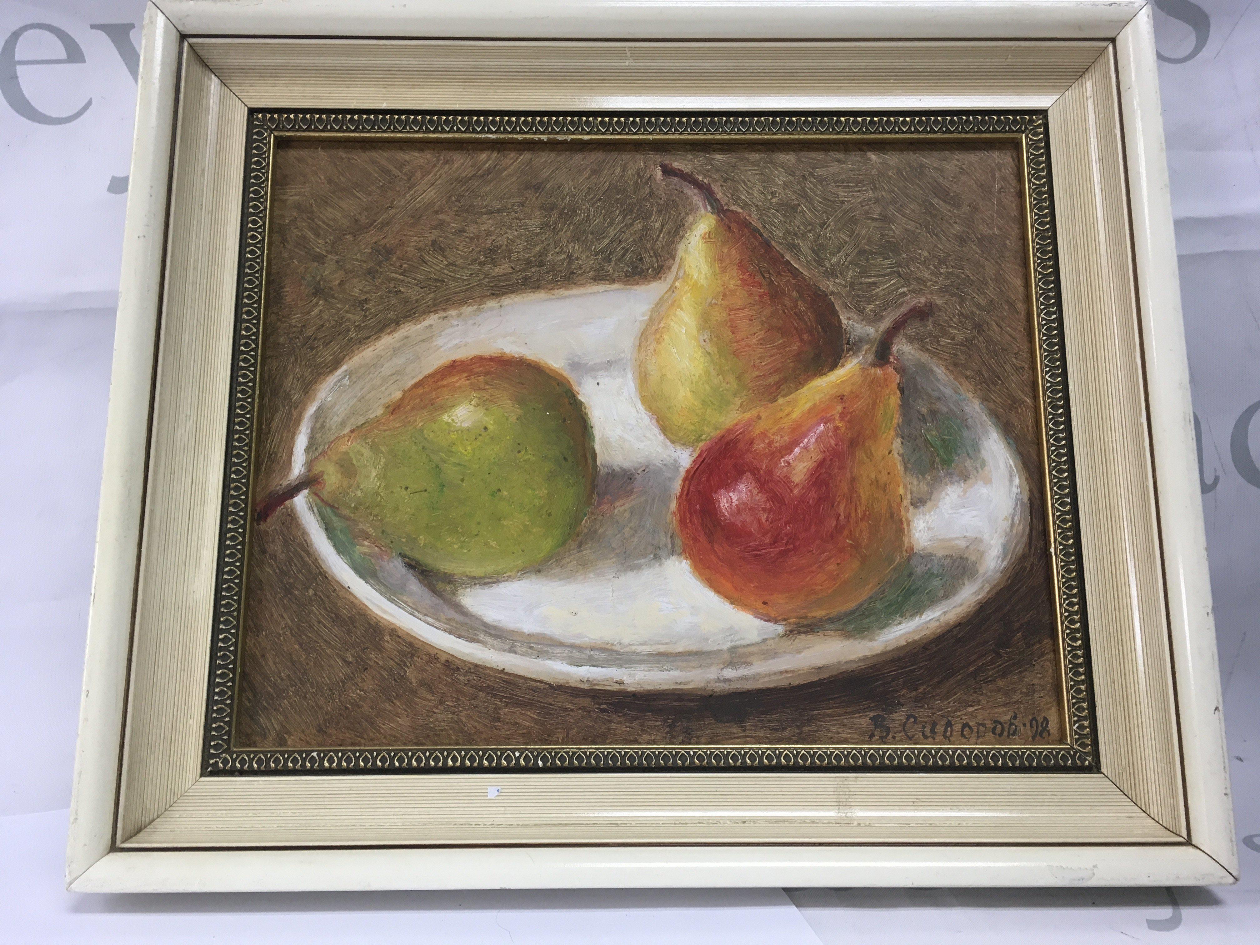 An oil on board painting by Vitaly sidorov (1922-2010), named 'still life with pairs' Approx size 24cmx30cm.