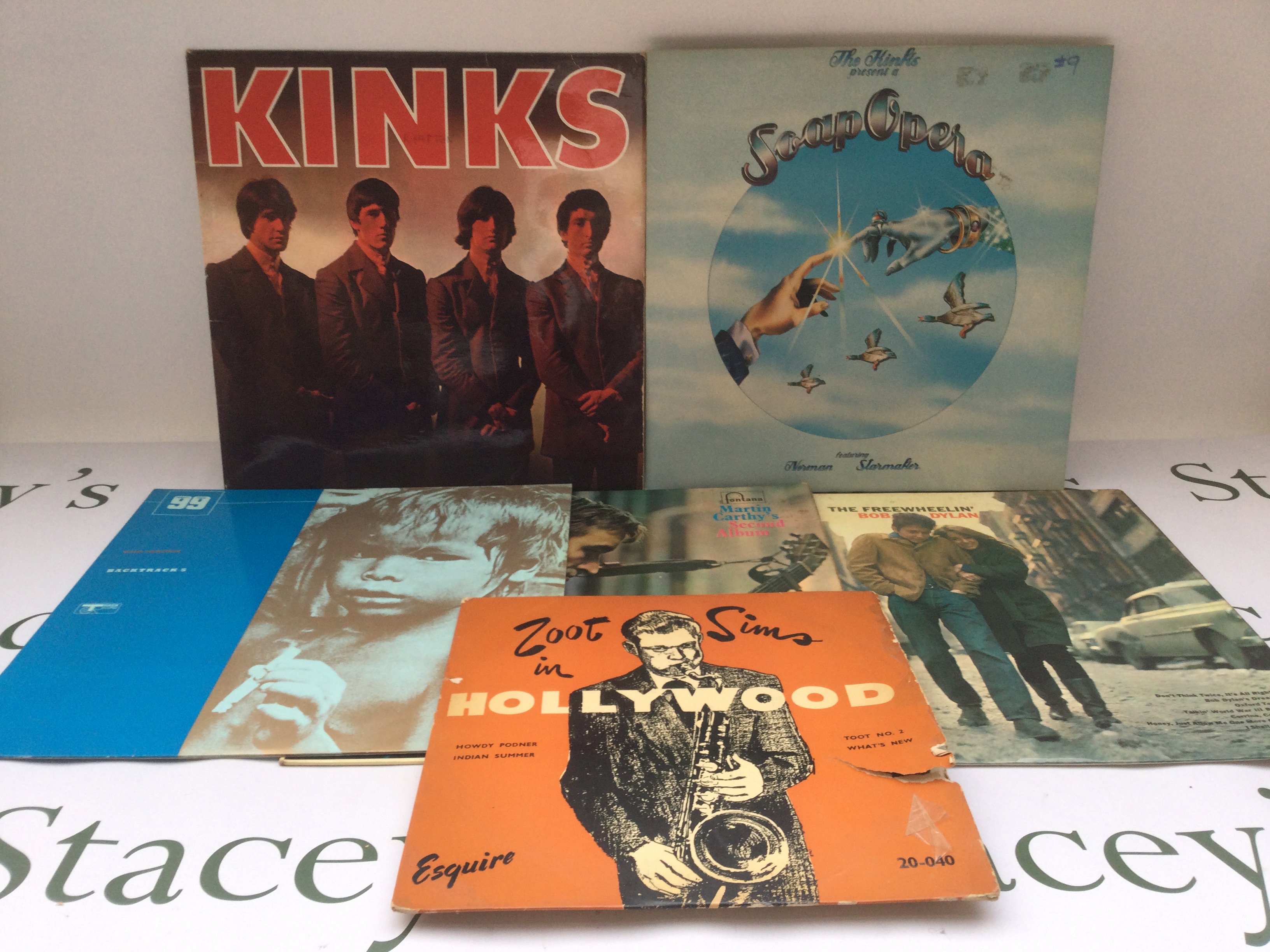 Five LPs and a 10" record including an early UK pressing of The Kinks self titled debut LP, Bob Dylan and others..