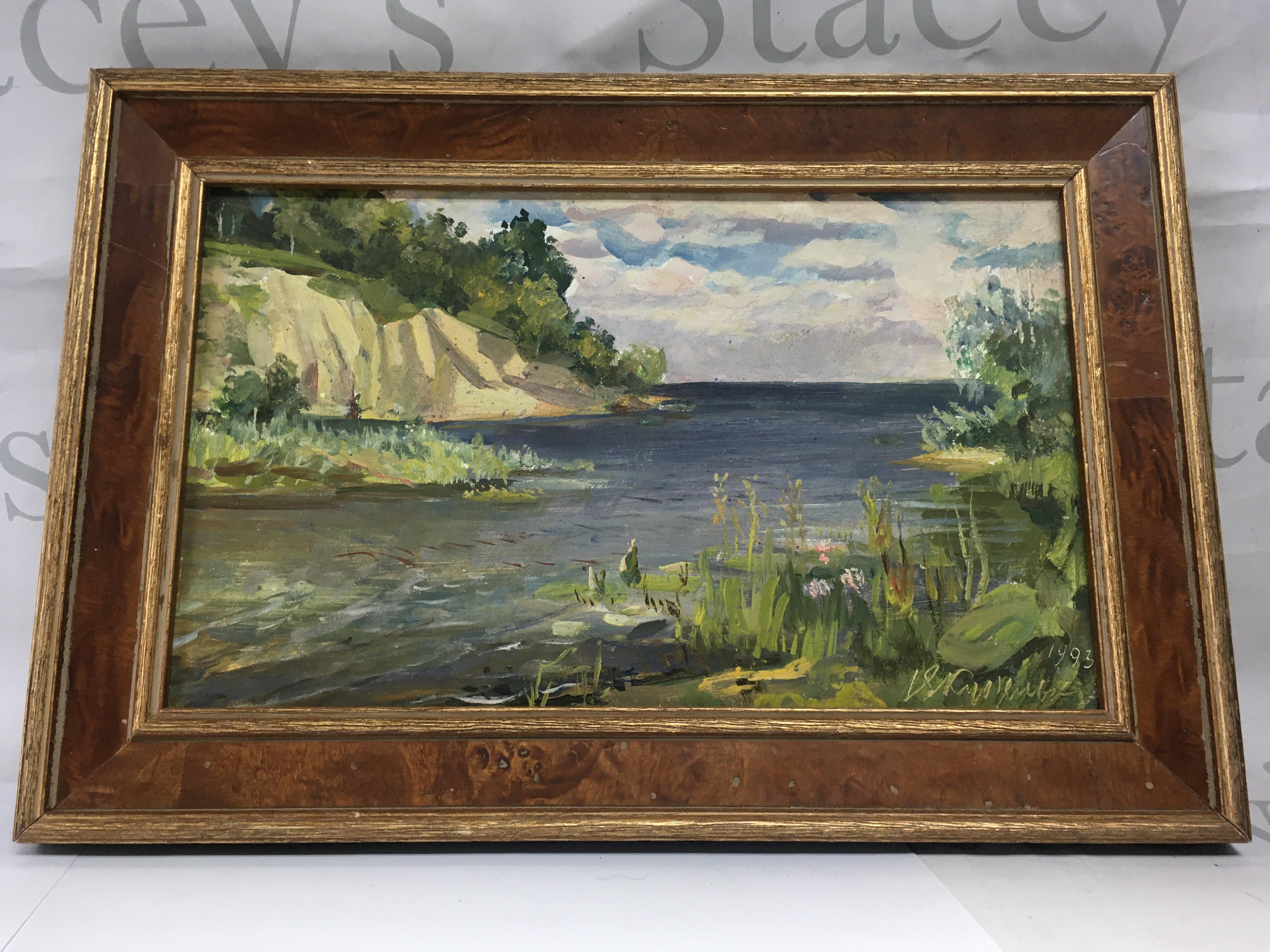 An oil on wood piece by Viktor kudelkin(1911-1995), named 'by the river'1993.