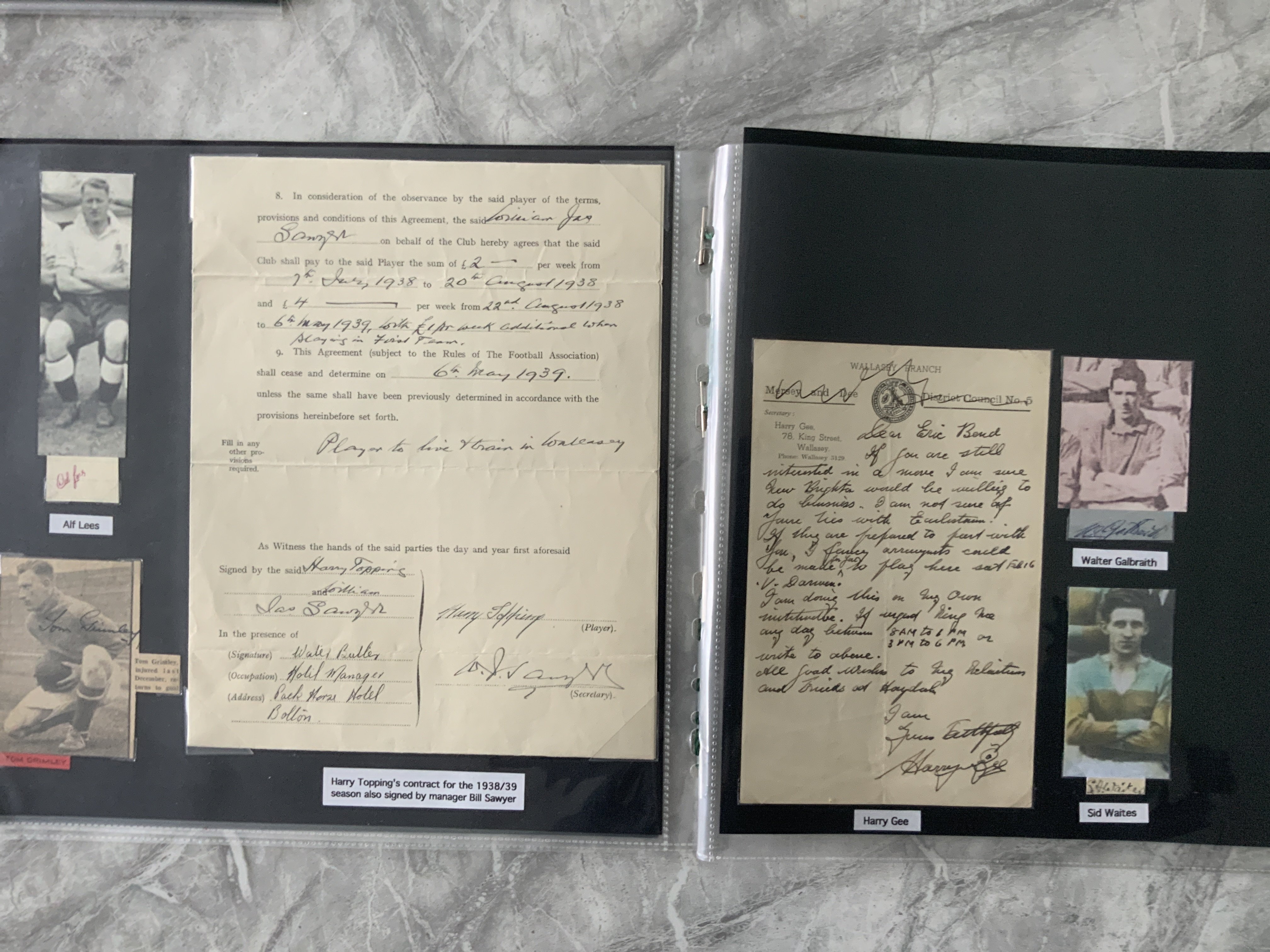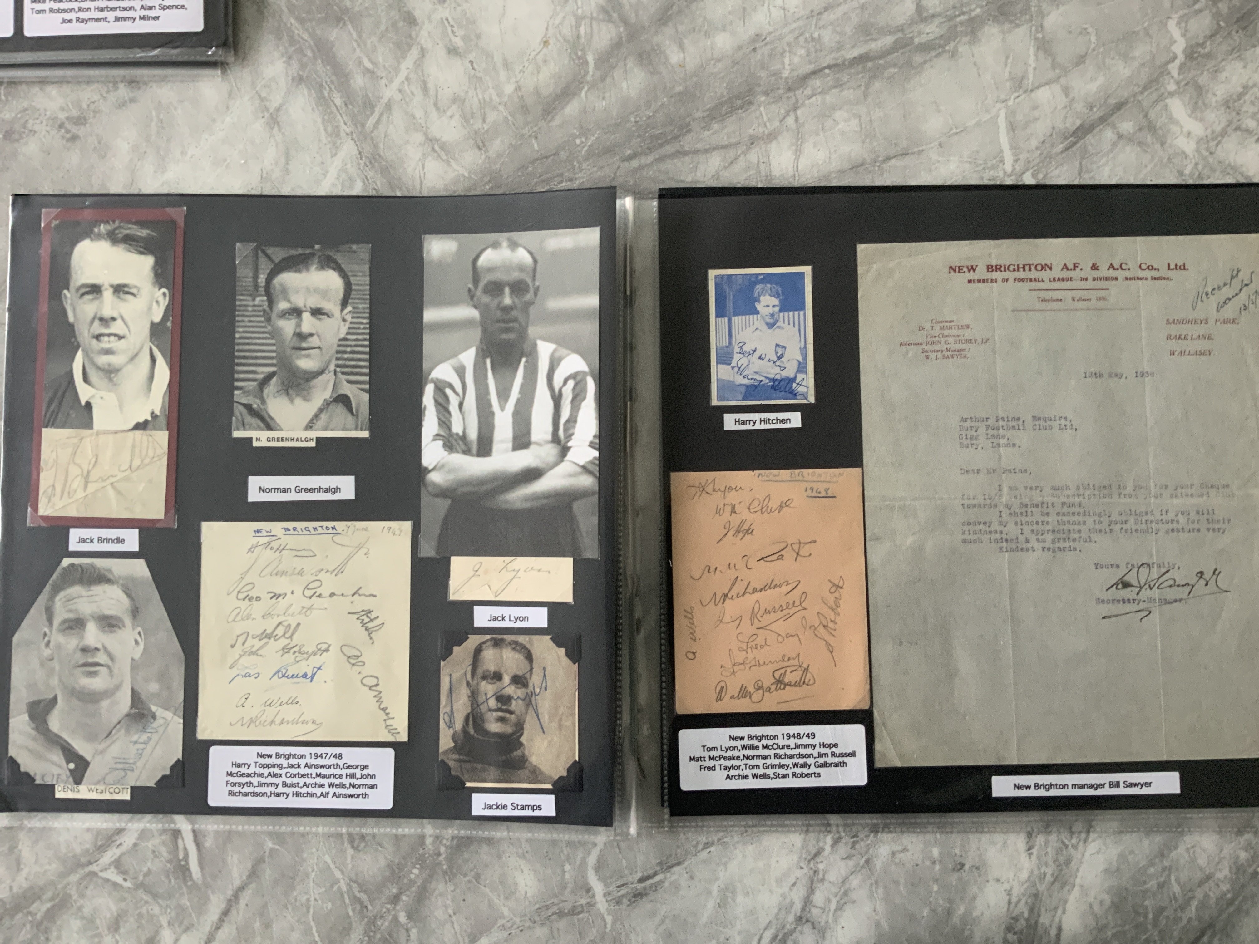 New Brighton Football Autograph Collection: From the 40s 50s and 60s to include autograph page from 48/49 x 11, 47/48 x 11, Harry Toppings 38/39 contract signed by him and manager Bill Sawyer, 50/51 away programme page signed by 11, letter from Harry Gee and other signed magazine pictures. (49 autographs)