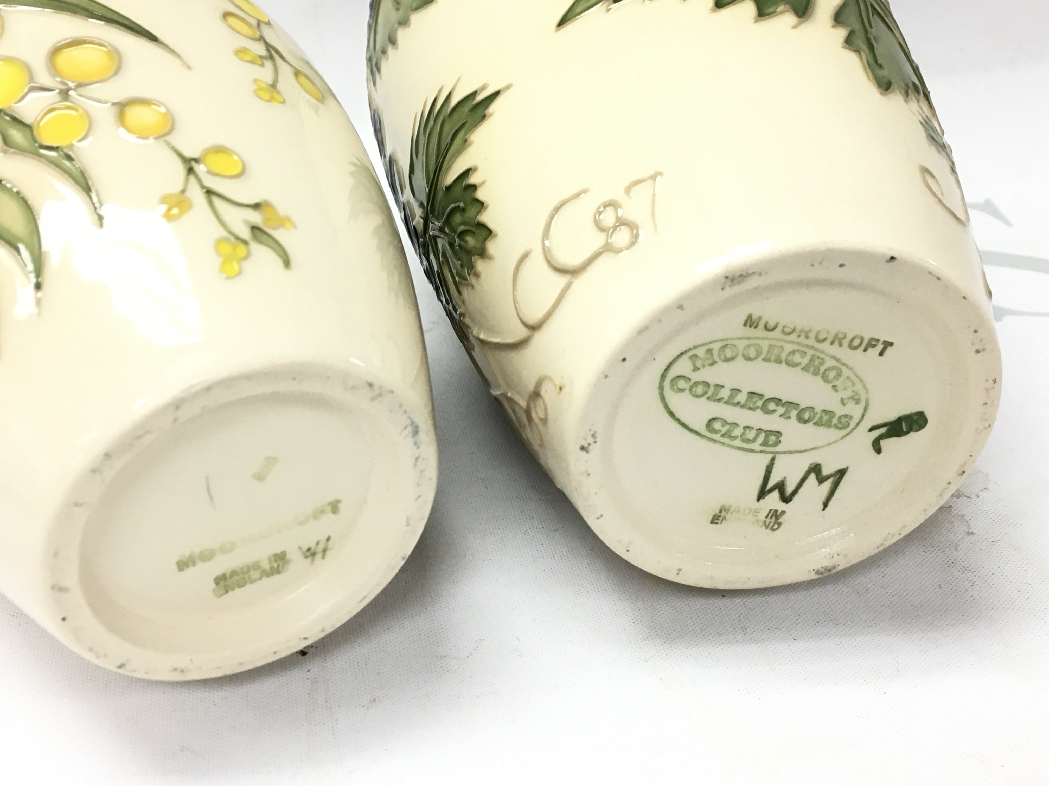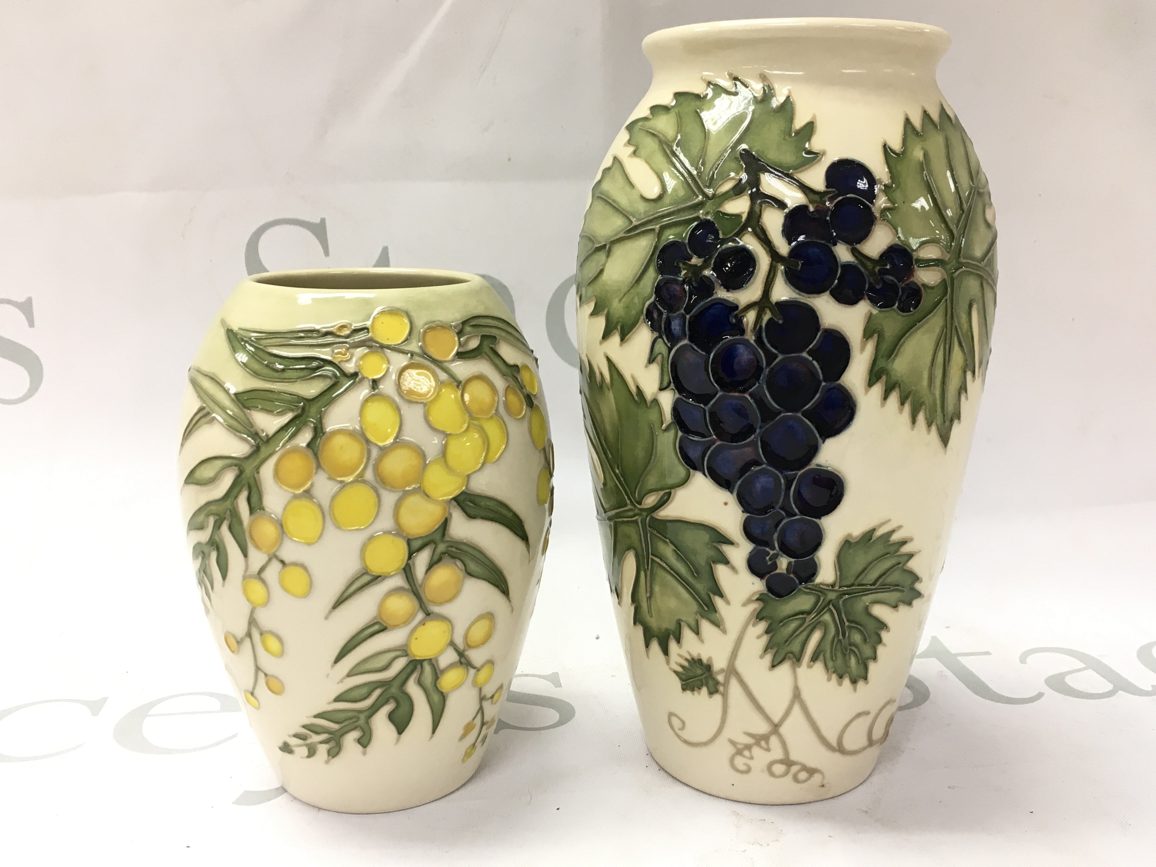 Moorcroft vases including a Grapevine vase and Golden Wattle vase, 13 and 19cm tall. No obvious damage or restoration This lot cannot be posted