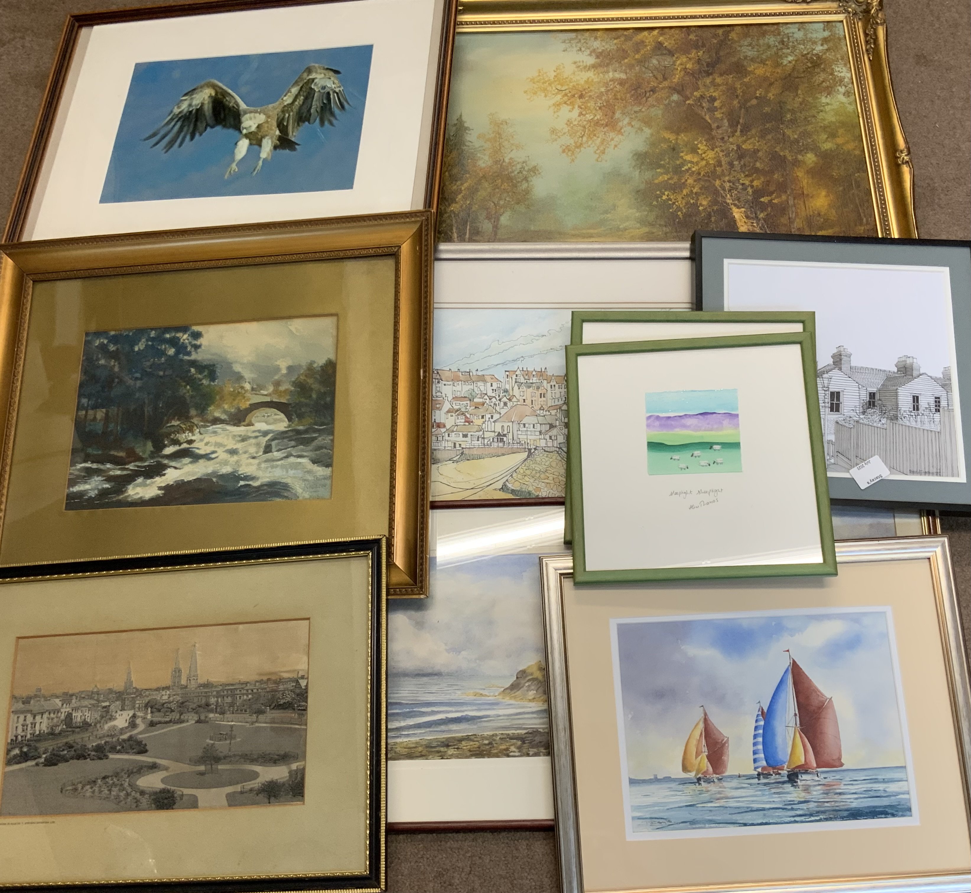 A large collection of various pictures. Including Silks, Watercolours, oils etc..