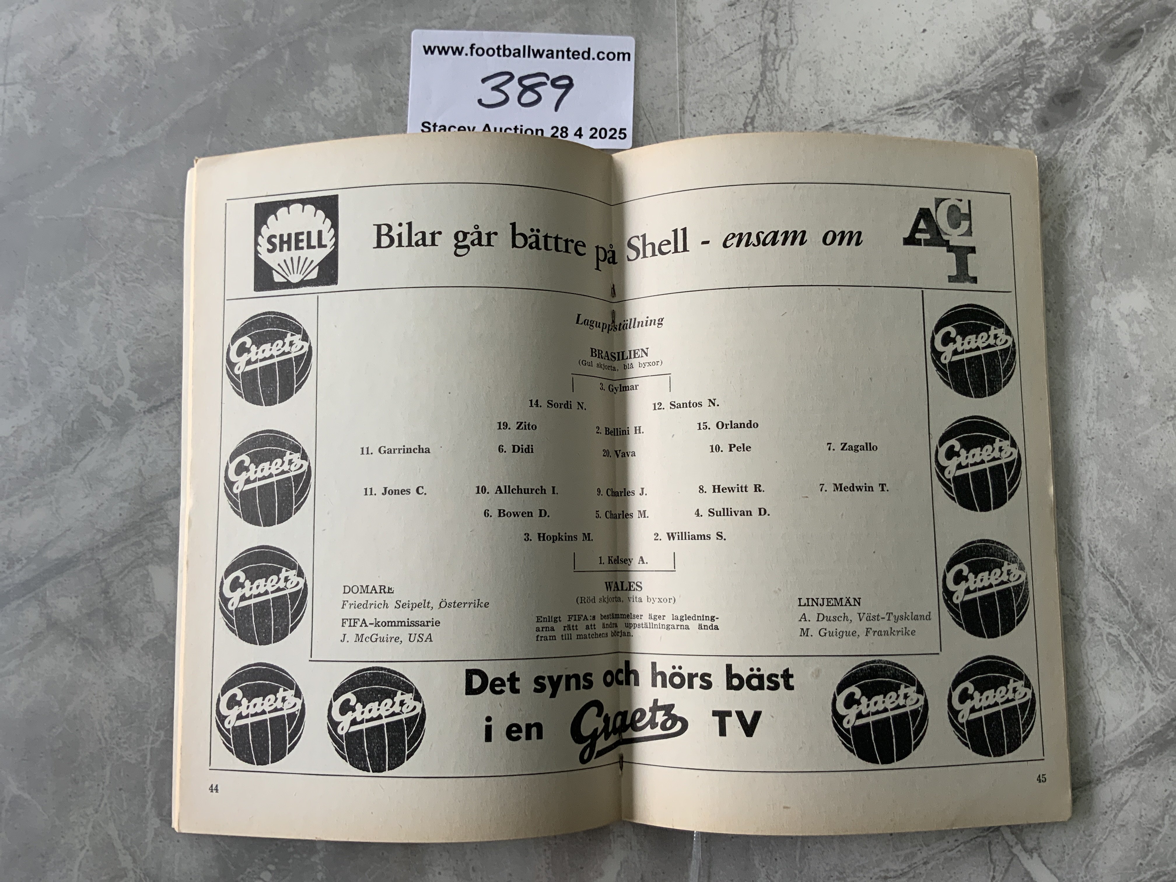 1958 Wales v Brazil World Cup Football Programme: Excellent condition 88 page programme with no team changes. Some great names playing including Pele Garrincha Allchurch and Charles.