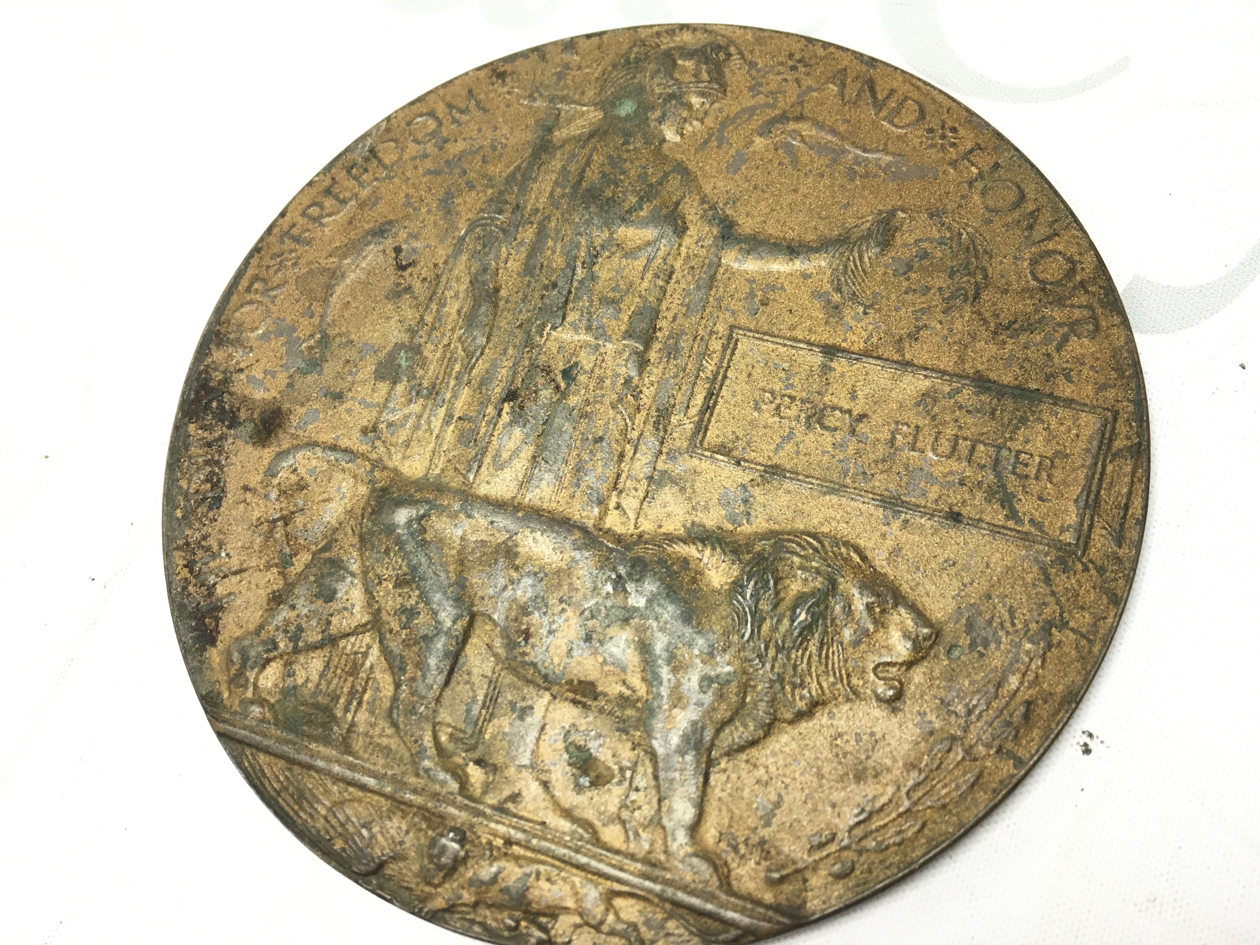 A WW1 death penny, dedicated to Percy Flutter. Postage category B