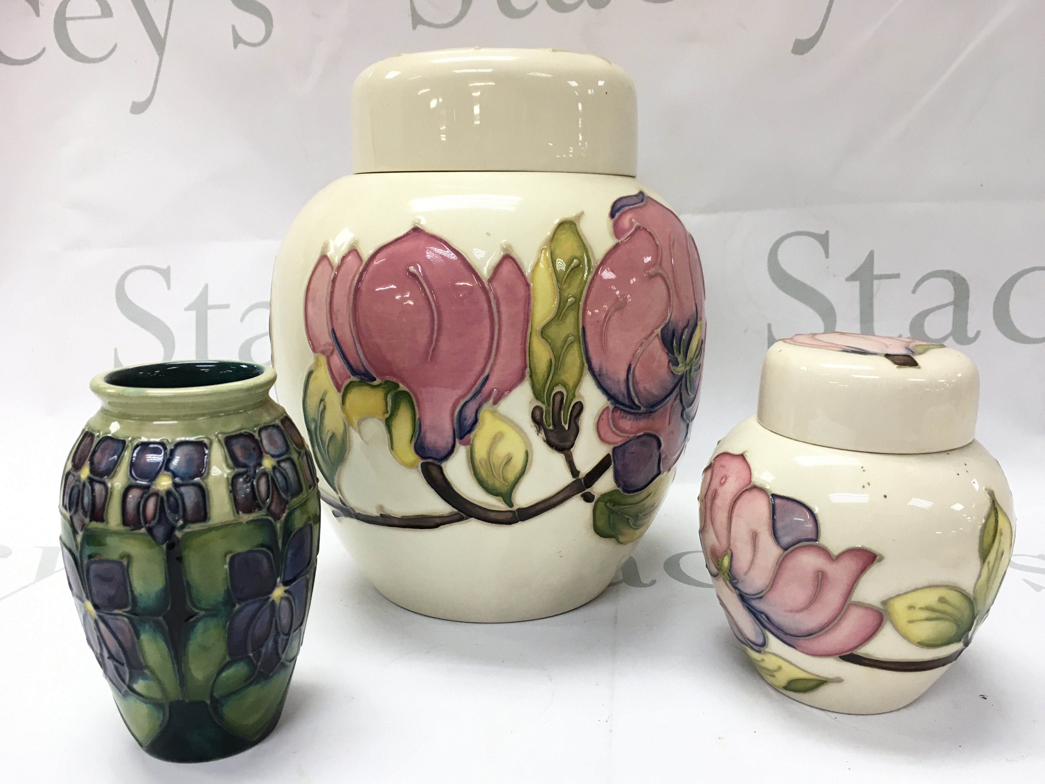 Moorcroft vases, Magnolia ginger jars and violet ovoid posy. 11 to 21cm tall. This lot cannot be posted