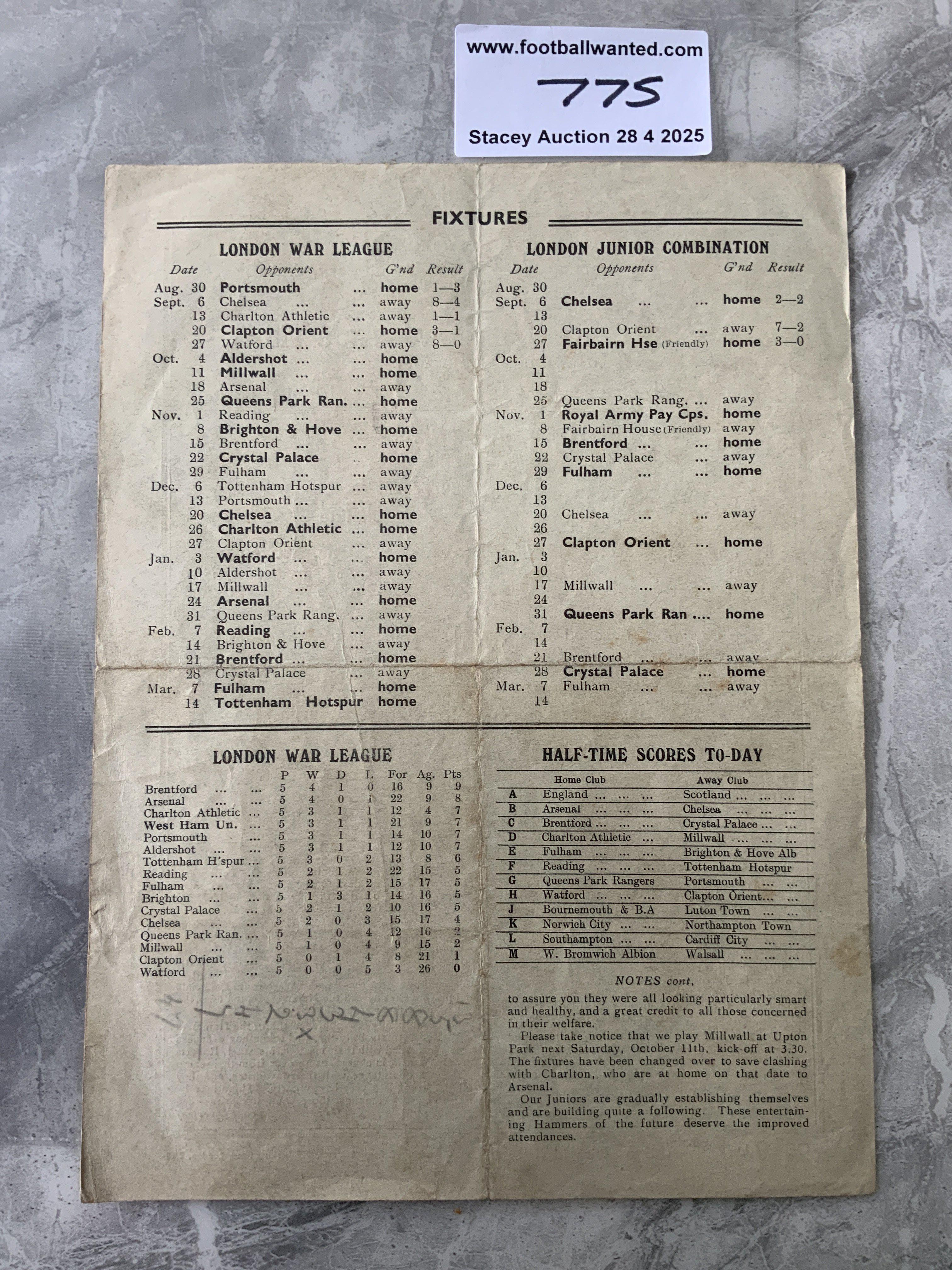 41/42 West Ham v Aldershot Football Programme: Single sheet London War League programme with folding but no team changes. Pencilled numbers to rear.