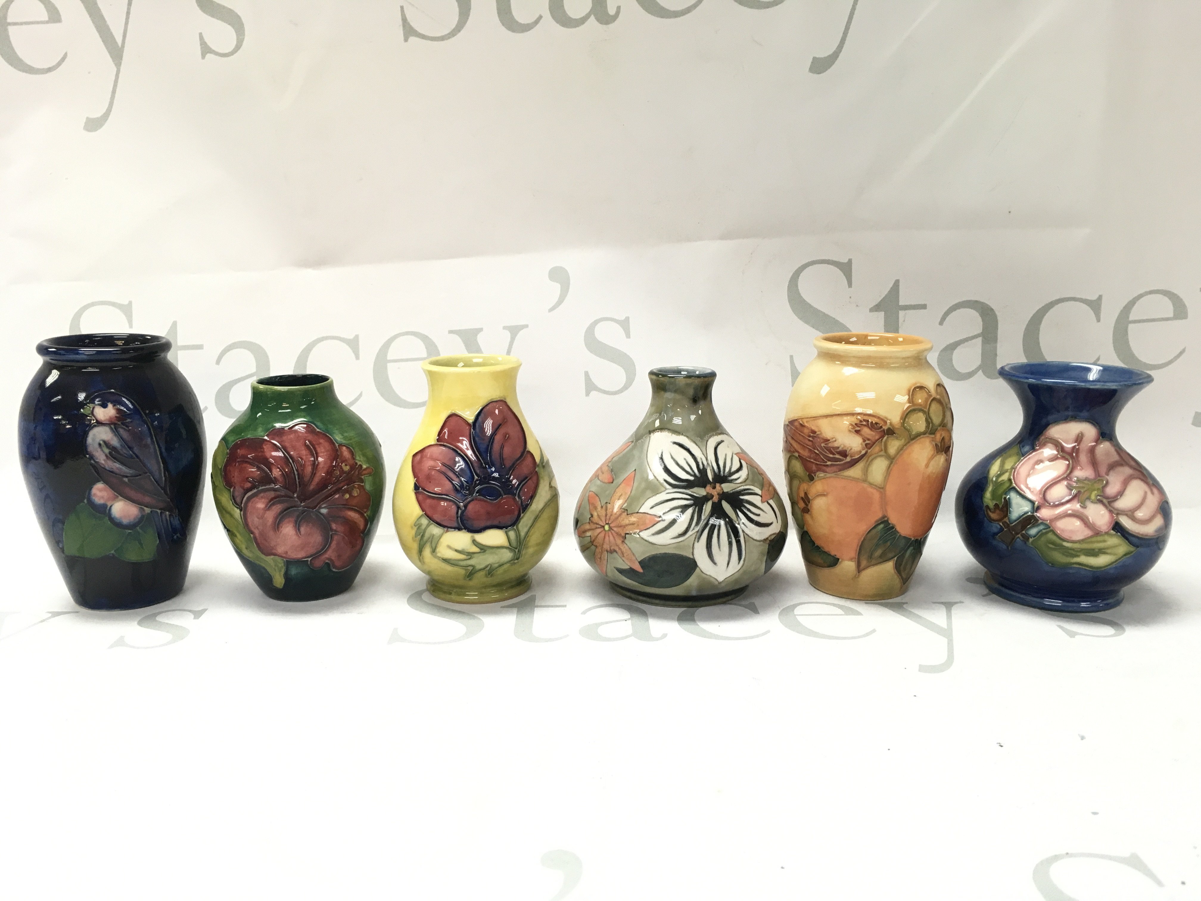 Moorcroft porcelain vases including Hibiscus, Anemone patterns. Approximately 10cm tall. No obvious damage or restoration