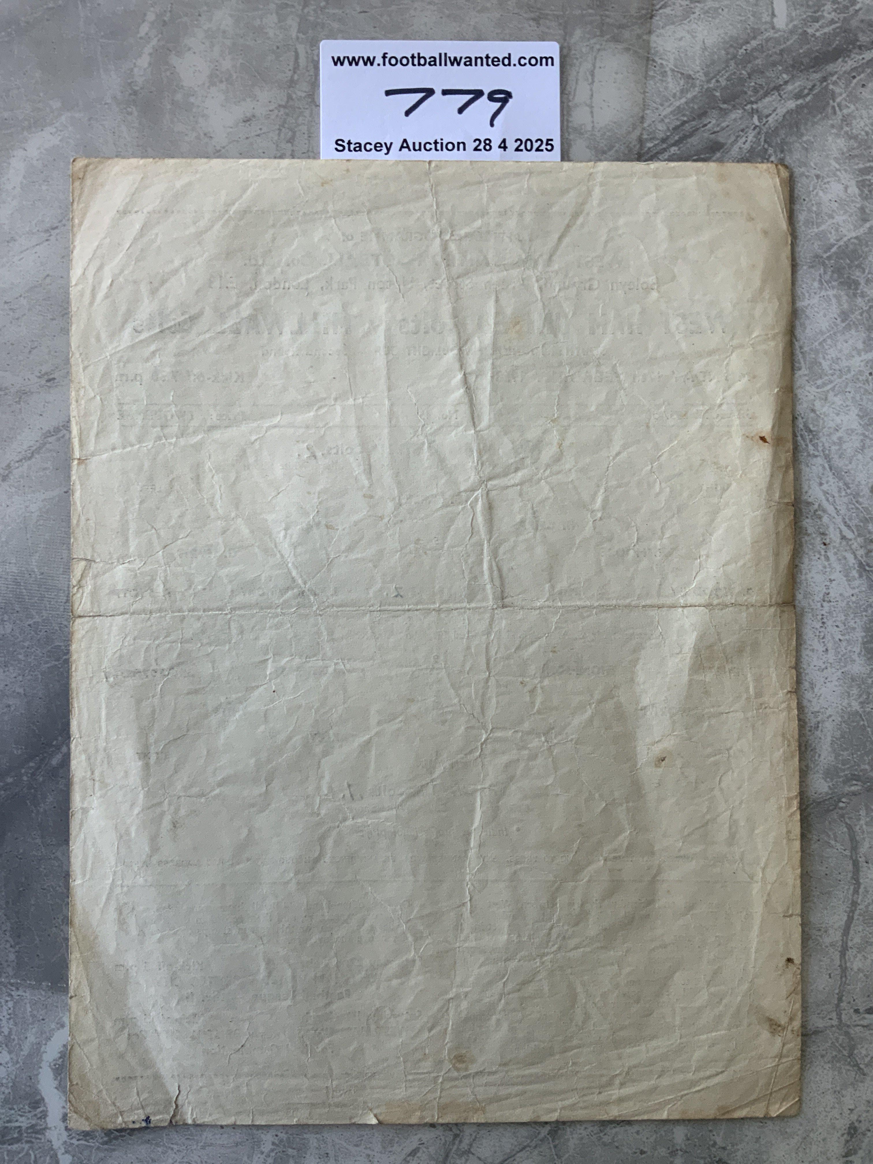 57/58 West Ham v Millwall SJFC Football Programme: Single sheet colts match dated 17 2 1958. Fair condition with a couple of tears and score/scorers noted.