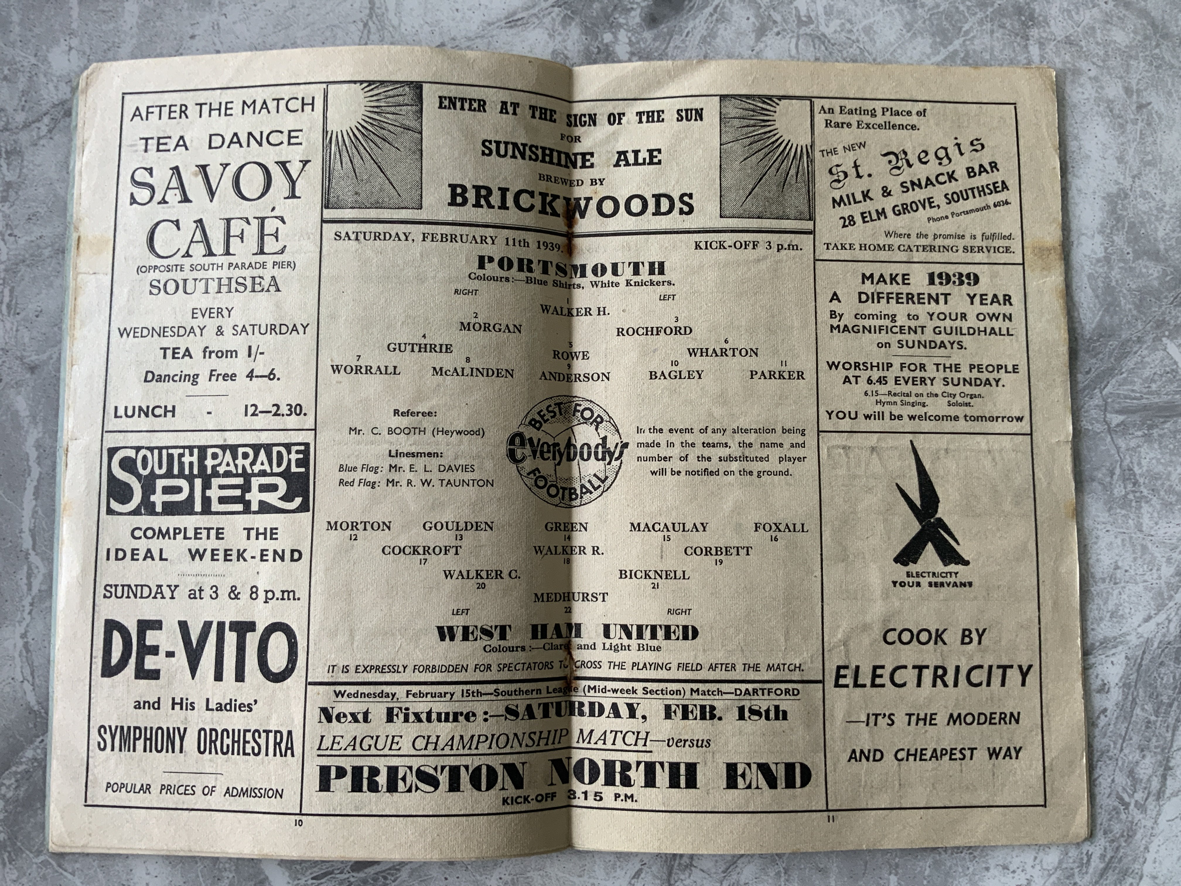 38/39 Portsmouth v West Ham FA Cup Football Programme: From Pompeys cup winning run. Rusty staples making centre page loose. Fold more visible to rear. Fair condition with no team changes.