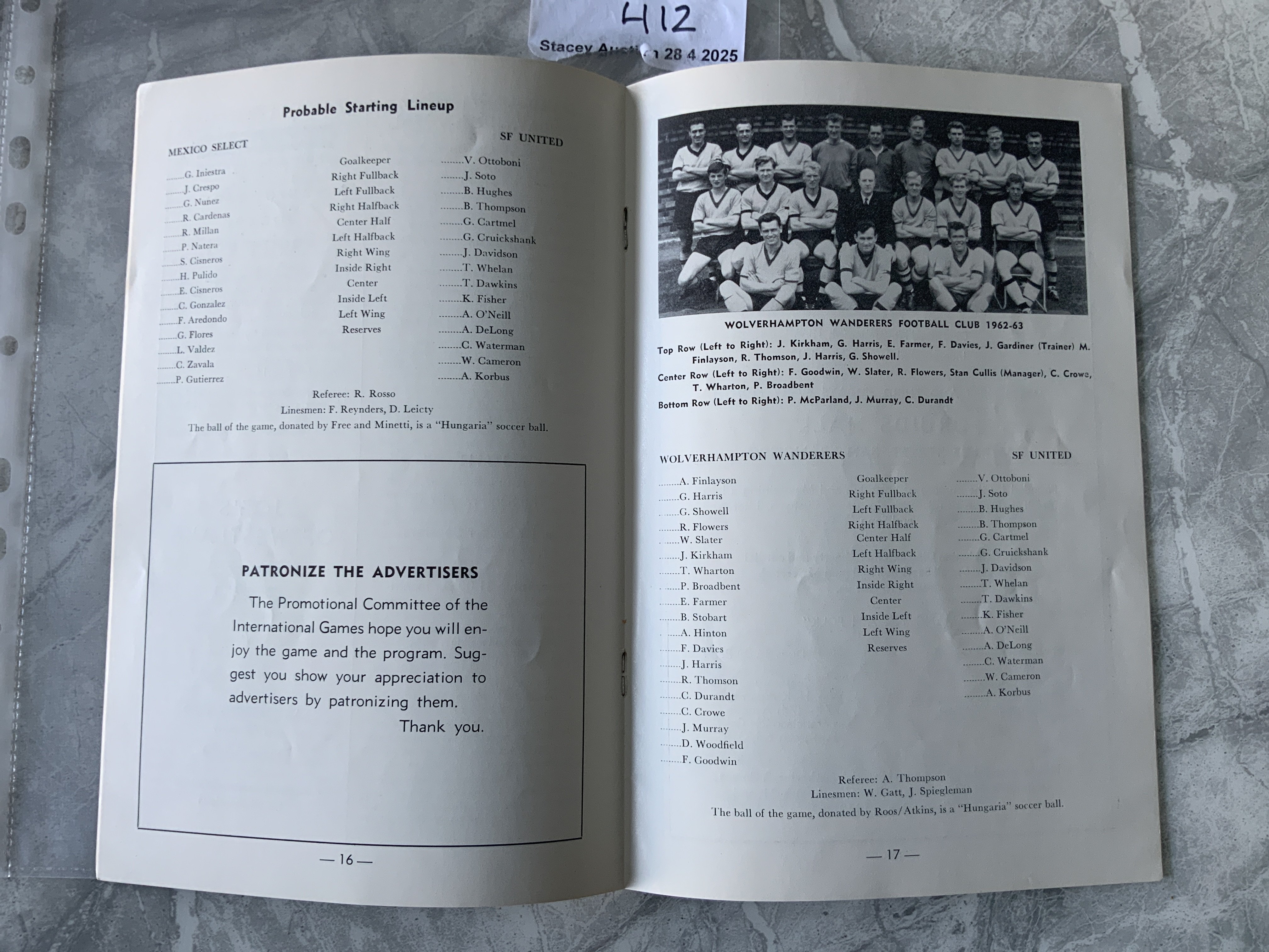 1963 San Francisco United v Wolves Football Programme: Excellent condition 32 page programme with no team changes. Programme also covers Mexico City Select v San Francisco. (1)