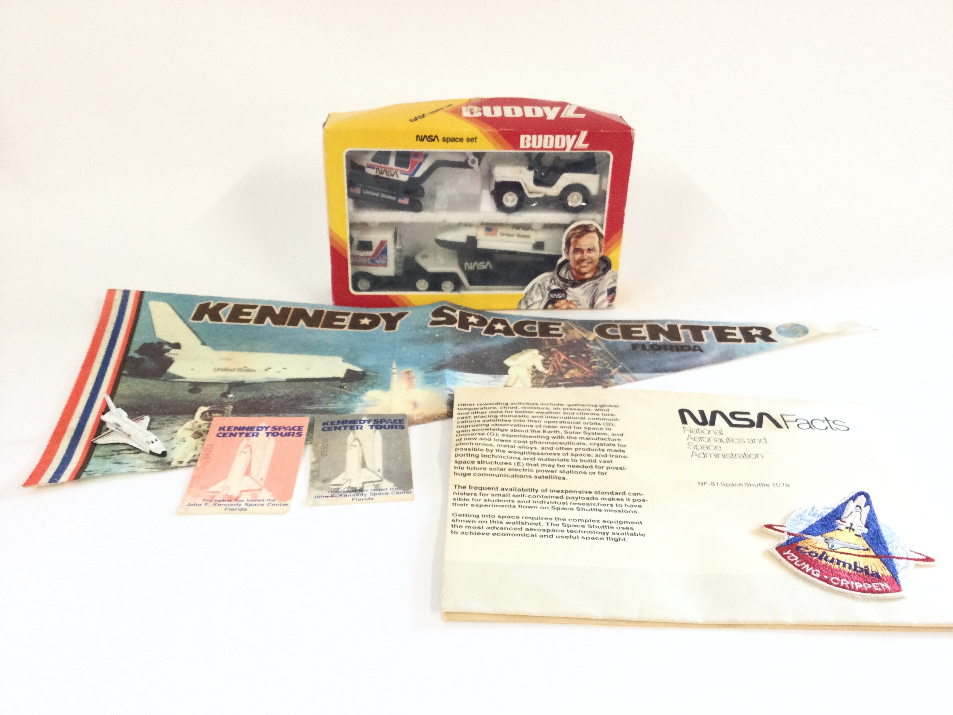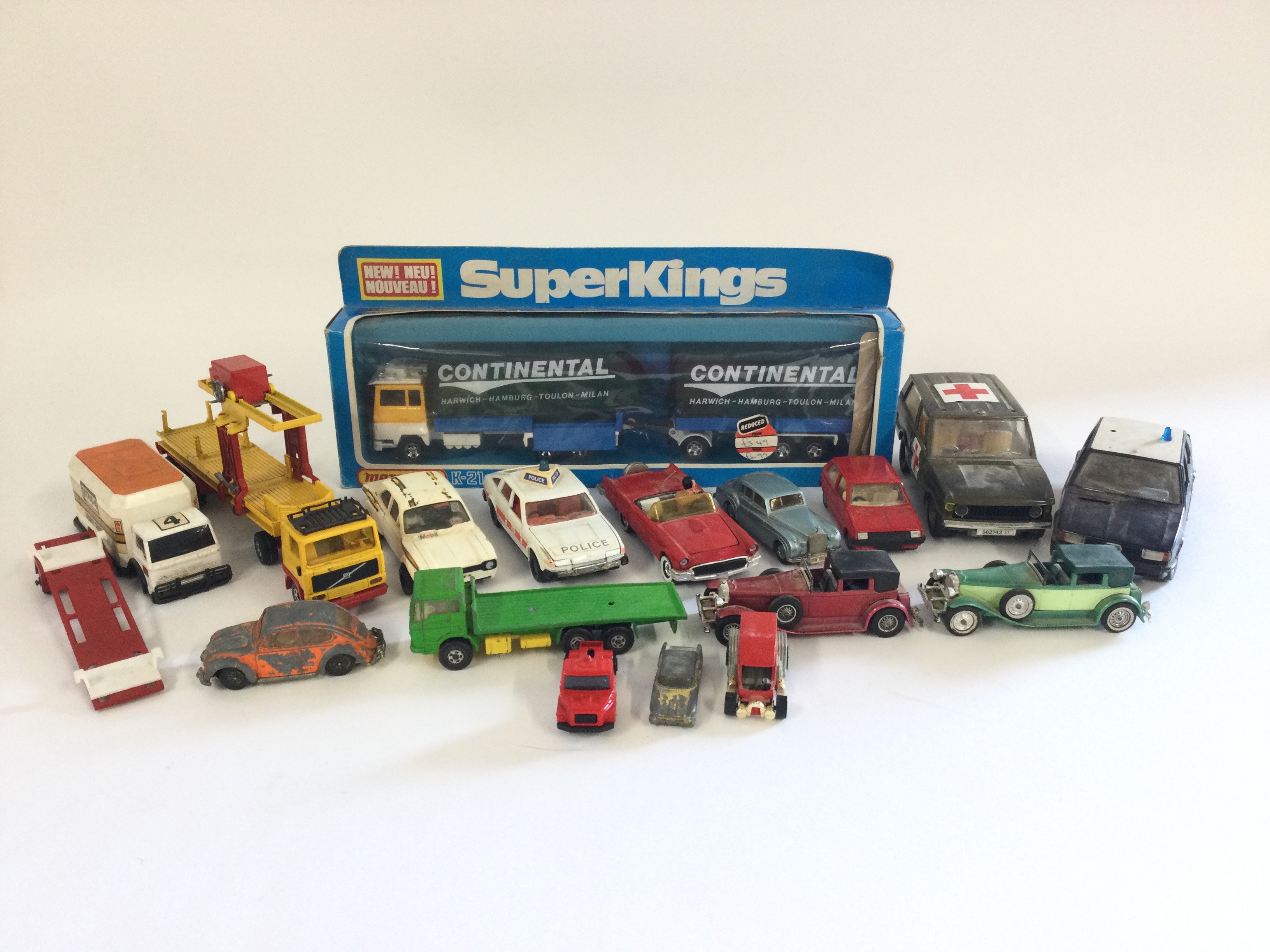A box containing a NASA space set with additional accessories. Also a Boxed Superkings Matchbox K-21 as well as various other old Playworn vehicles to include Corgi and Matchbox. NO RESERVE