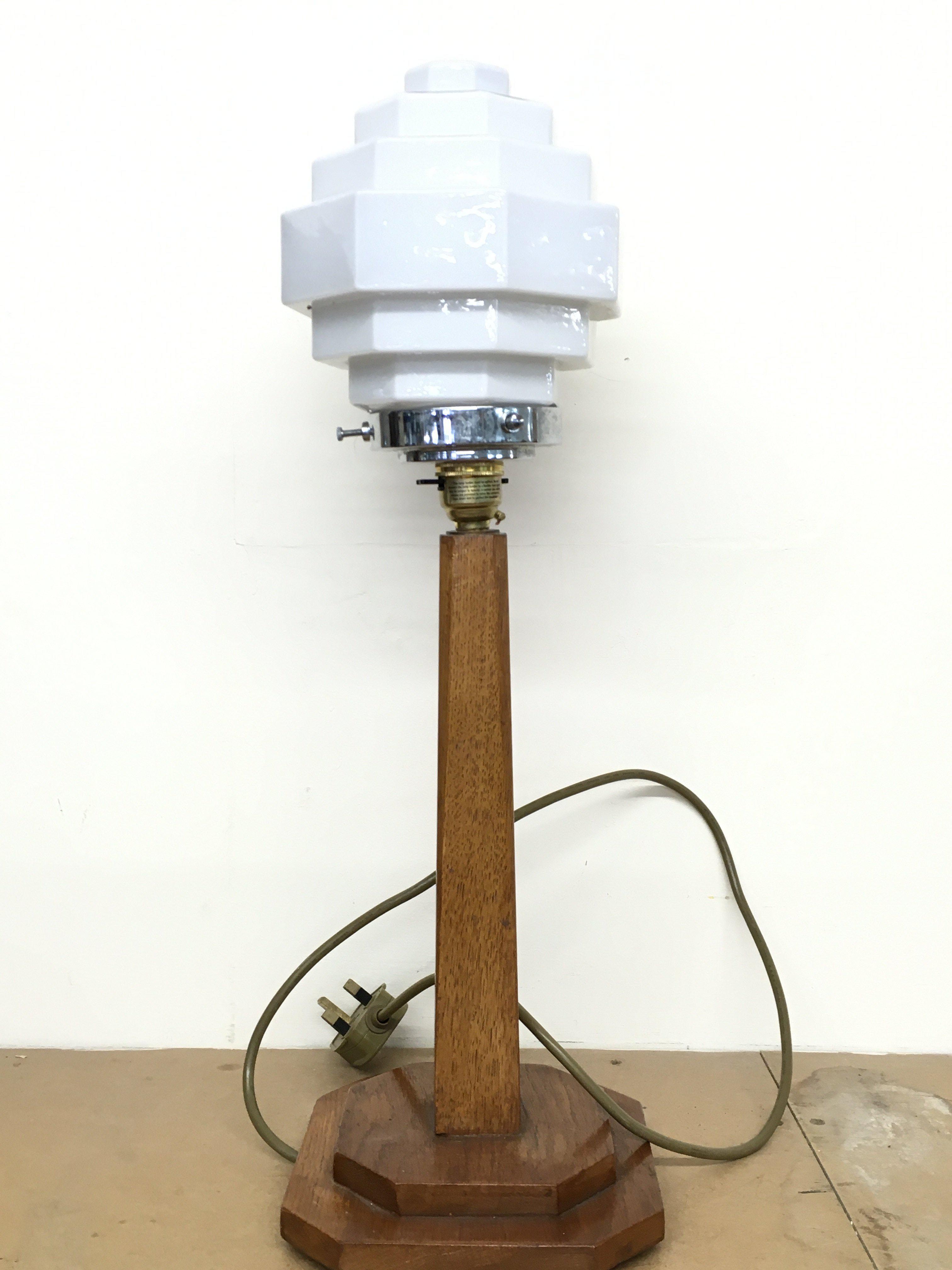 A 1930s art deco table lamp and shade, 55cm tall. This lot cannot be posted