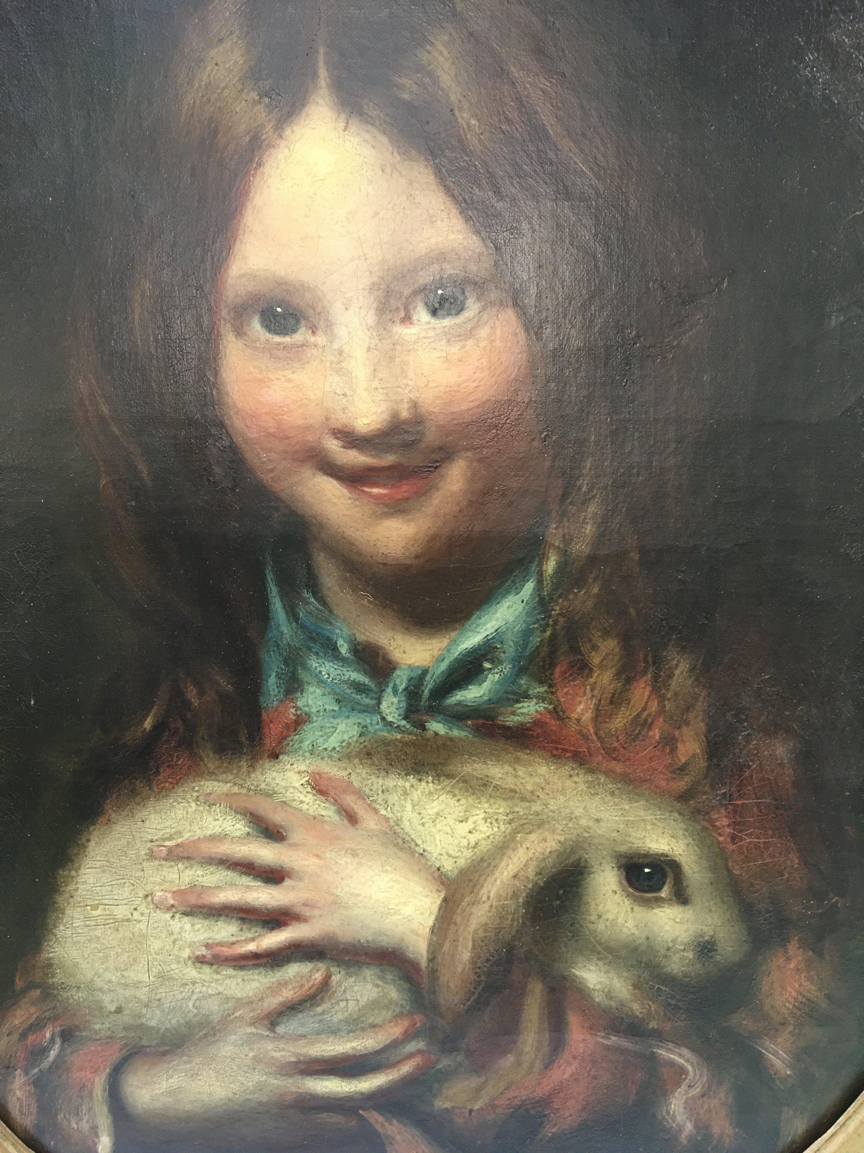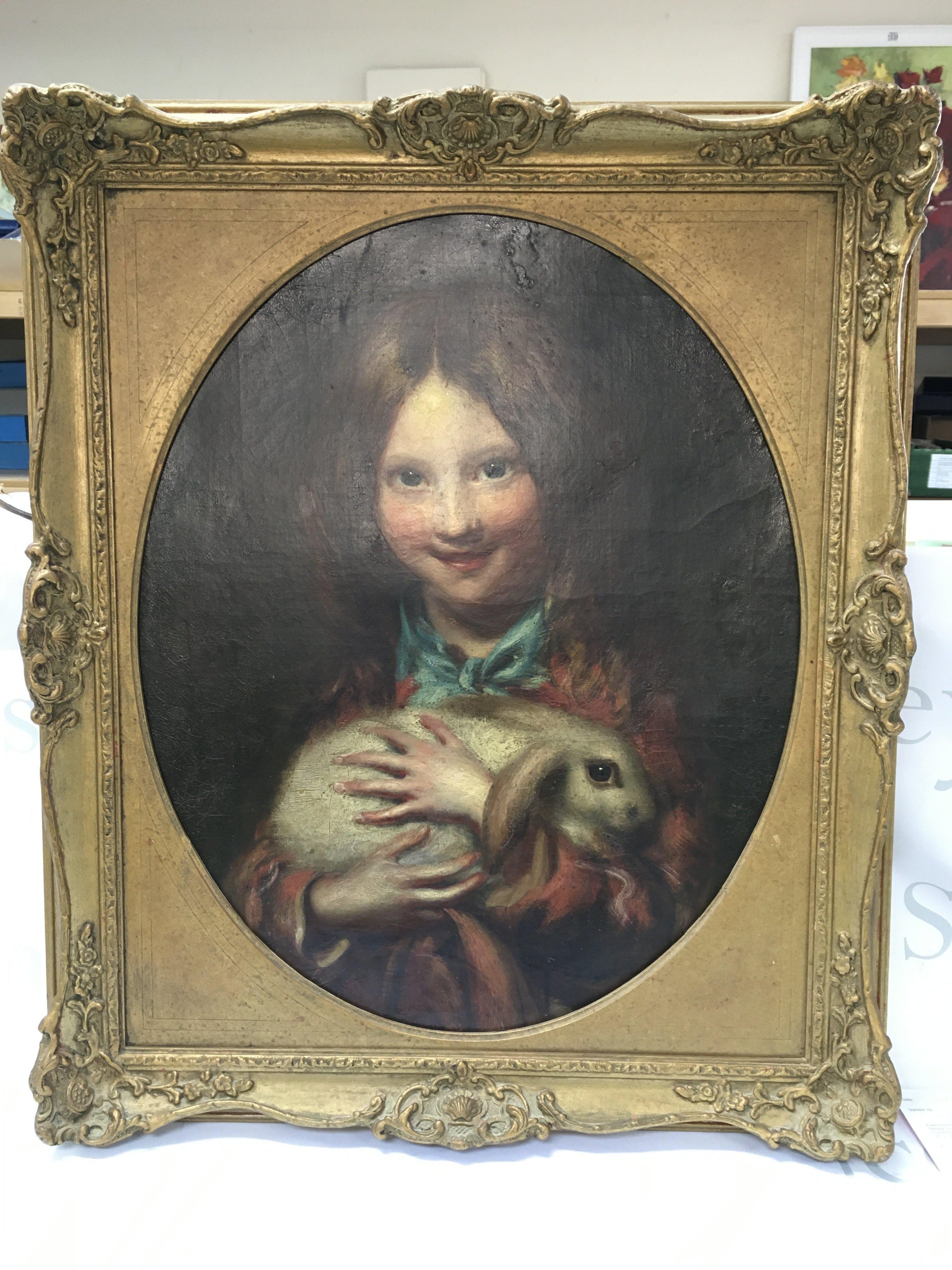 A Victorian oil painting portrait of a young girl holding a rabbit , frame dimensions 55x65cm