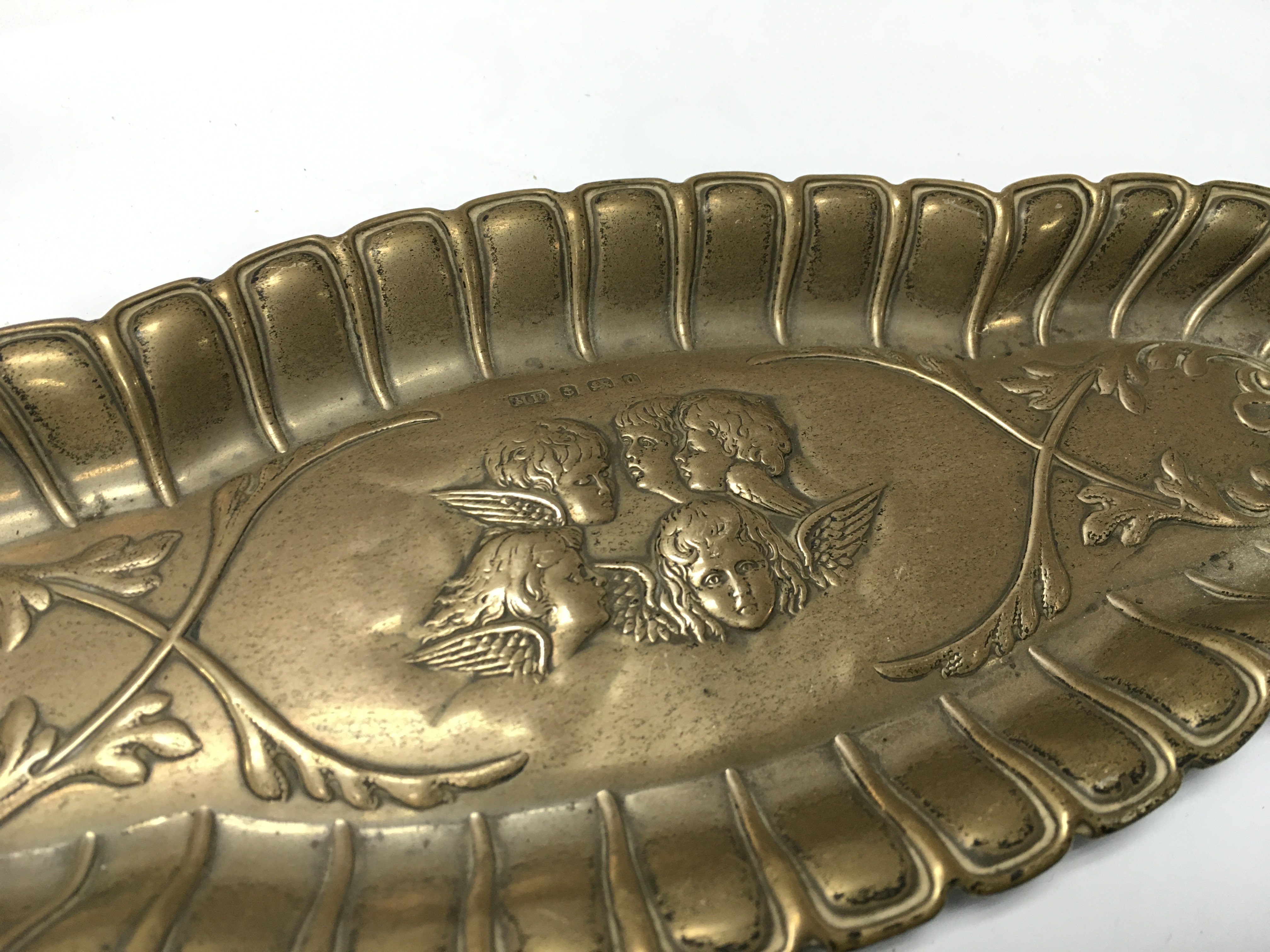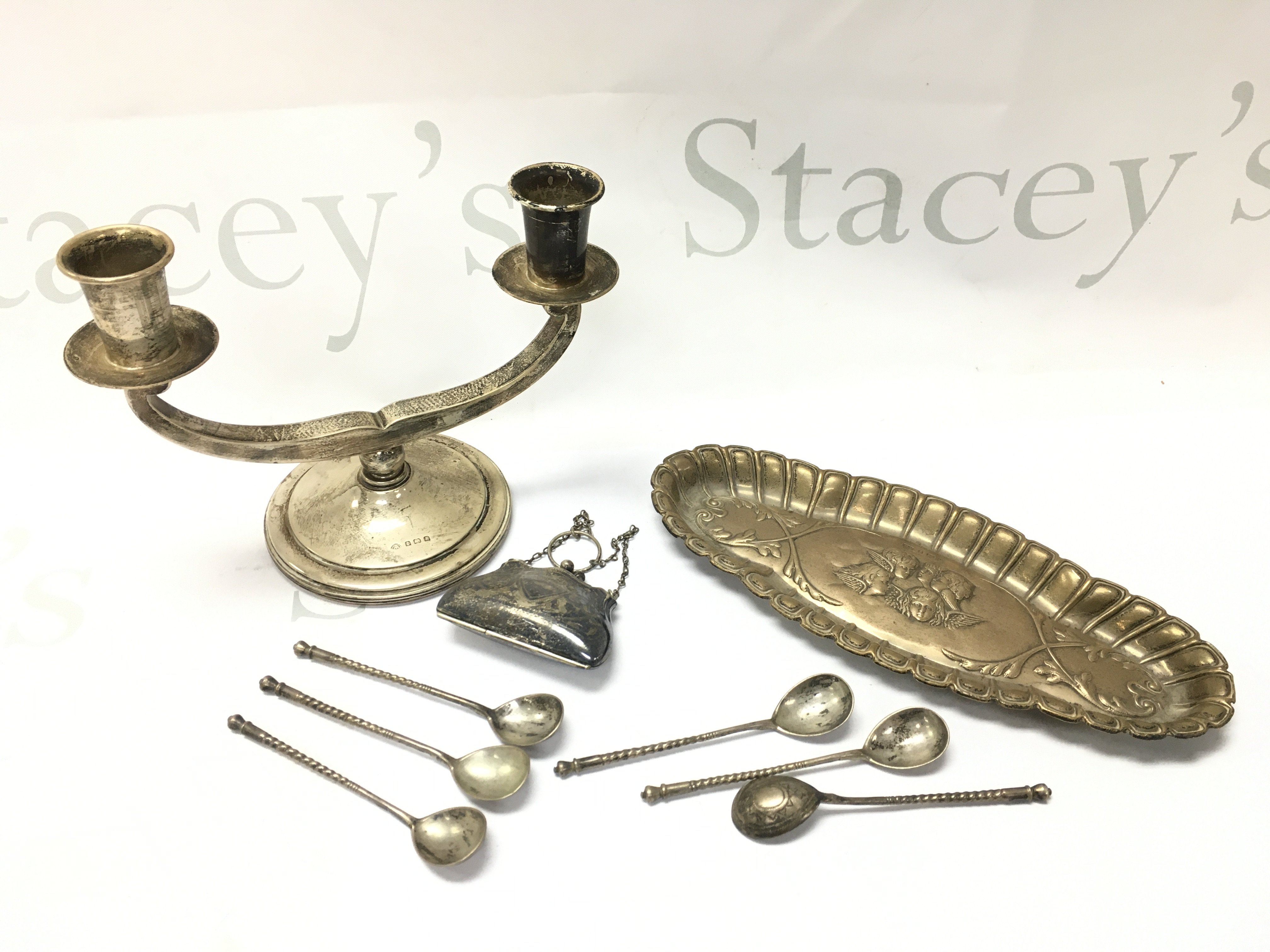 A collection of silver hallmarked items including a candle stick, cherub tray , coffee spoons and a purse. Postage category B