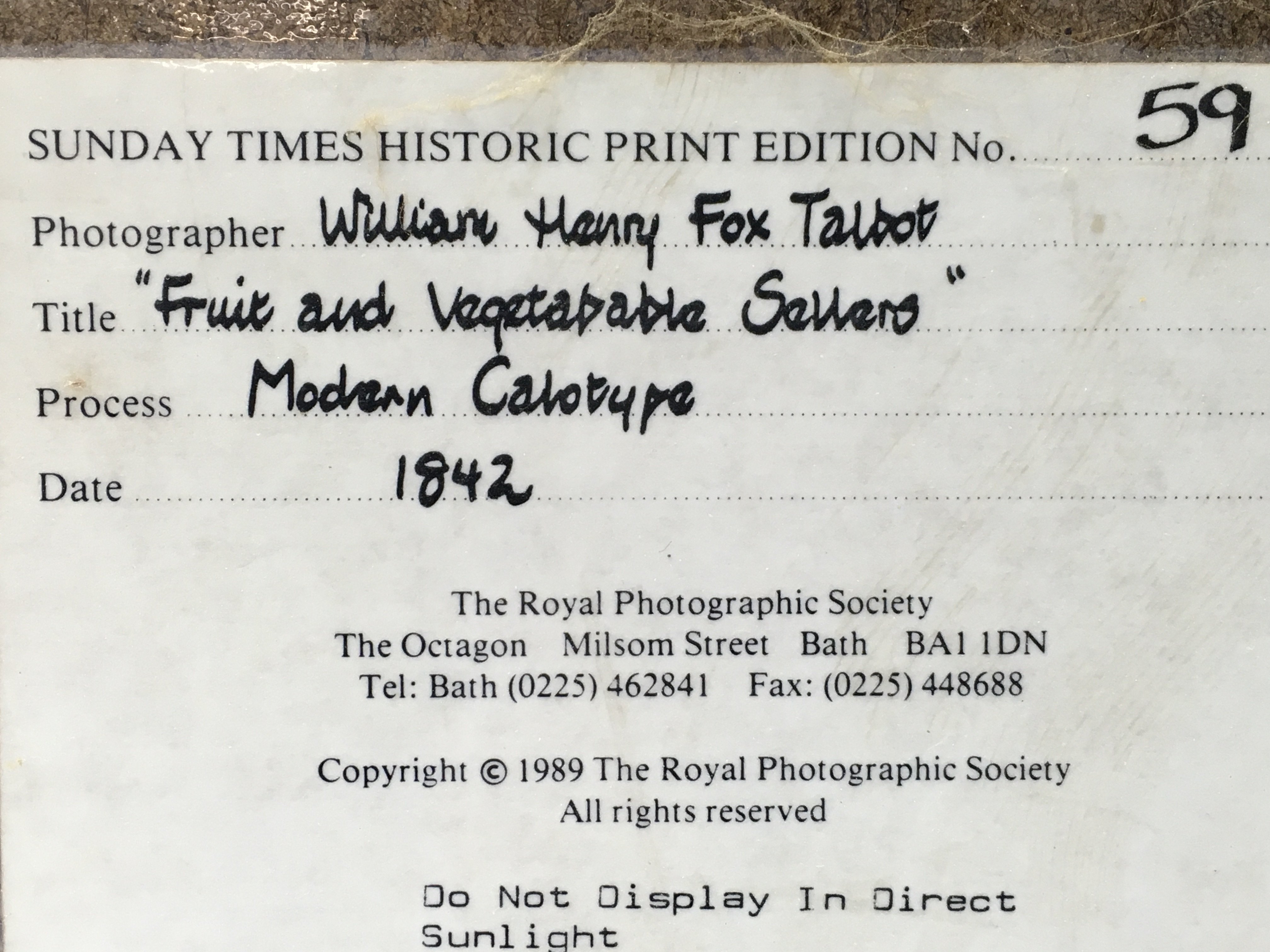 A Framed William Henry Fox Talbot photograph titled Fruit and Vegetable sellers dated 1842. Frame dimensions 37x29cm This lot cannot be posted
