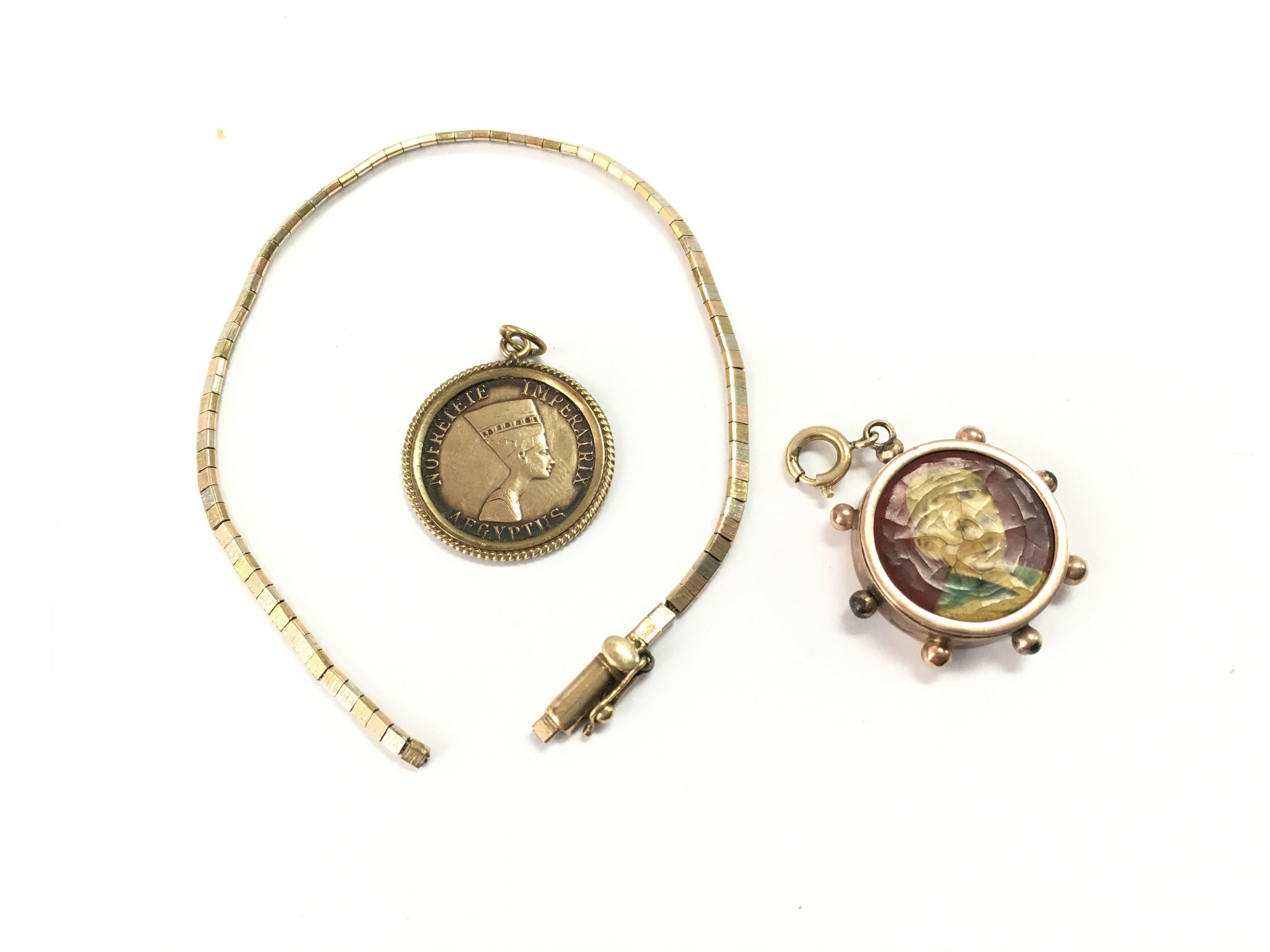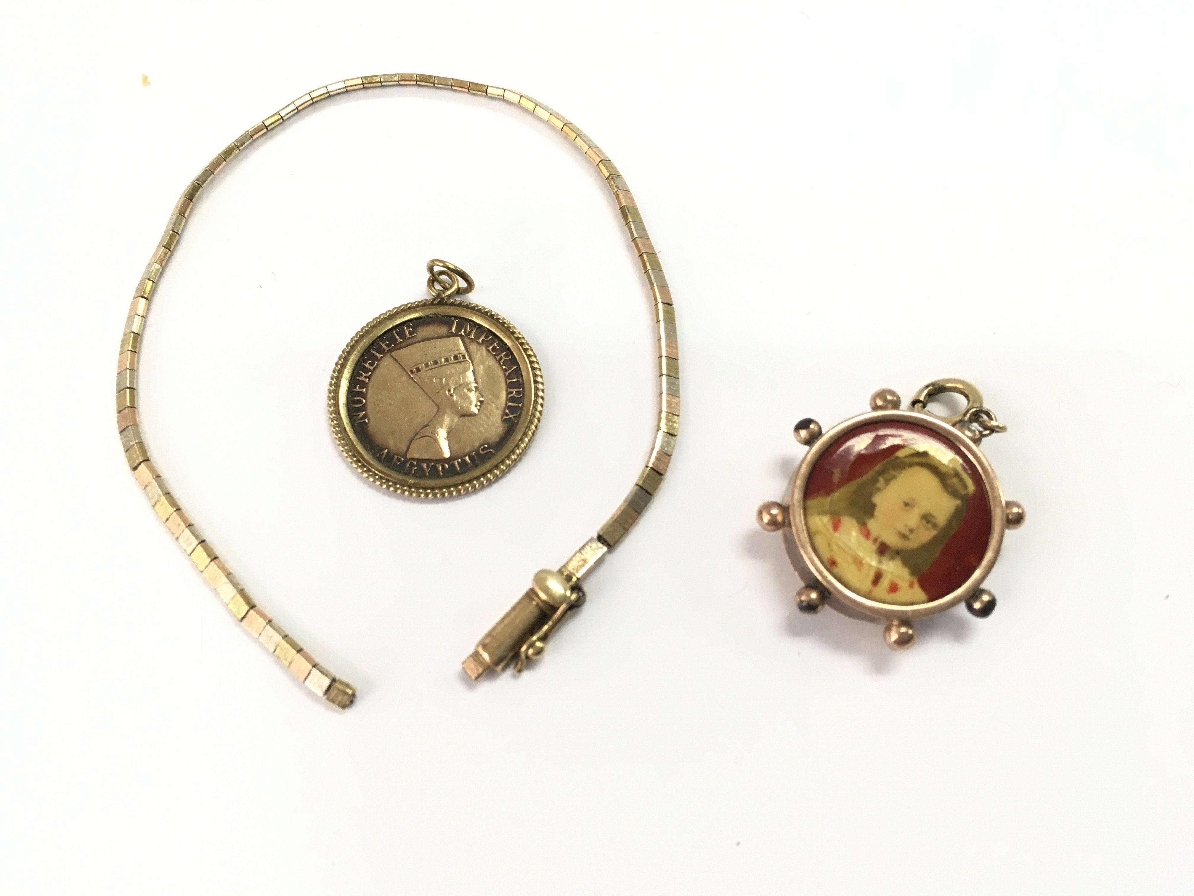 Two gold pendants and a broken gold chain. 14.11g