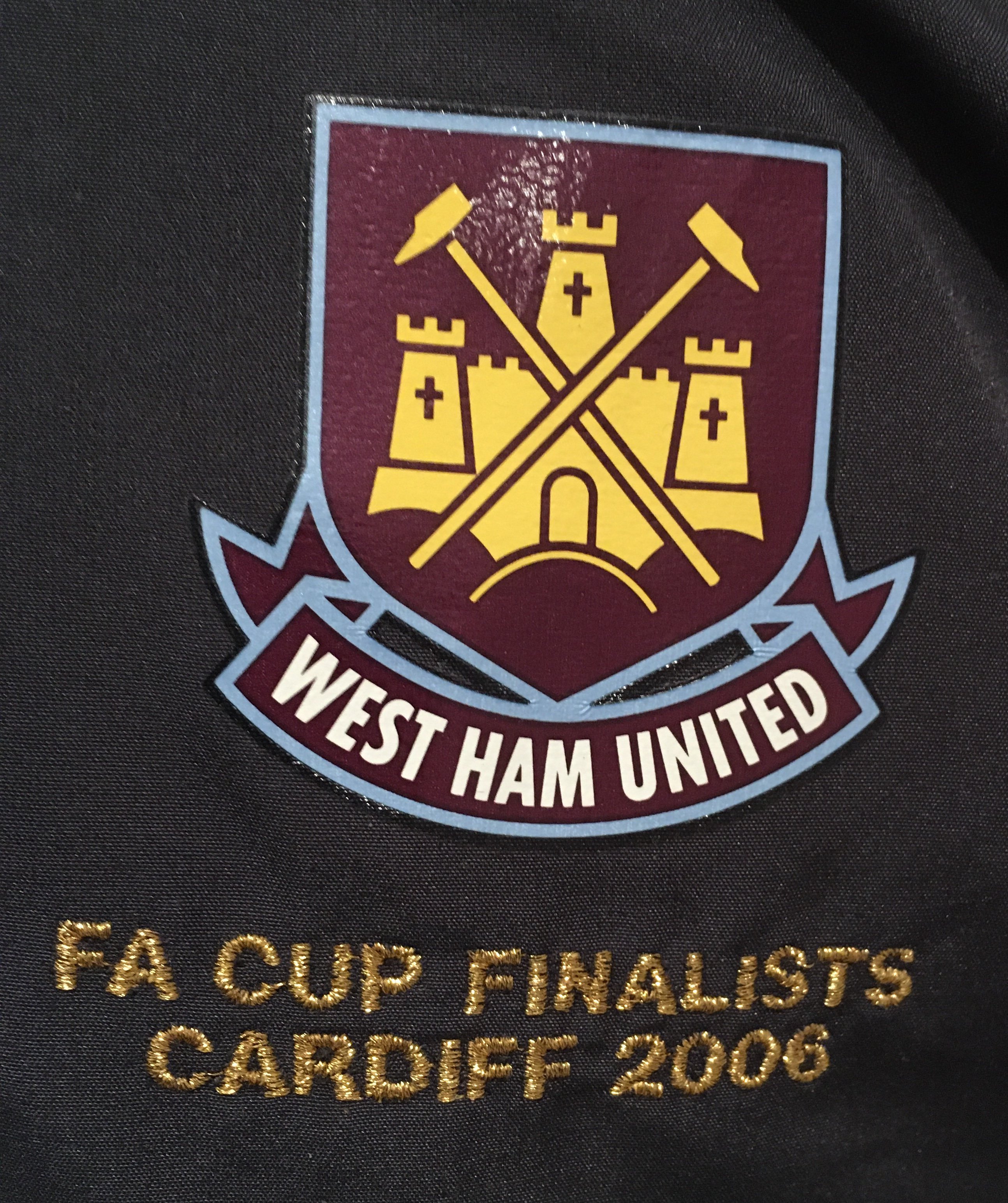 West Ham 2006 FA Cup Final Football Tracksuit: Grey Reebok tracksuit in size XL worn by West Ham coach Roger Cross. Top and bottoms have the old West Ham crest and top has the words FA Cup Finalists Cardiff 2006. Excellent condition and never commercially available.
