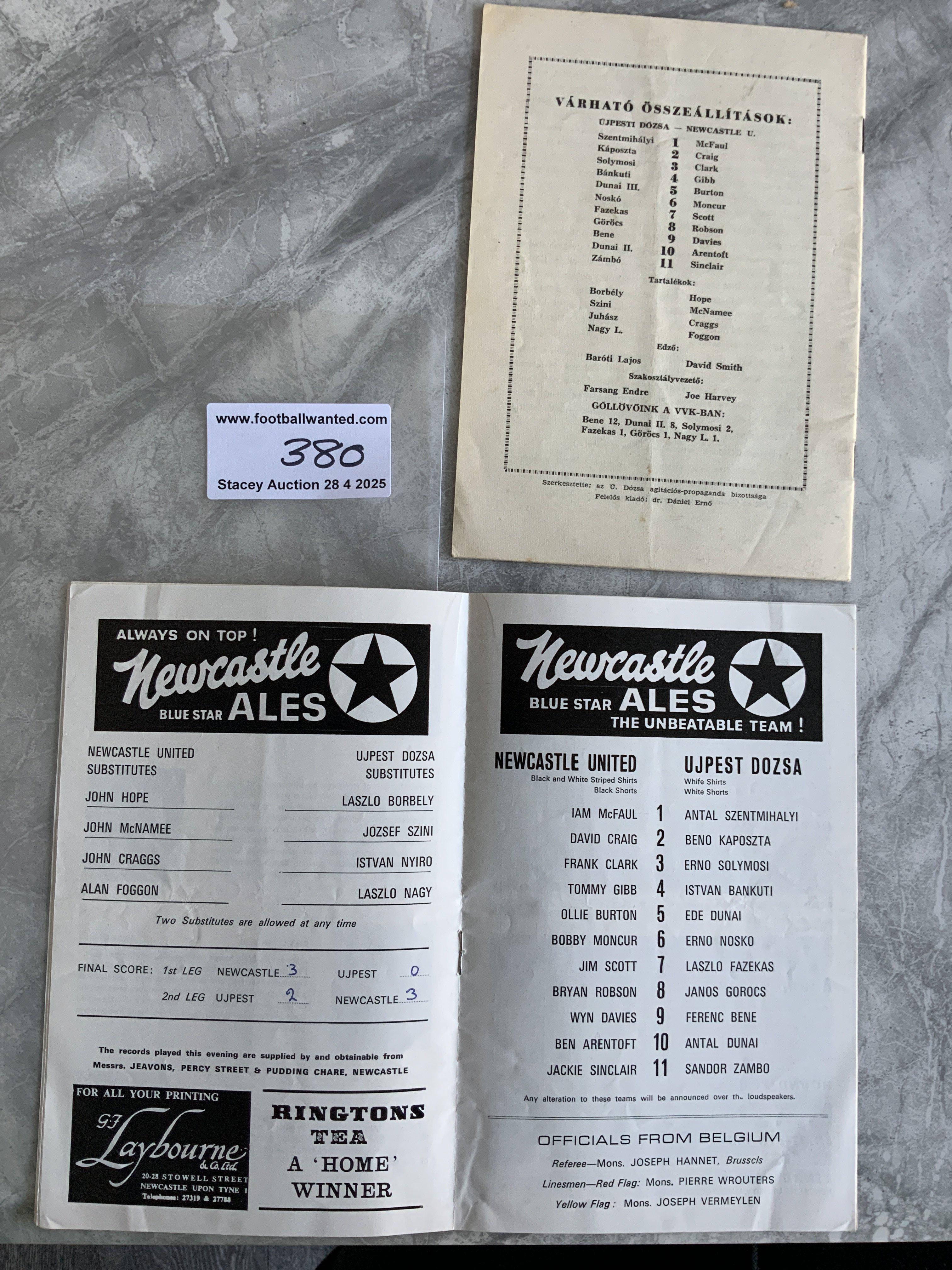 1969 Fairs Cup Final Football Programmes: Both legs of Ujpest Dozsa v Newcastle plus Our Fabulous Fairs Cup and Newcastle United brochures the latter signed to cover by 3 players. Very good. (4)