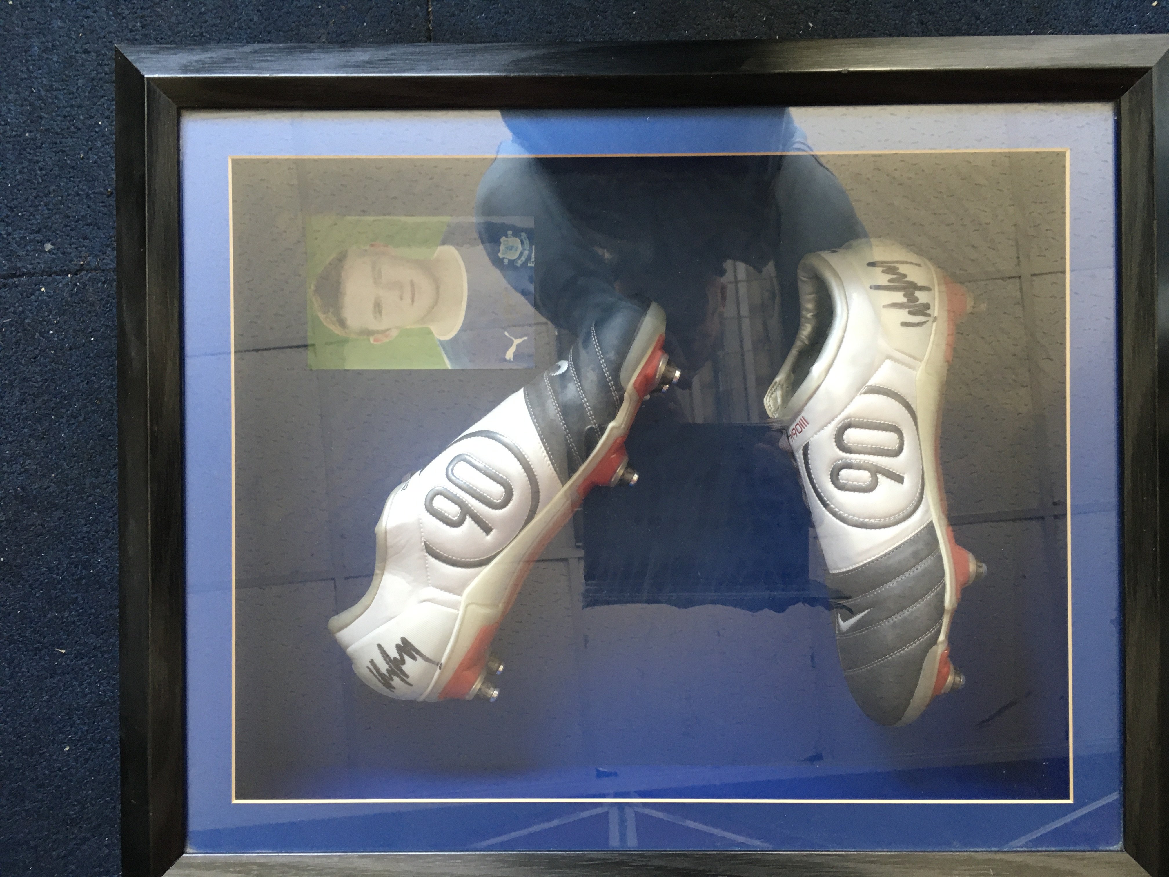 Wayne Rooney Signed Framed Football Boots: Nike 90 boots both hand signed and expensively framed with a picture in the background of Rooney in Everton kit. It is very possible these were worn by him but we did not get this confirmed and there was a period he wore this style when at Everton. The vendor was a contributor to the Everton Former Players Foundation and received these from the club.