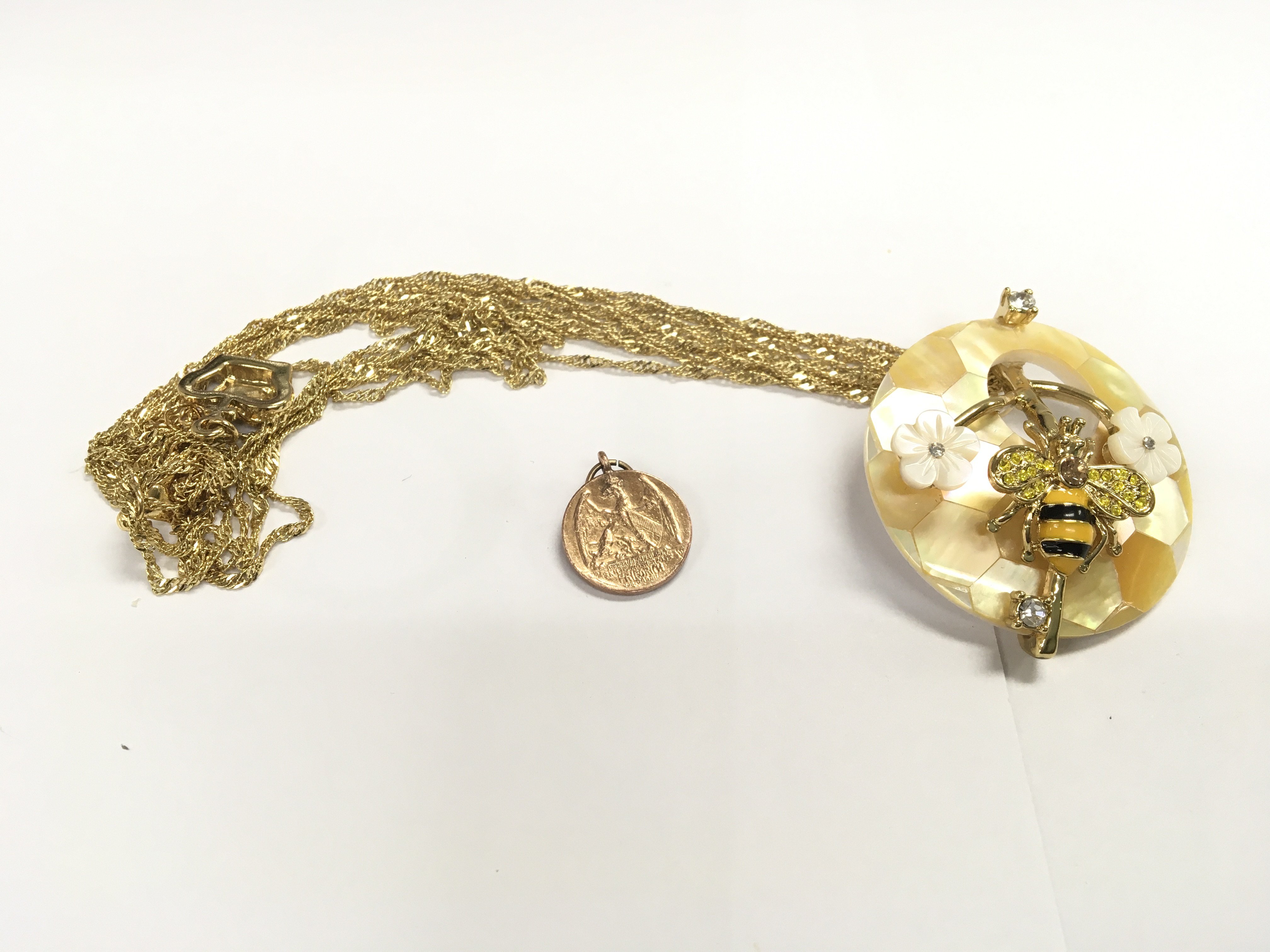 A costume bee and honey comb pendant on chain and a small gold medallion.