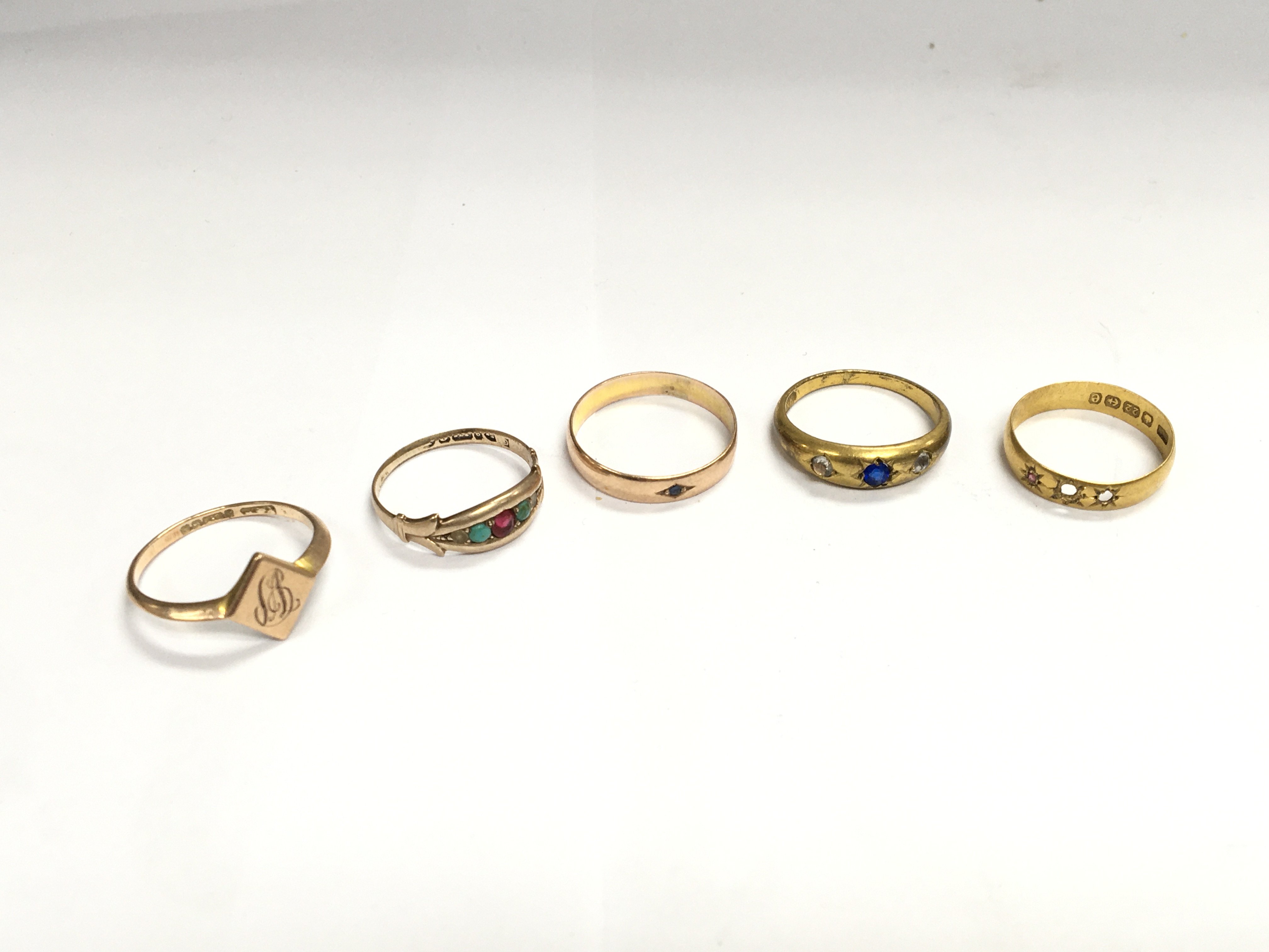 A small collection gold and yellow metal rings. Approx weight 10 grams.