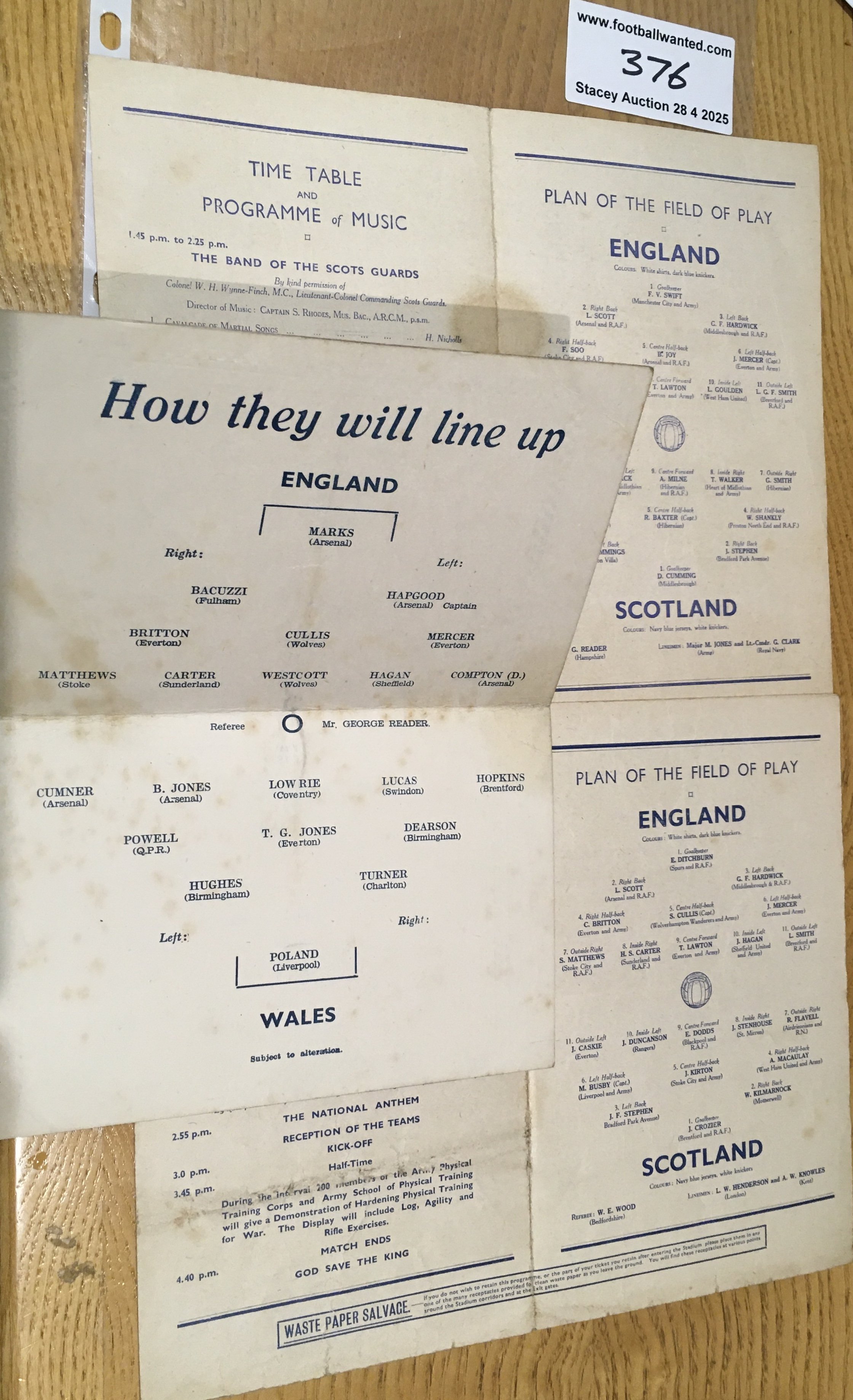 1940s England Home International Football Programmes: 4 page official programmes for matches v Scotland on 19 2 1944 and 14 10 1944. C/W pirate programme for match v Wales on 27 2 1943. Fair/good. (3)