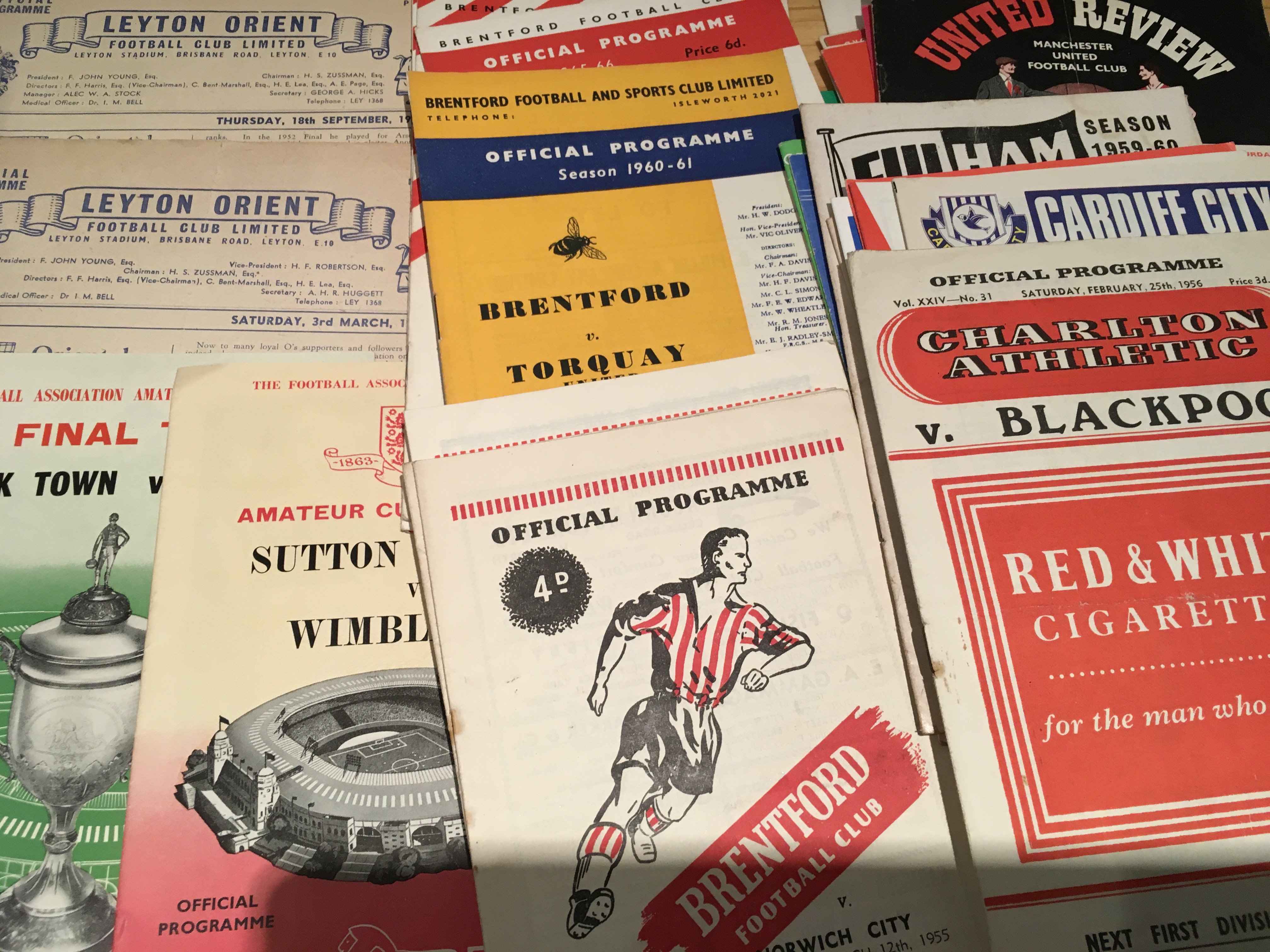 Football Programme Box: Quantity of West Ham homes from 58/59 practise match to the mid 60s. Many other London clubs including Walthamstow Brentford and Orient. Mainly 60s but some earlier to include 50/51 Manchester United v Arsenal. Quantity.