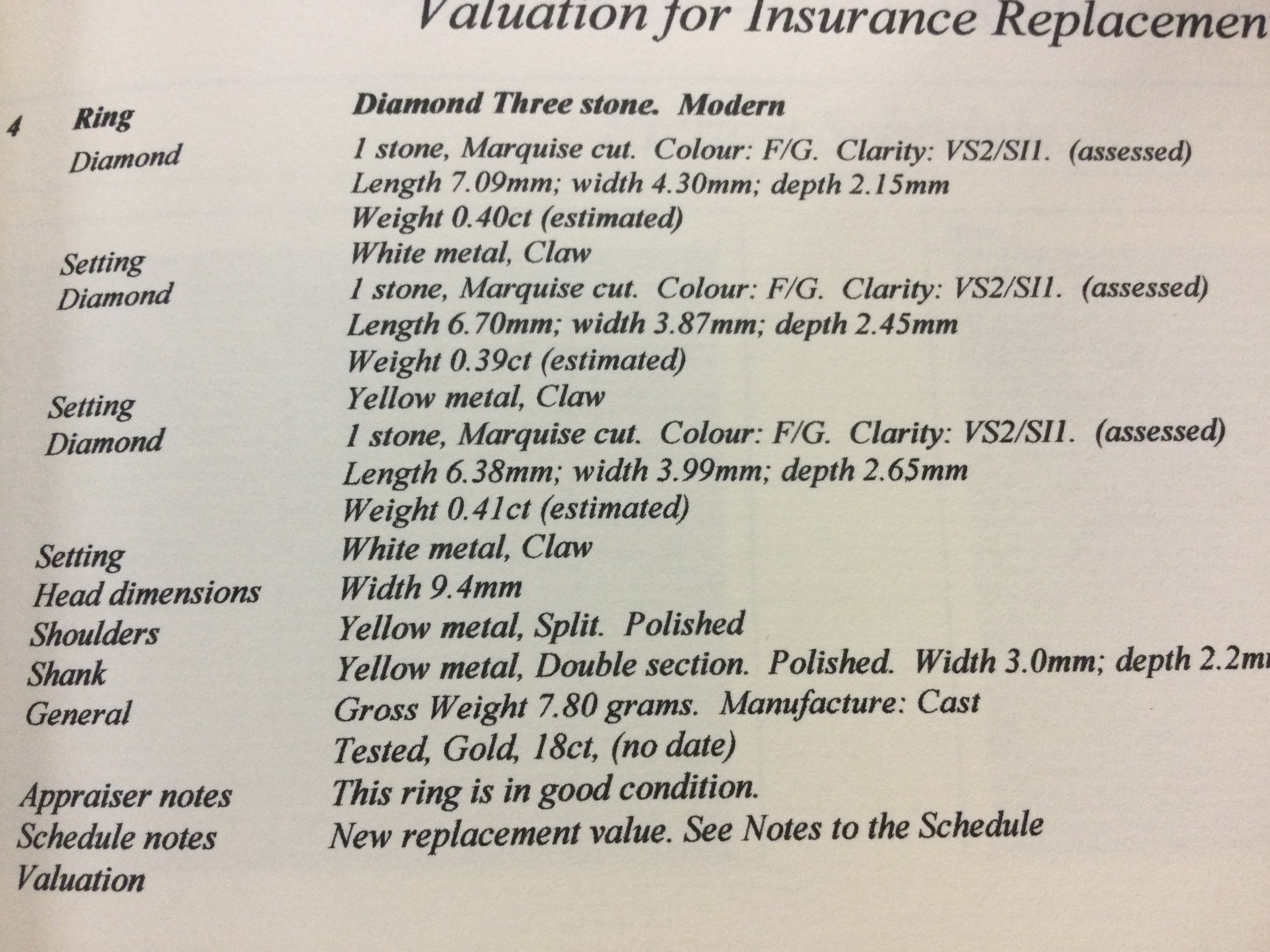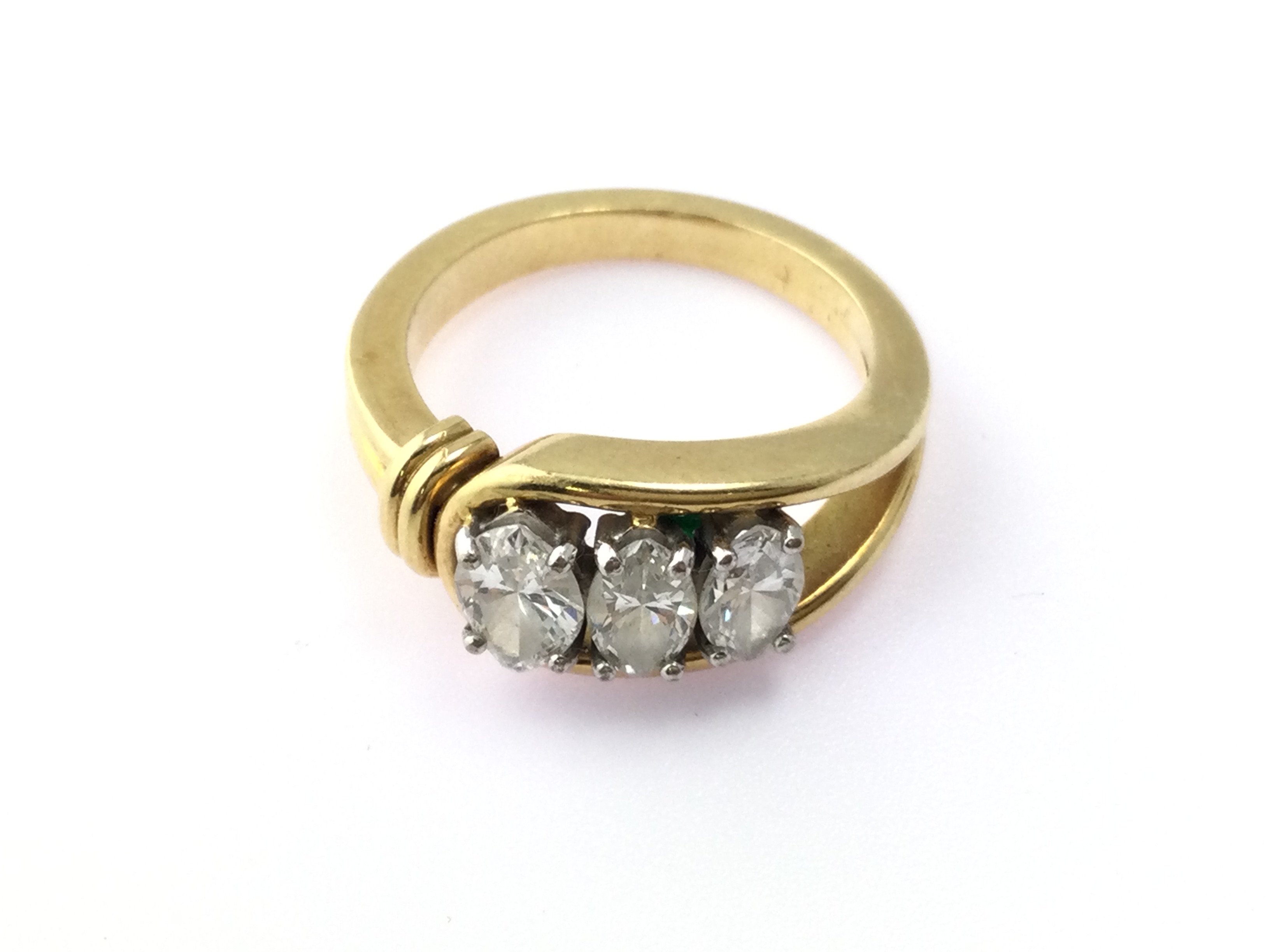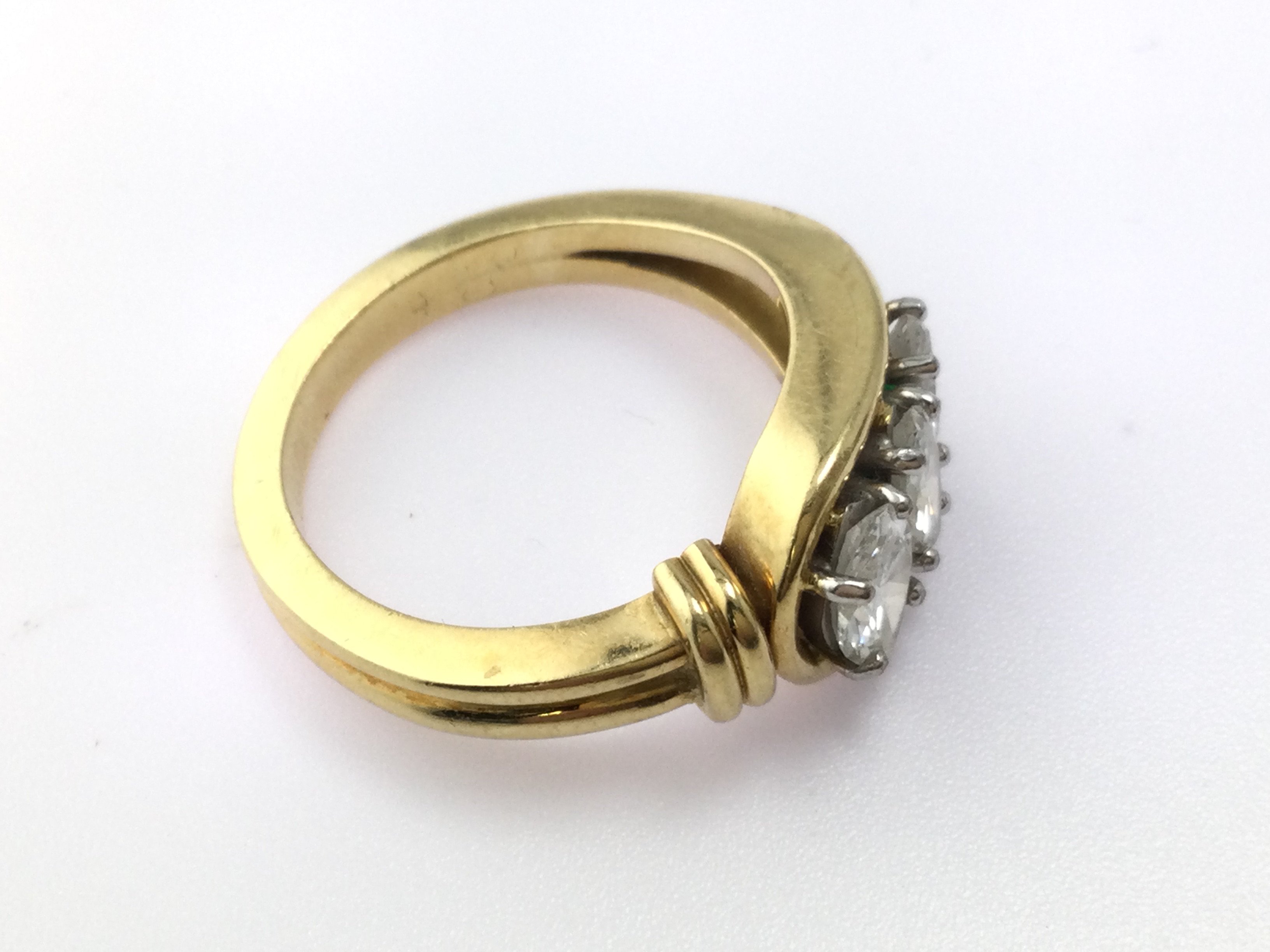 An 18ct gold three diamond set ring. Diamonds are Marquise cut and approximately 1.20ct total. Size N and 7.85g