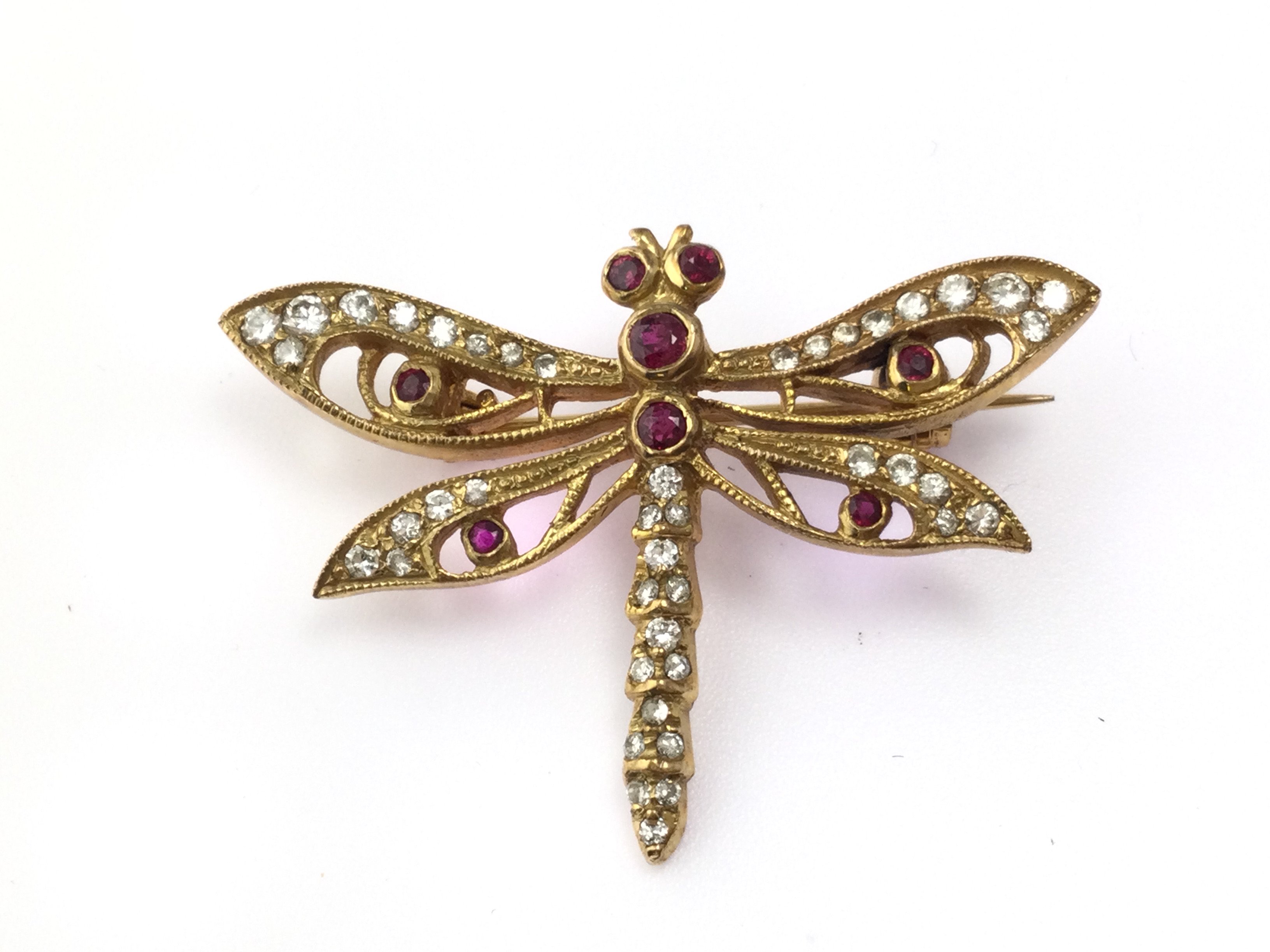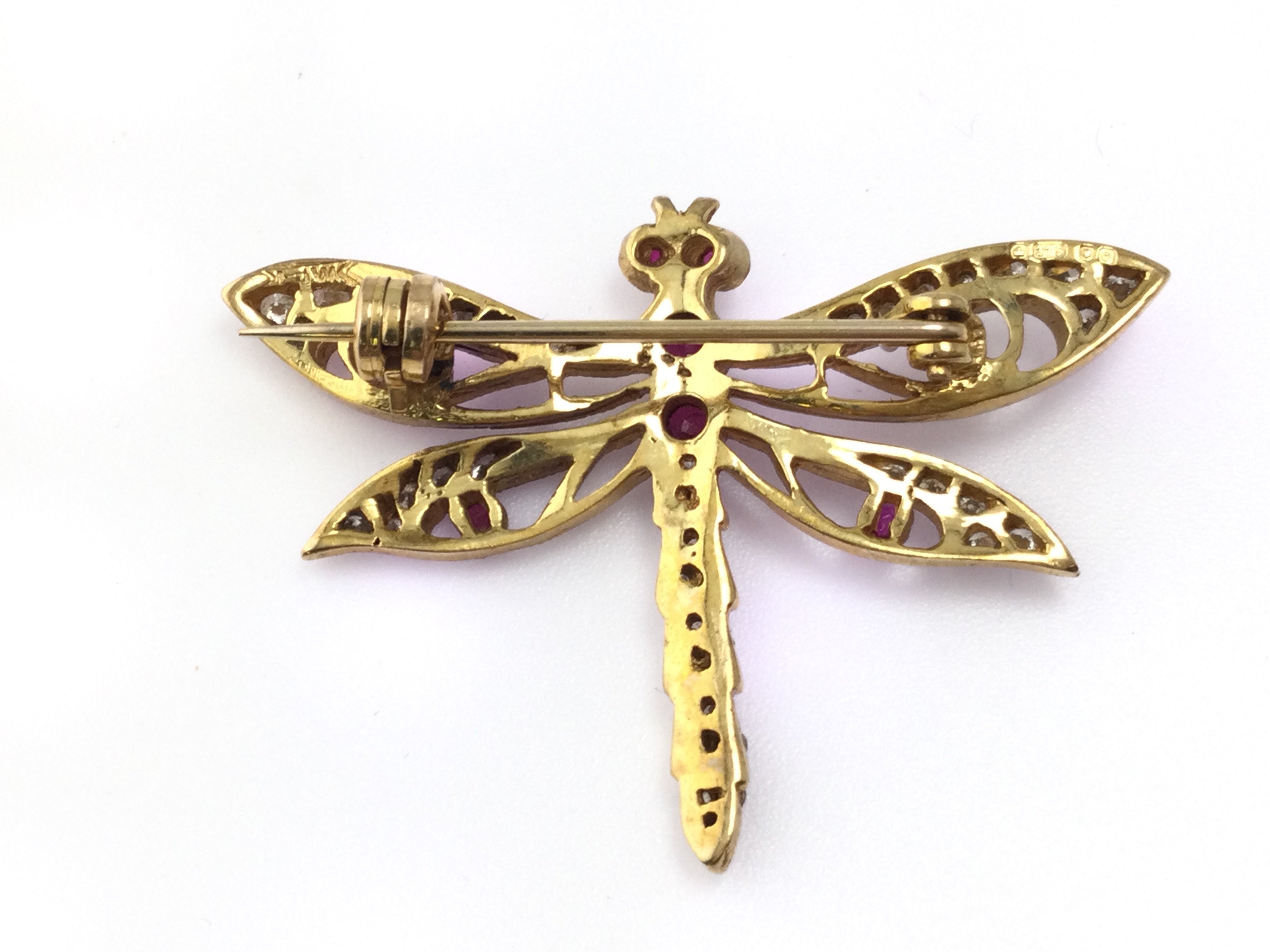 A 9ct gold dragon fly brooch set with diamonds and rubies. 4.91g