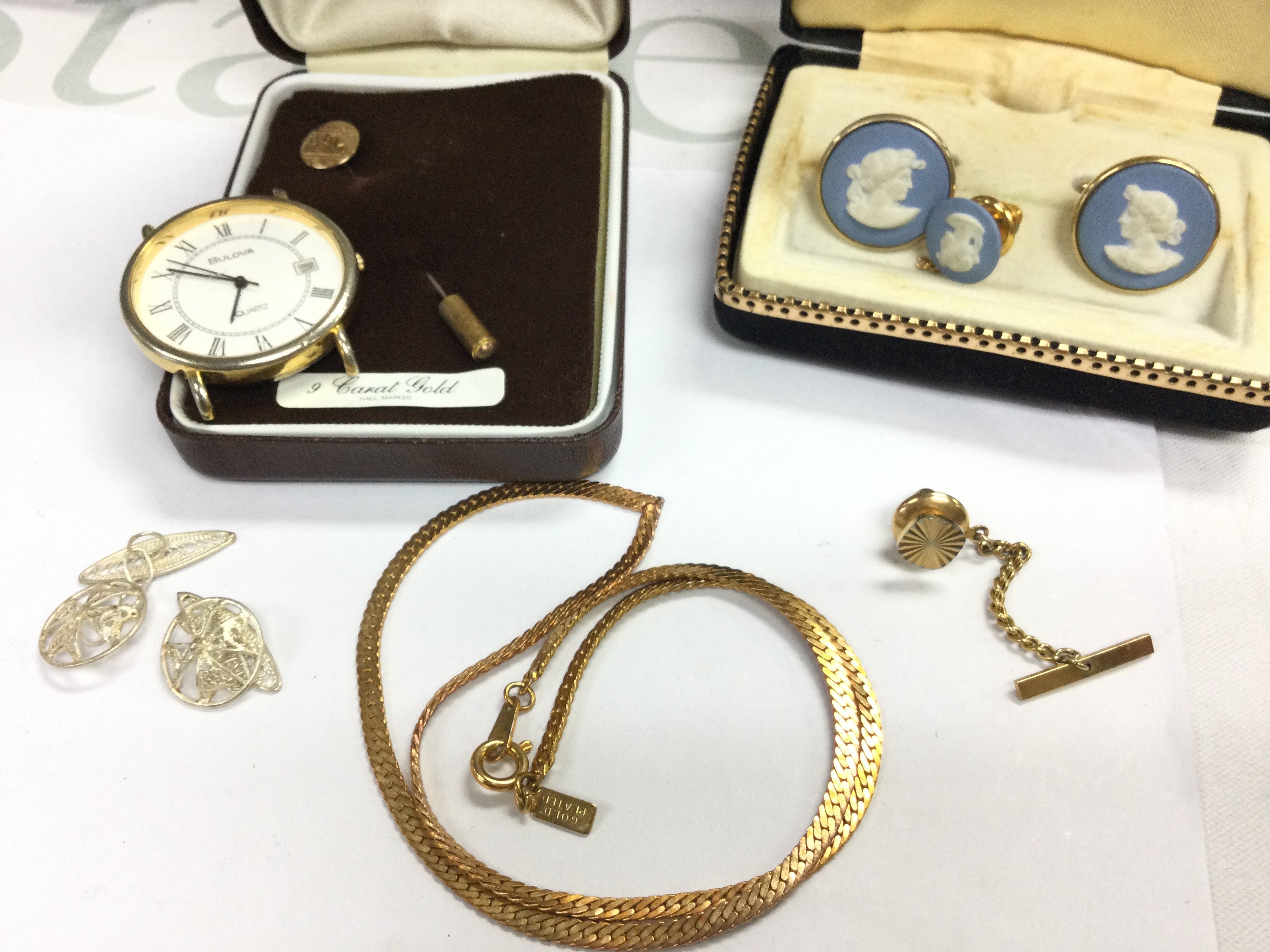 A Gold plated necklace, tie pin , Bulova quartz watch (no strap) ,Wedgwood Stratton cufflinks with original box, 9 carat gold pin, silver Maltese cross earring, Mediana watch. Postage category B NO RESERVE