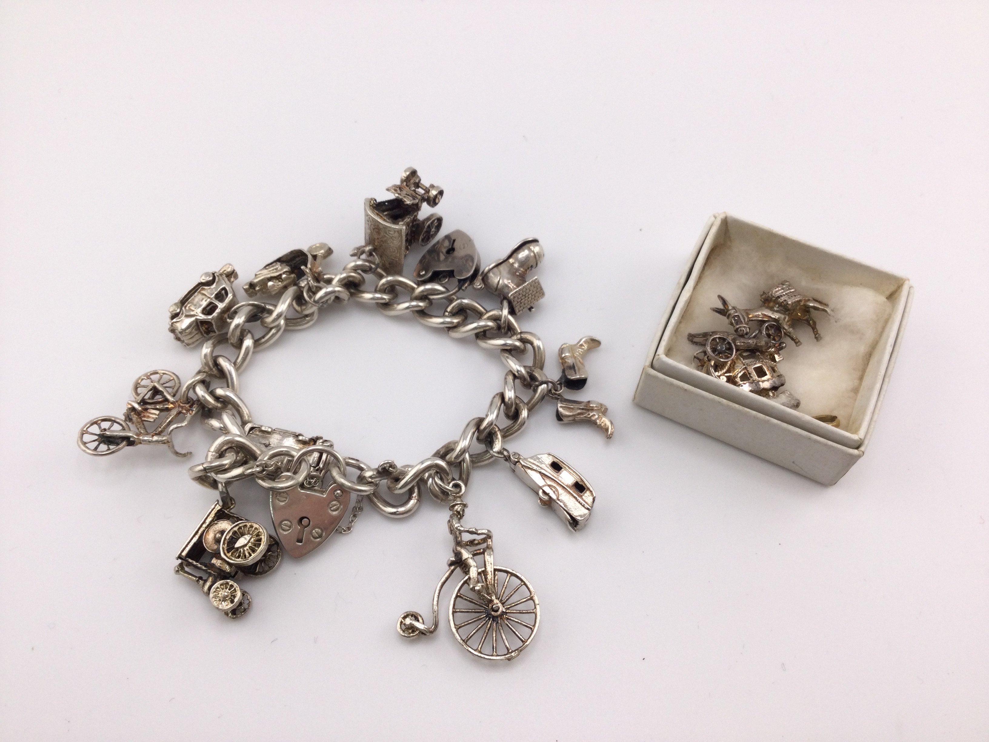 A silver charm bracelet set with multiple charms. Approximately 80g