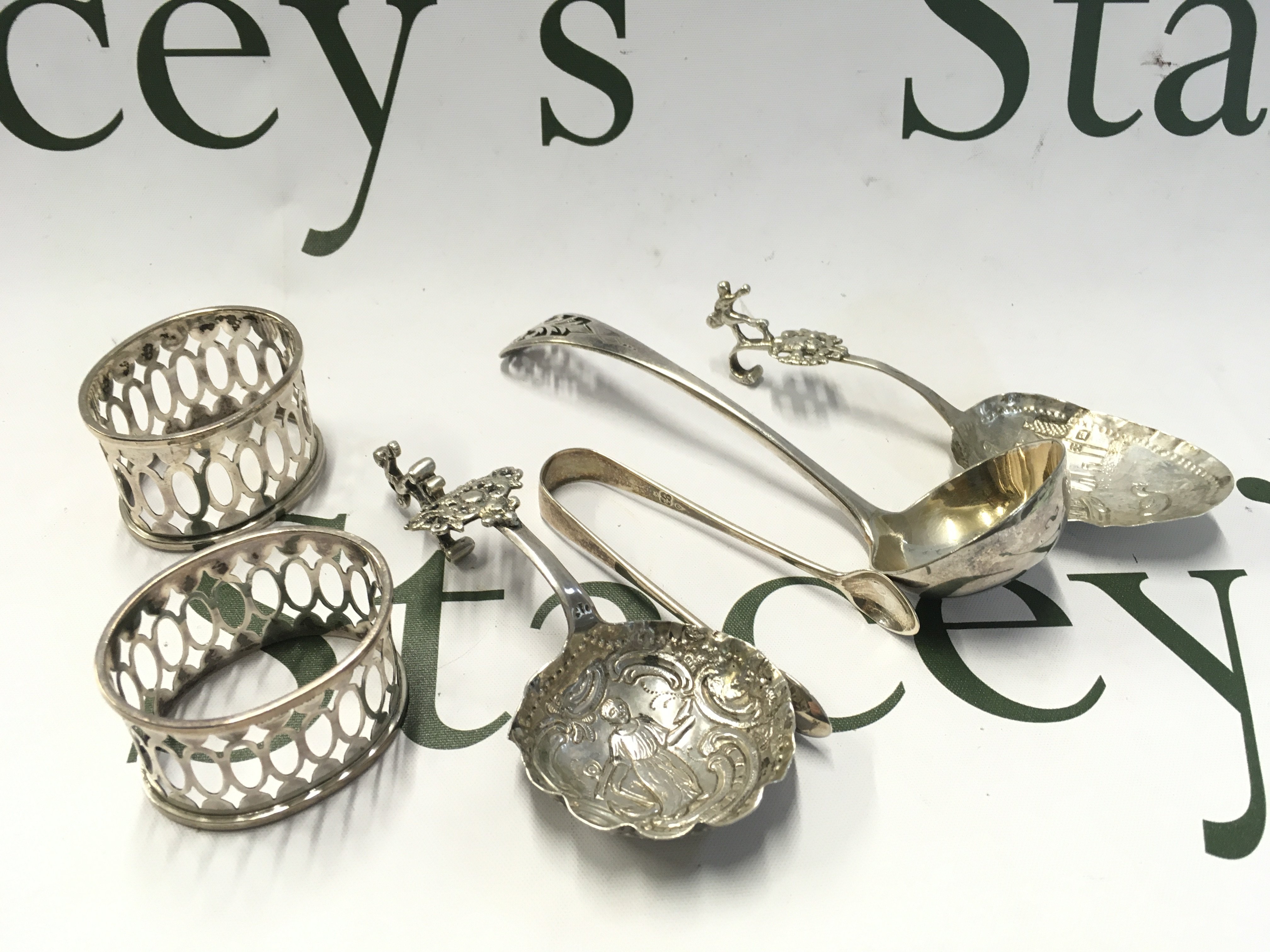 Two Continental silver tea caddy type spoons, a pair of napkin rings , tongs. NO RESERVE
